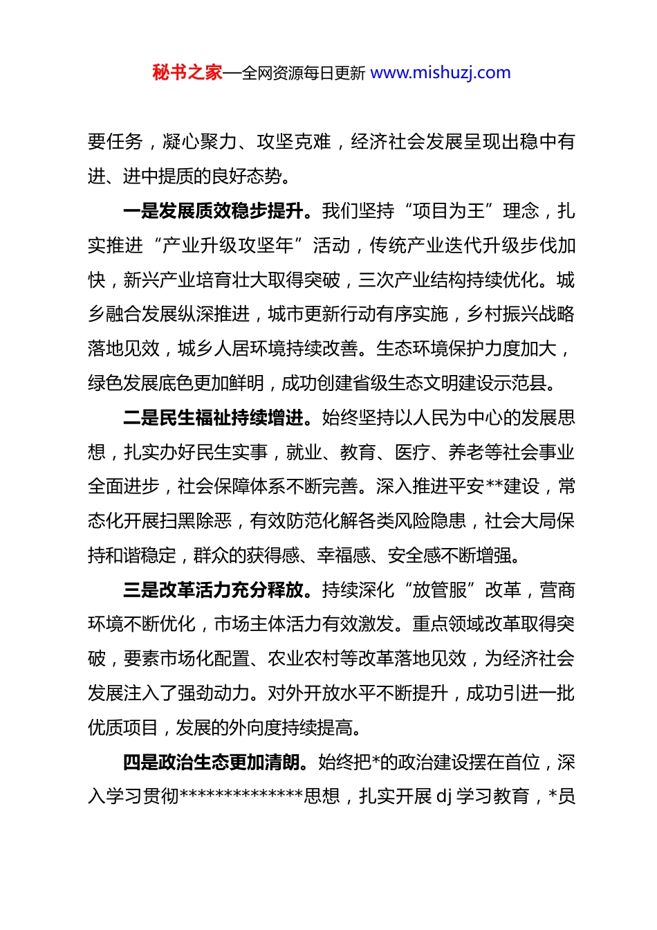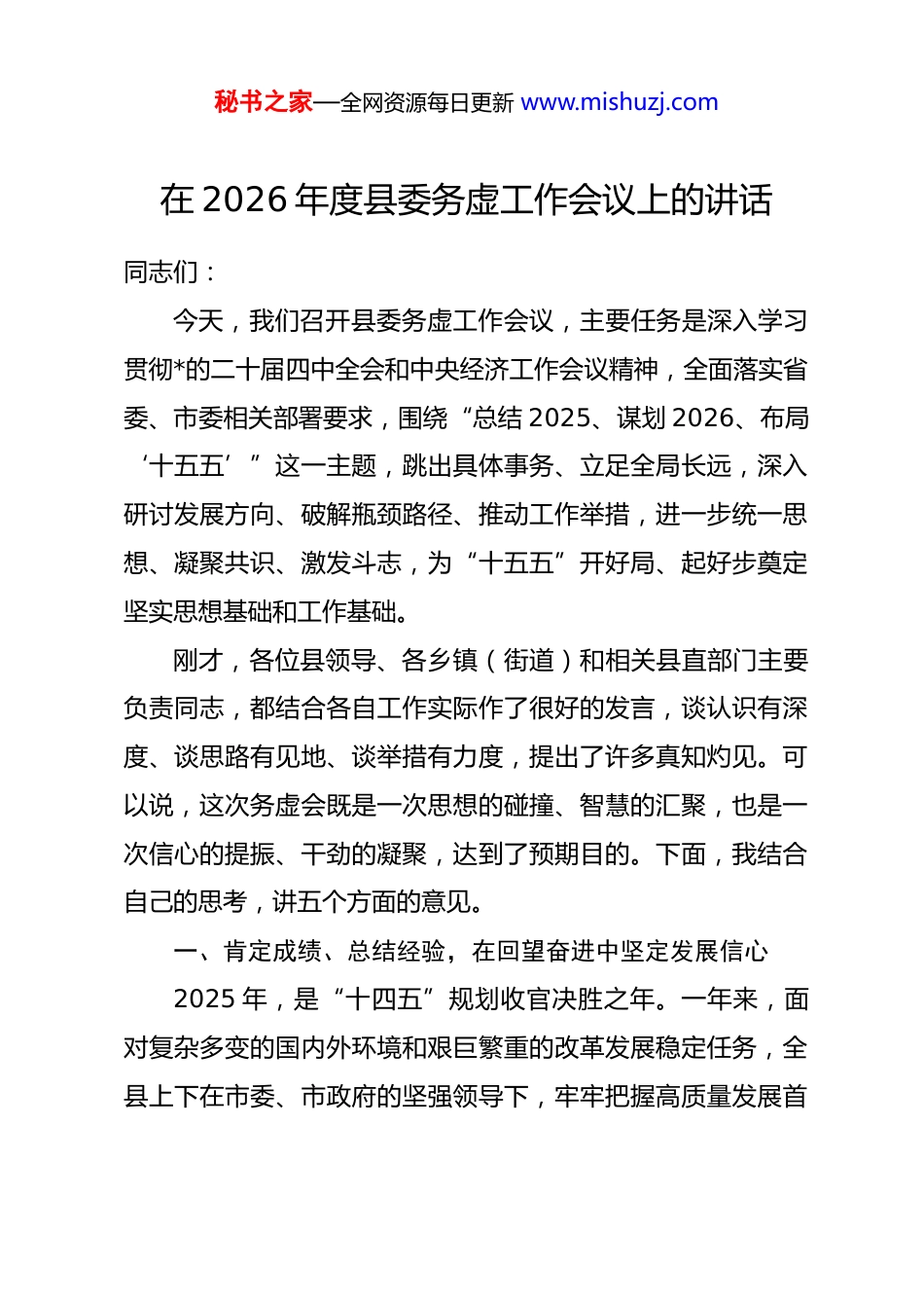 秘书之家—全网资源每日更新 www.mishuzj.com在 2026 年度县委务虚工作会议上的讲话同志们:今天,我们召开县委务虚工作会议,主要任务是深入学习贯彻*的二十届四中全会和中央经济工作会议精神,全面落实省委、市委相关部署要求,围绕“总结 2025、谋划 2026、布局‘十五五’”这一主题,跳出具体事务、立足全局长远,深入研讨发展方向、破解瓶颈路径、推动工作举措,进一步统一思想、凝聚共识、激发斗志,为“十五五”开好局、起好步奠定坚实思想基础和工作基础。刚才,各位县领导、各乡镇(街道)和相关县直部门主要负责同志,都结合各自工作实际作了很好的发言,谈认识有深度、谈思路有见地、谈举措有力度,提出了许多真知灼见。可以说,这次务虚会既是一次思想的碰撞、智慧的汇聚,也是一次信心的提振、干劲的凝聚,达到了预期目的。下面,我结合自己的思考,讲五个方面的意见。一、肯定成绩、总结经验,在回望奋进中坚定发展信心2025 年,是“十四五”规划收官决胜之年。一年来,面对复杂多变的国内外环境和艰巨繁重的改革发展稳定任务,全县上下在市委、市政府的坚强领导下,牢牢把握高质量发展首秘书之家—全网资源每日更新 www.mishuzj.com要任务,凝心聚力、攻坚克难,经济社会发展呈现出稳中有进、进中提质的良好态势。一是发展质效稳步提升。我们坚持“项目为王”理念,扎实推进“产业升级攻坚年”活动,传统产业迭代升级步伐加快,新兴产业培育壮大取得突破,三次产业结构持续优化。城乡融合发展纵深推进,城市更新行动有序实施,乡村振兴战略落地见效,城乡人居环境持续改善。生态环境保护力度加大,绿色发展底色更加鲜明,成功创建省级生态文明建设示范县。二是民生福祉持续增进。始终坚持以人民为中心的发展思想,扎实办好民生实事,就业、教育、医疗、养老等社会事业全面进步,社会保障体系不断完善。深入推进平安**建设,常态化开展扫黑除恶,有效防范化解各类风险隐患,社会大局保持和谐稳定,群众的获得感、幸福感、安全感不断增强。三是改革活力充分释放。持续深化“放管服”改革,营商环境不断优化,市场主体活力有效激发。重点领域改革取得突破,要素市场化配置、农业农村等改革落地见效,为经济社会发展注入了强劲动力。对外开放水平不断提升,成功引进一批优质项目,发展的外向度持续提高。四是政治生态更加清朗。始终把*的政治建设摆在首位,深入学习贯彻**************思想,扎实开展 dj 学习教育,*员秘书之家—全网资源每日更新 www.mishuzj.com干部的政治判断力、政治领悟力、政治执行力不断提升。基层*组织战斗堡垒作用和*员先锋模范作用充分发挥,全面从严治*向纵深推进,风清气正的政治生态持续巩固。这些成绩的取得,是全县上下团结奋斗、顽强拼搏的结果,凝聚着大家的智慧和汗水。在肯定成绩的同时,我们也要清醒认识到,工作中还存在一些短板和不足:比如,产业结构还不够优化,新兴产业占比不高,产业链条不够完善;城乡发展还不够均衡,农村基础设施和公共服务仍有薄弱环节;科技创新能力不足,人才引育留用机制还需完善;部分干部思想解放不够,担当作为、改革创新的劲头还需进一步提升,等等。这些问题,都需要我们在今后的工作中认真加以解决。二、认清形势、把握大局,在精准研判中找准发展方位2026 年是“十五五”规划开局之年,也是全面贯彻落实*的二十届四中全会精神的关键之年。做好明年工作,必须胸怀“国之大者”,立足县域实际,准确把握国内外发展大势,在变局中找准方位、在挑战中抢抓机遇。从宏观形势看,机遇与挑战并存。当前,世界经济正在深度调整中曲折复苏,新一轮科技革命和产业变革蓄势待发,为我们加快转型升级、实现跨越发展提供了难得的历史机遇。从国内看,我国经济长期向好的基本趋势没有改变,中央经济工秘书之家—全网资源每日更新 www.mishuzj.com作会议明确了明年经济工作的总体要求和重点任务,出台了一系列稳增长、促改革、调结构、惠民生、防风险的政策举措,为我们带来了政策红利。同时,我们也要清醒地看到,外部环境的复杂性、严峻性、不确定性上升,国内经济恢复基础尚不牢固,区域竞争日...