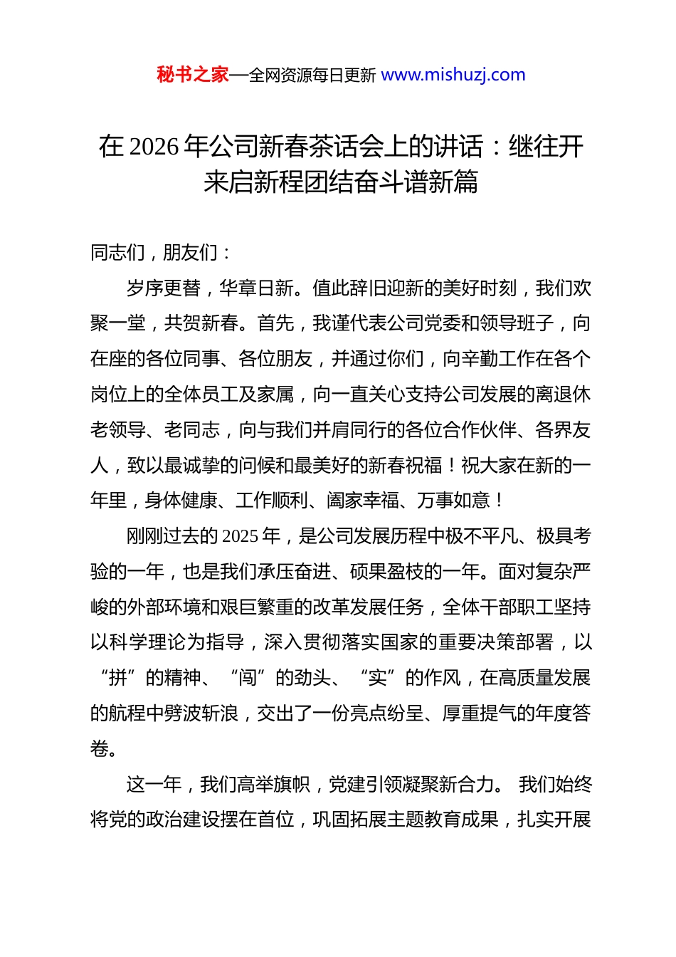 秘书之家—全网资源每日更新 www.mishuzj.com在 2026 年公司新春茶话会上的讲话:继往开来启新程团结奋斗谱新篇 同志们,朋友们:岁序更替,华章日新。值此辞旧迎新的美好时刻,我们欢聚一堂,共贺新春。首先,我谨代表公司党委和领导班子,向在座的各位同事、各位朋友,并通过你们,向辛勤工作在各个岗位上的全体员工及家属,向一直关心支持公司发展的离退休老领导、老同志,向与我们并肩同行的各位合作伙伴、各界友人,致以最诚挚的问候和最美好的新春祝福!祝大家在新的一年里,身体健康、工作顺利、阖家幸福、万事如意!刚刚过去的 2025 年,是公司发展历程中极不平凡、极具考验的一年,也是我们承压奋进、硕果盈枝的一年。面对复杂严峻的外部环境和艰巨繁重的改革发展任务,全体干部职工坚持以科学理论为指导,深入贯彻落实国家的重要决策部署,以“拼”的精神、“闯”的劲头、“实”的作风,在高质量发展的航程中劈波斩浪,交出了一份亮点纷呈、厚重提气的年度答卷。这一年,我们高举旗帜,党建引领凝聚新合力。 我们始终将党的政治建设摆在首位,巩固拓展主题教育成果,扎实开展秘书之家—全网资源每日更新 www.mishuzj.com党纪学习教育,把党的创新理论转化为推动工作的强大动力和实际成效。各级党组织战斗堡垒作用和党员先锋模范作用在改革攻坚一线充分彰显,“根”“魂”优势持续筑牢,风清气正、干事创业的政治生态更加巩固。我们高度重视凝聚各方智慧力量,积极听取包括党外知识分子、业务骨干在内的各方面意见建议,团结奋斗的共同思想基础越发坚实。这一年,我们向新求质,改革发展实现新突破。 我们牢牢把握高质量发展这个首要任务,聚焦主责主业,勇担战略使命。一方面,我们持续深化国企改革,在完善公司治理、优化布局结构、健全市场化经营机制上迈出坚实步伐,发展内生动力有效激发。另一方面,我们坚持以创新驱动发展,在培育和发展新质生产力上精准发力。一批关键核心技术攻关取得重要进展,数字化转型稳步推进,重大工程项目优质履约,公司的产业竞争力、品牌影响力实现了新的跃升。这一年,我们淬炼匠心,基础管理得到新夯实。 我们坚持眼睛向内,苦练内功。全面对标世界一流,强化项目全过程、全要素的精细化管控,着力降本增效,防范化解重大风险,筑牢了安全生产与经营管理的“双防线”。法治央企建设持续深化,合规管理体系更加健全,为公司行稳致远奠定了坚实基础。这一年,我们心手相连,队伍面貌焕发新气象。 公司的每秘书之家—全网资源每日更新 www.mishuzj.com一点进步,都凝聚着每一位员工的汗水与智慧。从科研攻关的前沿到生产建设的一线,从市场开拓的征程到管理服务的后方,处处闪现着大家埋头苦干、默默奉献的身影。我们持续推进“人才强企”战略,优化激励机制,搭建成长平台,一批德才兼备的优秀青年骨干脱颖而出。我们用心用情办好民生实事,努力提升员工的获得感、幸福感、安全感,和谐奋进的企业“家”文化日益浓厚。看似寻常最奇崛,成如容易却艰辛。回顾过去一年走过的路,我们深切体会到,每一项成绩的取得,根本在于科学理论的指引,在于上级党委的坚强领导;关键在于全体干部职工的顽强拼搏、无私奉献;也离不开各位老领导、老同志打下的坚实基础和持续关怀,离不开社会各界朋友的鼎力支持与真诚合作。在此,我代表公司领导班子,向大家表示最衷心的感谢!同志们,朋友们!历史的画卷,总是在砥砺前行中铺展;时代的华章,必将在接续奋斗中书写。2026 年,是国家“十五五”规划的开局之年,也是公司深化改革创新、加快转型升级、实现跨越发展的关键之年。新征程上,机遇与挑战并存,希望与困难同在。我们必须清醒认识到,外部环境的复杂性、严峻性、不确定性依然存在,公司自身在核心竞争力、发展质效、管理效能等方面仍面临提升空间。开局关乎全局,起步决定后秘书之家—全网资源每日更新 www.mishuzj.com程。我们要以“归零”的心态、“赶考”的状态、“奔跑”的姿态,统一思想,凝聚共识,奋力开创公司发展新局面。面向 2026,我们要登高望远,在服务大局中把握战略主动。必须胸怀“国之大者”,自觉将公司发展...