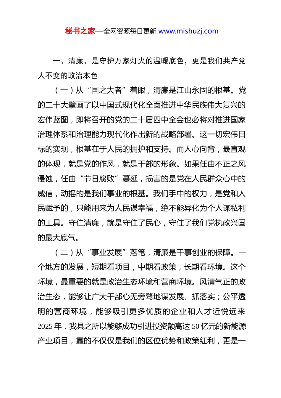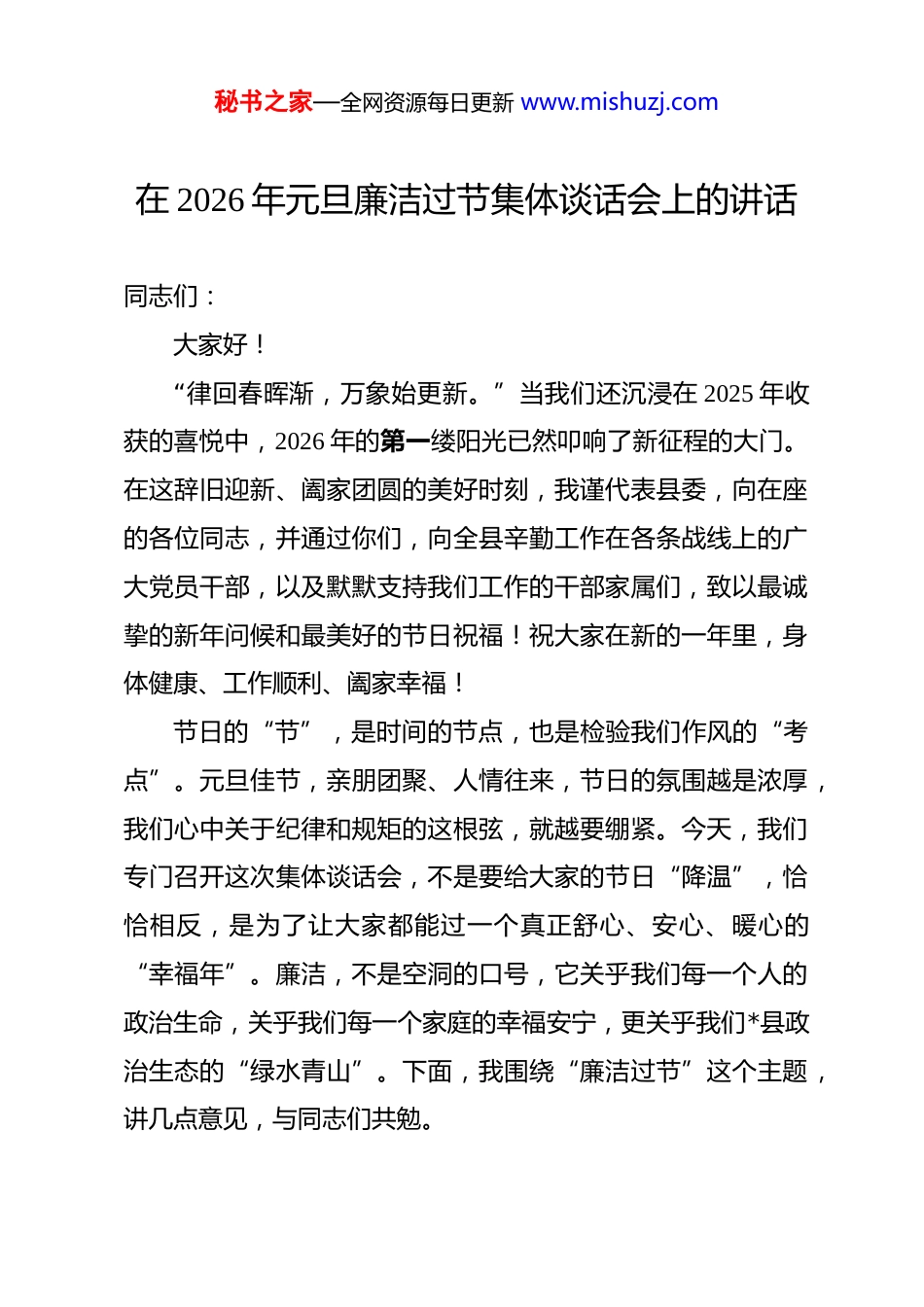 秘书之家—全网资源每日更新 www.mishuzj.com在 2026 年元旦廉洁过节集体谈话会上的讲话 同志们:大家好!“律回春晖渐,万象始更新。”当我们还沉浸在 2025 年收获的喜悦中,2026 年的第一缕阳光已然叩响了新征程的大门。在这辞旧迎新、阖家团圆的美好时刻,我谨代表县委,向在座的各位同志,并通过你们,向全县辛勤工作在各条战线上的广大党员干部,以及默默支持我们工作的干部家属们,致以最诚挚的新年问候和最美好的节日祝福!祝大家在新的一年里,身体健康、工作顺利、阖家幸福!节日的“节”,是时间的节点,也是检验我们作风的“考点”。元旦佳节,亲朋团聚、人情往来,节日的氛围越是浓厚,我们心中关于纪律和规矩的这根弦,就越要绷紧。今天,我们专门召开这次集体谈话会,不是要给大家的节日“降温”,恰恰相反,是为了让大家都能过一个真正舒心、安心、暖心的“幸福年”。廉洁,不是空洞的口号,它关乎我们每一个人的政治生命,关乎我们每一个家庭的幸福安宁,更关乎我们*县政治生态的“绿水青山”。下面,我围绕“廉洁过节”这个主题,讲几点意见,与同志们共勉。秘书之家—全网资源每日更新 www.mishuzj.com一、清廉,是守护万家灯火的温暖底色,更是我们共产党人不变的政治本色(一)从“国之大者”着眼,清廉是江山永固的根基。党的二十大擘画了以中国式现代化全面推进中华民族伟大复兴的宏伟蓝图,即将召开的党的二十届四中全会也必将对推进国家治理体系和治理能力现代化作出新的战略部署。这一切宏伟目标的实现,根基在于人民的拥护和支持。而人心向背,最直观的体现,就是党的作风,就是干部的形象。如果任由不正之风侵蚀,任由“节日腐败”蔓延,损害的是党在人民群众心中的威信,动摇的是我们事业的根基。我们手中的权力,是党和人民赋予的,只能用来为人民谋幸福,绝不能异化为个人谋私利的工具。守住清廉,就是守住了民心,守住了我们党执政兴国的最大底气。(二)从“事业发展”落笔,清廉是干事创业的保障。一个地方的发展,短期看项目,中期看政策,长期看环境。这个环境,最重要的就是政治生态环境和营商环境。风清气正的政治生态,能够让广大干部心无旁骛地谋发展、抓落实;公平透明的营商环境,能够吸引更多优质的企业和人才近悦远来2025 年,我县之所以能够成功引进投资额高达 50 亿元的新能源产业项目,靠的不仅仅是我们的区位优势和政策红利,更是一秘书之家—全网资源每日更新 www.mishuzj.com位企业家在考察后对我们说的,“在*县办事,不用找关系,一切按规矩来,我们心里踏实”。这句话,就是对我们清廉环境的最高褒奖。反之,如果“吃拿卡要”盛行,“人情关系”通天,干部整天琢磨的是如何“变现”权力,企业家整天思考的是如何“勾兑”关系,那么再好的蓝图也只会是镜花水月。因此,清廉不仅是“软实力”,更是推动高质量发展的“硬支撑”。(三)从“家庭港湾”体察,清廉是幸福安康的防线。家是最小国,国是千万家。我们每一名干部,既是“国家人”,也是“家庭人”。一个幸福的家庭,需要的不是一时的高消费、不是来源不明的财富,而是长长久久的平安和安宁。古人说,“廉者,民之表也;贪者,民之贼也。”一旦踩了红线、破了底线,失去的将不仅仅是自己的前途和自由,更会给父母妻儿带来无法弥补的伤害和难以洗刷的耻辱。一封悔过书,字字是血泪,背后就是一个破碎的家庭。算好“政治账、经济账、家庭账”,我们就会发现,清廉才是最划算的“投资”,平安才是最珍贵的“财富”。过节了,给家人最好的礼物,不是一沓厚厚的红包,而是一份清清白白、可以让他们引以为傲的履历,一句“我在岗位上尽职尽责,请你们放心”的承诺。二、慎独,于细微之处筑牢思想堤坝,在人情往来中守住秘书之家—全网资源每日更新 www.mishuzj.com纪律红线一是要常怀“敬畏之心”,在权力面前保持清醒。权力是一把“双刃剑”,为民则利,为己则害。我们必须时刻牢记,手中的权力来自人民、属于人民,必须对党纪国法、对人民群众、对我们肩负的职责怀有深深的敬畏。这种敬畏,体现在独处之时,能够“如临深渊,如履薄冰”;体现在用权之际,能够严...