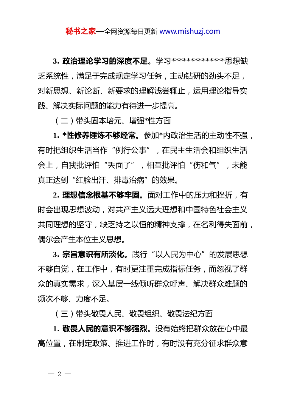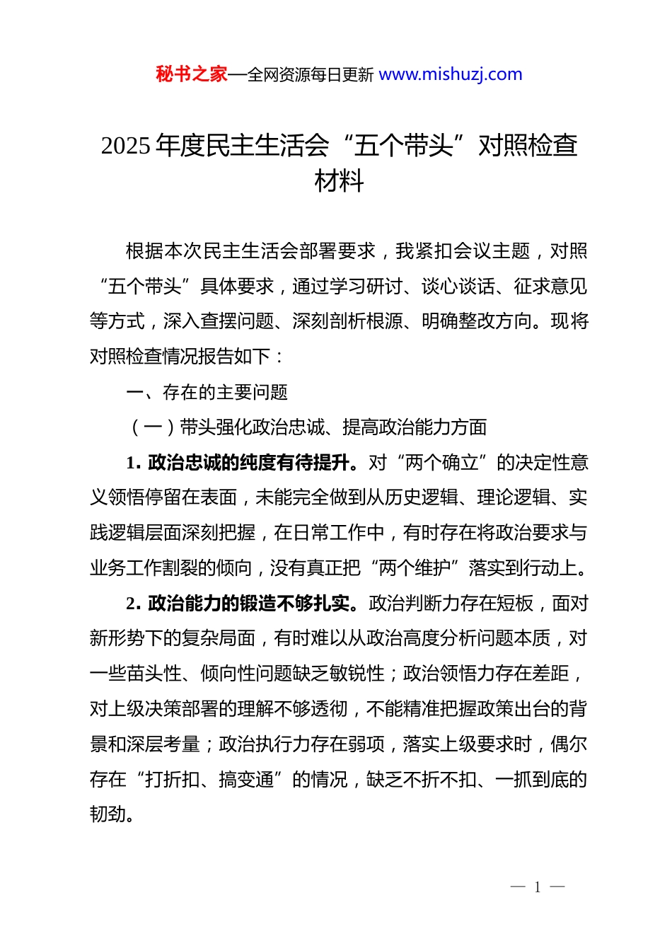 秘书之家—全网资源每日更新 www.mishuzj.com2025 年度民主生活会“五个带头”对照检查材料根据本次民主生活会部署要求,我紧扣会议主题,对照“五个带头”具体要求,通过学习研讨、谈心谈话、征求意见等方式,深入查摆问题、深刻剖析根源、明确整改方向。现将对照检查情况报告如下:一、存在的主要问题(一)带头强化政治忠诚、提高政治能力方面1. 政治忠诚的纯度有待提升。对“两个确立”的决定性意义领悟停留在表面,未能完全做到从历史逻辑、理论逻辑、实践逻辑层面深刻把握,在日常工作中,有时存在将政治要求与业务工作割裂的倾向,没有真正把“两个维护”落实到行动上。2. 政治能力的锻造不够扎实。政治判断力存在短板,面对新形势下的复杂局面,有时难以从政治高度分析问题本质,对一些苗头性、倾向性问题缺乏敏锐性;政治领悟力存在差距,对上级决策部署的理解不够透彻,不能精准把握政策出台的背景和深层考量;政治执行力存在弱项,落实上级要求时,偶尔存在“打折扣、搞变通”的情况,缺乏不折不扣、一抓到底的韧劲。— 1 —秘书之家—全网资源每日更新 www.mishuzj.com3. 政治理论学习的深度不足。学习**************思想缺乏系统性,满足于完成规定学习任务,主动钻研的劲头不足,对新思想、新论断、新要求的理解浅尝辄止,运用理论指导实践、解决实际问题的能力有待进一步提高。(二)带头固本培元、增强*性方面1. *性修养锤炼不够经常。参加*内政治生活的主动性不强,有时把组织生活当作“例行公事”,在民主生活会和组织生活会上,自我批评怕“丢面子”,相互批评怕“伤和气”,未能真正达到“红脸出汗、排毒治病”的效果。2. 理想信念根基不够牢固。面对工作中的压力和挫折,有时会出现思想波动,对共产主义远大理想和中国特色社会主义共同理想的坚守,缺乏持之以恒的精神支撑,在名利得失面前,偶尔会产生本位主义思想。3. 宗旨意识有所淡化。践行“以人民为中心”的发展思想不够自觉,在工作中,有时更注重完成指标任务,而忽视了群众的真实需求,深入基层一线倾听群众呼声、解决群众难题的频次不够、力度不足。(三)带头敬畏人民、敬畏组织、敬畏法纪方面1. 敬畏人民的意识不够强烈。没有始终把群众放在心中最高位置,在制定政策、推进工作时,有时没有充分征求群众意— 2 —秘书之家—全网资源每日更新 www.mishuzj.com见,存在“闭门造车”的情况,对群众反映的问题,有时存在推诿扯皮、敷衍塞责的现象,未能做到事事有回音、件件有着落。2. 敬畏组织的觉悟有待提高。对组织的决策部署,有时存在选择性执行的问题,对自己有利的就积极落实,对自己不利的就消极应付;在个人事项报告等工作中,虽然能够按要求填报,但有时存在避重就轻、不够详实的情况,缺乏对组织的绝对坦诚。3. 敬畏法纪的底线不够紧绷。能够遵守 dj 国法,但在一些小事小节上自我要求有所放松,认为“不触碰红线就行”,对一些不良风气和行为,缺乏坚决抵制的勇气;对分管领域的纪律教育抓得不够紧,存在“重业务、轻纪律”的倾向,监督提醒不够及时到位。(四)带头干事创业、担当作为方面1. 担当精神有所欠缺。面对改革发展中的硬骨头和历史遗留问题,存在畏难情绪,缺乏“啃硬骨头”的勇气和决心,有时习惯于“等、靠、要”,主动出击、攻坚克难的劲头不足;在面对新任务、新挑战时,存在“多做多错、少做少错”的消极心态,缺乏先行先试的魄力。2. 工作作风不够扎实。工作中存在重部署、轻落实的现象,— 3 —秘书之家—全网资源每日更新 www.mishuzj.com对一些重点工作,虽然制定了方案和计划,但后续跟踪问效不够有力,缺乏闭环管理思维,导致部分工作流于形式;调查研究存在“走马观花”的问题,深入基层、深入群众不够,掌握的情况不够全面、不够精准。3. 创新能力亟待提升。习惯于按部就班、循规蹈矩开展工作,思维方式固化,缺乏创新意识和开拓精神,面对新业态、新模式,学习研究不够深入,运用新理念、新方法解决实际问题的能力不足,导致工作亮点不多、成效不显著。(五)坚决扛起管*治*责任方面1. 主体责任落实不够到位。对管*治*的重要性认识不...