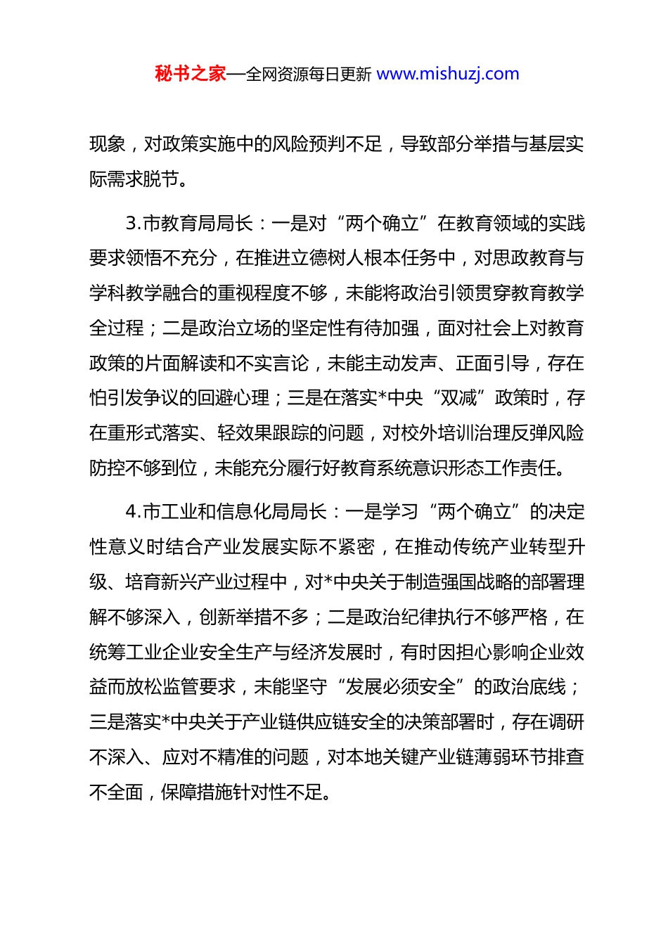 秘书之家—全网资源每日更新 www.mishuzj.com强化政治忠诚、提高政治能力方面问题学习资料1.市政府办公室主任:一是对“两个确立”的决定性意义领悟不够透彻,学习时多停留在理论表述层面,未能紧密结合政府办统筹协调、服务保障的核心职能,思考如何将领悟成果转化为推动政令畅通的具体举措;二是政治敏锐性不足,在审核公文、筹备会议过程中,对部分文稿中隐含的与*中央大政方针衔接不紧密的表述察觉不及时,缺乏主动纠偏的政治自觉;三是落实“两个维护”的执行力存在温差,在推动跨部门政策落地协调时,有时因顾及部门利益平衡而降低执行标准,未能始终以*中央要求为最高遵循。2.市发展和改革委员会主任:一是在学习贯彻***经济思想时,对“两个确立”与推动高质量发展的内在逻辑把握不深,在谋划本地产业布局、重大项目审批时,存在重经济指标、轻政治引领的倾向;二是政治大局意识不够强,在落实国家区域协调发展战略时,过度关注本地短期效益,对跨区域协同发展任务推进不够积极,未能完全站在全国全省大局谋划工作;三是贯彻*中央关于稳增长、稳就业决策部署时,存在简单化执行秘书之家—全网资源每日更新 www.mishuzj.com现象,对政策实施中的风险预判不足,导致部分举措与基层实际需求脱节。3.市教育局局长:一是对“两个确立”在教育领域的实践要求领悟不充分,在推进立德树人根本任务中,对思政教育与学科教学融合的重视程度不够,未能将政治引领贯穿教育教学全过程;二是政治立场的坚定性有待加强,面对社会上对教育政策的片面解读和不实言论,未能主动发声、正面引导,存在怕引发争议的回避心理;三是在落实*中央“双减”政策时,存在重形式落实、轻效果跟踪的问题,对校外培训治理反弹风险防控不够到位,未能充分履行好教育系统意识形态工作责任。4.市工业和信息化局局长:一是学习“两个确立”的决定性意义时结合产业发展实际不紧密,在推动传统产业转型升级、培育新兴产业过程中,对*中央关于制造强国战略的部署理解不够深入,创新举措不多;二是政治纪律执行不够严格,在统筹工业企业安全生产与经济发展时,有时因担心影响企业效益而放松监管要求,未能坚守“发展必须安全”的政治底线;三是落实*中央关于产业链供应链安全的决策部署时,存在调研不深入、应对不精准的问题,对本地关键产业链薄弱环节排查不全面,保障措施针对性不足。秘书之家—全网资源每日更新 www.mishuzj.com5.市公安局副局长:一是对“两个确立”与维护国家安全和社会稳定的极端重要性认识不够深刻,在推进扫黑除恶常态化工作中,政治站位不够高,对涉黑涉恶线索排查的深度和广度不足;二是政治敏锐性有待提升,对网络空间中涉及公共安全的不良信息监测预警不及时,应对处置的主动性、前瞻性不够;三是在落实*中央关于全面从严管*治警要求时,存在“老好人”思想,对分管部门少数民警的纪律松懈问题批评教育多、严肃处理少,未能充分彰显政治纪律的刚性约束。6.市民政局局长:一是对“两个确立”在民生保障领域的指导意义领悟不深,在推进养老服务、社会救助等工作中,未能始终以群众满意作为政治标准,政策制定的精准性有待提高;二是政治责任履行不够到位,在落实*中央关于巩固脱贫攻坚成果同乡村振兴有效衔接相关民生保障任务时,存在重部署、轻落实的问题,对基层执行情况督导不力;三是政治立场的群众导向不够鲜明,在处理群众反映的民生诉求时,有时流程繁琐、回应不及时,未能充分体现以人民为中心的发展思想。7.市财政局局长:一是学习“两个确立”的决定性意义时,未能紧密结合财政作为国家治理基础和重要支柱的职能定秘书之家—全网资源每日更新 www.mishuzj.com位,在统筹财政收支、优化资金配置中政治引领作用发挥不充分;二是政治纪律和政治规矩意识不够强,在落实*中央关于严控政府债务风险的决策部署时,存在侥幸心理,对部分项目资金使用监管不够严格,存在潜在风险;三是在贯彻*中央关于保障民生、支持实体经济发展的财政政策时,存在资金拨付延迟、使用效率不高的问题,政策落地效果未能达到预期。8.市人力资源和社会保障局局长:一是对“两个确立”与保障和改善民生...