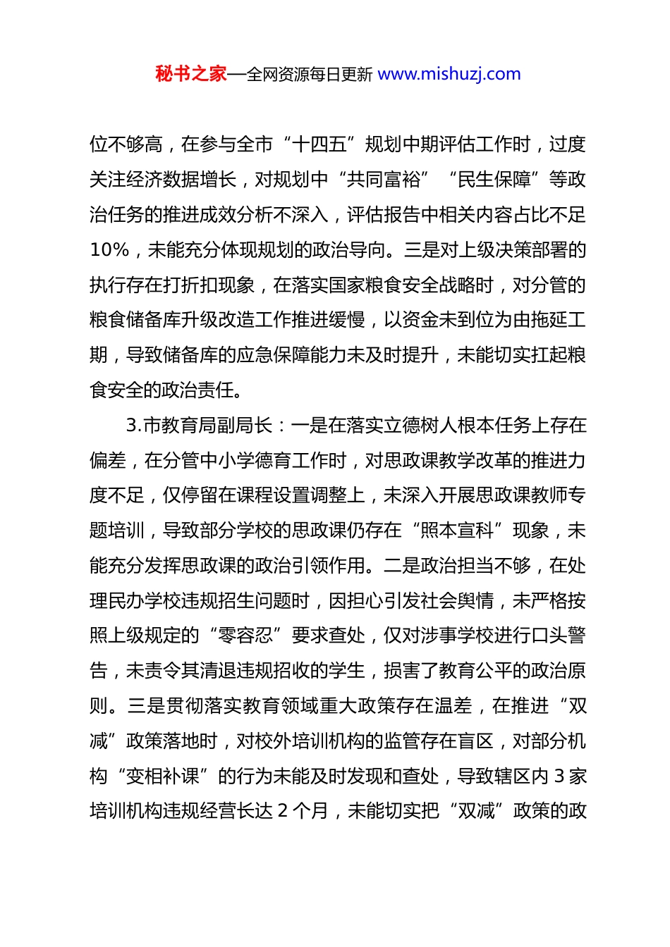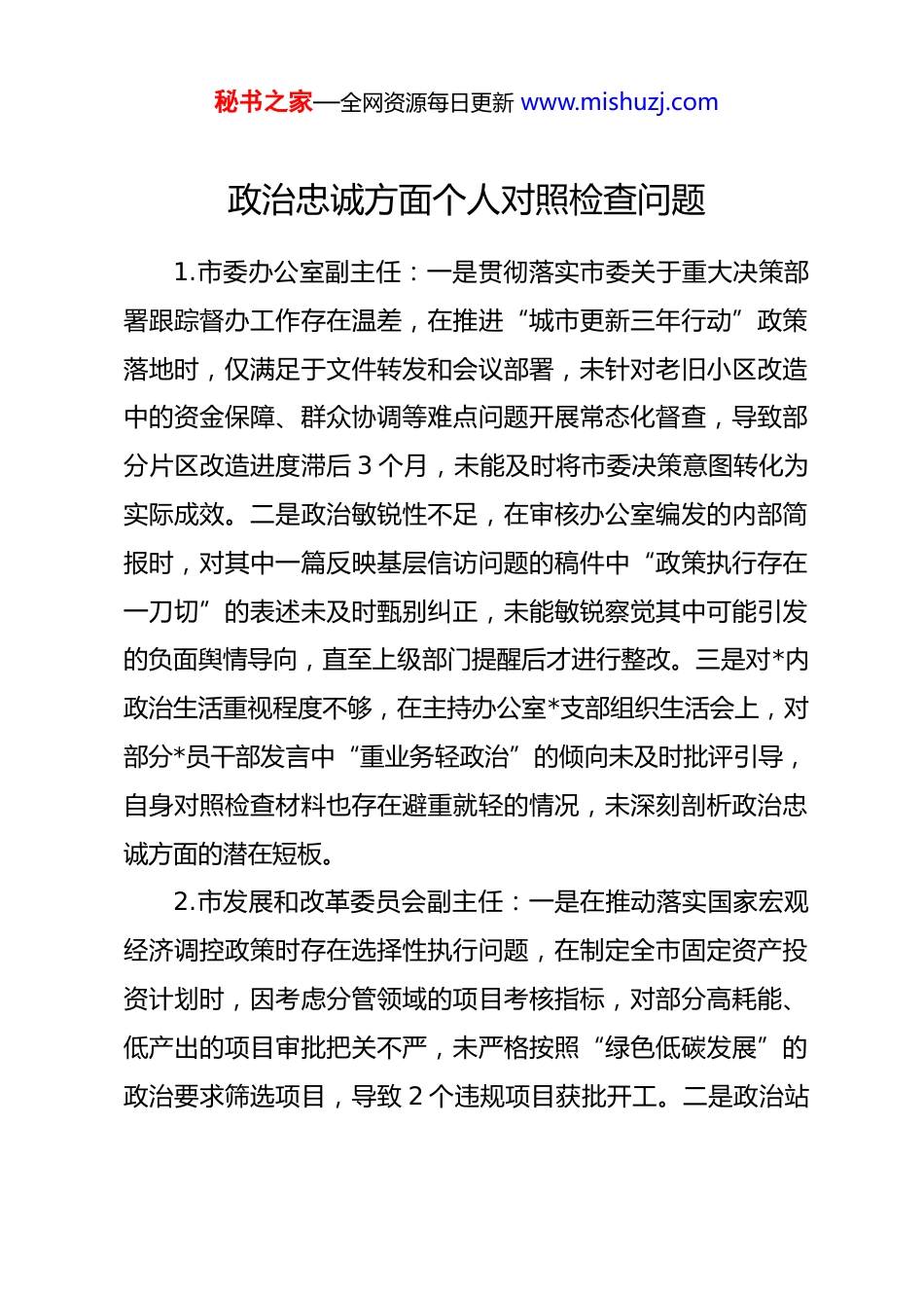 秘书之家—全网资源每日更新 www.mishuzj.com政治忠诚方面个人对照检查问题1.市委办公室副主任:一是贯彻落实市委关于重大决策部署跟踪督办工作存在温差,在推进“城市更新三年行动”政策落地时,仅满足于文件转发和会议部署,未针对老旧小区改造中的资金保障、群众协调等难点问题开展常态化督查,导致部分片区改造进度滞后 3 个月,未能及时将市委决策意图转化为实际成效。二是政治敏锐性不足,在审核办公室编发的内部简报时,对其中一篇反映基层信访问题的稿件中“政策执行存在一刀切”的表述未及时甄别纠正,未能敏锐察觉其中可能引发的负面舆情导向,直至上级部门提醒后才进行整改。三是对*内政治生活重视程度不够,在主持办公室*支部组织生活会上,对部分*员干部发言中“重业务轻政治”的倾向未及时批评引导,自身对照检查材料也存在避重就轻的情况,未深刻剖析政治忠诚方面的潜在短板。2.市发展和改革委员会副主任:一是在推动落实国家宏观经济调控政策时存在选择性执行问题,在制定全市固定资产投资计划时,因考虑分管领域的项目考核指标,对部分高耗能、低产出的项目审批把关不严,未严格按照“绿色低碳发展”的政治要求筛选项目,导致 2 个违规项目获批开工。二是政治站秘书之家—全网资源每日更新 www.mishuzj.com位不够高,在参与全市“十四五”规划中期评估工作时,过度关注经济数据增长,对规划中“共同富裕”“民生保障”等政治任务的推进成效分析不深入,评估报告中相关内容占比不足10%,未能充分体现规划的政治导向。三是对上级决策部署的执行存在打折扣现象,在落实国家粮食安全战略时,对分管的粮食储备库升级改造工作推进缓慢,以资金未到位为由拖延工期,导致储备库的应急保障能力未及时提升,未能切实扛起粮食安全的政治责任。3.市教育局副局长:一是在落实立德树人根本任务上存在偏差,在分管中小学德育工作时,对思政课教学改革的推进力度不足,仅停留在课程设置调整上,未深入开展思政课教师专题培训,导致部分学校的思政课仍存在“照本宣科”现象,未能充分发挥思政课的政治引领作用。二是政治担当不够,在处理民办学校违规招生问题时,因担心引发社会舆情,未严格按照上级规定的“零容忍”要求查处,仅对涉事学校进行口头警告,未责令其清退违规招收的学生,损害了教育公平的政治原则。三是贯彻落实教育领域重大政策存在温差,在推进“双减”政策落地时,对校外培训机构的监管存在盲区,对部分机构“变相补课”的行为未能及时发现和查处,导致辖区内 3 家培训机构违规经营长达 2 个月,未能切实把“双减”政策的政秘书之家—全网资源每日更新 www.mishuzj.com治要求落到实处。4.市公安局副局长:一是政治敏锐性不强,在分管社会治安防控工作时,对辖区内出现的个别涉政谣言传播现象重视不足,未及时组织警力开展辟谣和查处工作,导致谣言在网络上传播扩散 3 天,影响了社会政治稳定。二是在践行“人民公安为人民”的政治宗旨上存在短板,在处理群众反映强烈的交通拥堵问题时,仅从硬件设施改造入手,未深入调研群众的实际出行需求,制定的疏导方案缺乏针对性,导致某商圈周边的交通拥堵问题仍未得到有效解决,群众满意度较低。三是对公安队伍的政治建设抓得不紧,在分管的刑侦支队队伍管理中,重业务培训轻政治教育,未定期组织开展政治理论学习和忠诚教育,导致 1 名民警因政治意识淡薄出现违规执法行为,损害了公安队伍的政治形象。5.市财政局副局长:一是在落实财经纪律的政治要求上存在松懈,在分管预算编制工作时,对部分部门申报的预算项目审核不严格,未发现某部门虚报项目资金 200 万元的问题,导致财政资金浪费,未能坚守财政工作的政治底线。二是政治站位不够高,在推进财政资金统筹整合工作时,因考虑各部门的利益平衡,未严格按照上级“集中财力办大事”的政治要求推进,导致统筹整合的资金规模不足年度财政收入的 5%,未能秘书之家—全网资源每日更新 www.mishuzj.com充分发挥财政资金的政治效益和社会效益。三是对上级财政政策的执行存在滞后性,在落实中央直达资金管理政策时,对资金的拨付和使用监管不到位,导致某...