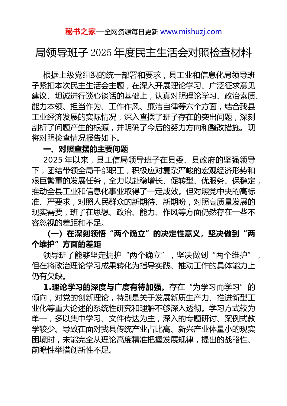 秘书之家—全网资源每日更新 www.mishuzj.com局领导班子 2025 年度民主生活会对照检查材料根据上级党组织的统一部署和要求,县工业和信息化局领导班子紧扣本次民主生活会主题,在深入开展理论学习、广泛征求意见建议、坦诚进行谈心谈话的基础上,认真对照理论学习、政治素质、能力本领、担当作为、工作作风、廉洁自律等六个方面,结合我县工业经济发展的实际情况,深入查摆了班子存在的突出问题,深刻剖析了问题产生的根源,并明确了今后的努力方向和整改措施。现将对照检查情况报告如下。一、对照查摆的主要问题2025 年以来,县工信局领导班子在县委、县政府的坚强领导下,团结带领全局干部职工,积极应对复杂严峻的宏观经济形势和艰巨繁重的发展任务,全力以赴稳增长、促转型、优服务、保稳定,推动全县工业和信息化事业取得了一定成效。但对照党中央的高标准、严要求,对照人民群众的新期待、新期盼,对照高质量发展的现实需要,班子在思想、政治、能力、作风等方面仍然存在一些不容忽视的差距和不足。(一)在深刻领悟“两个确立”的决定性意义,坚决做到“两个维护”方面的差距领导班子能够坚定拥护“两个确立”,坚决做到“两个维护”,但在将政治理论学习成果转化为指导实践、推动工作的具体能力上仍有欠缺。1.理论学习的深度与广度有待加强。存在“为学习而学习”的倾向,对党的创新理论,特别是关于发展新质生产力、推进新型工业化等重大论述的系统性研究和理解不够深入透彻。学习方式较为单一,多以集中学习、文件传达为主,深入的专题研讨、案例式教学较少。导致在面对我县传统产业占比高、新兴产业体量小的现实困境时,未能完全从理论高度精准把握发展规律,提出的战略性、前瞻性举措创新性不足。秘书之家—全网资源每日更新 www.mishuzj.com2.理论与实践的结合不够紧密。运用党的创新理论解决实际问题的能力有待提升。例如,在贯彻落实制造强国、网络强国、数字中国等战略部署时,满足于制定了方案、分解了任务,但在如何结合**县的产业基础,如**新型建材、**特色食品加工等,找到精准的切入点和突破口方面,思考得不深、谋划得不细。导致部分工作停留在宏观号召层面,未能有效转化为推动产业转型升级的具体项目和实际成效。(二)在带头用习近平新时代中国特色社会主义思想凝心铸魂方面的差距班子成员能够坚持用党的最新理论成果武装头脑,但理想信念的根基在复杂现实考验面前偶有松动,世界观、人生观、价值观的改造仍需持续用力。1.思想防线的“免疫力”有待增强。在面对经济下行压力加大、企业经营困难增多、招商引资竞争加剧等复杂局面时,班子个别成员偶尔会产生畏难情绪和“求稳”心态。对于一些需要先行先试、存在一定风险的改革创新举措,如探索“工业上楼”集约发展新模式、推动跨区域产业链协同等,存在顾虑较多、魄力不足的现象,担心“投入不见效”“改革引非议”,攻坚克难的锐气有所减弱。2.斗争精神的实践运用不够充分。对于工作中遇到的深层次矛盾和历史遗留问题,如部分“僵尸企业”的处置、落后产能的淘汰等,有时存在“绕道走”的思想,未能以“钉钉子”的精神一抓到底。在向上争取政策、资金、项目支持时,敢于“叫响”**特色、善于“推销”**优势的韧劲和巧劲尚显不足。(三)在带头坚持和加强党的全面领导方面的差距领导班子能够自觉维护党的集中统一领导,但在将党的领导贯穿于工业和信息化工作全过程、各方面的制度化、具体化方面仍有短板。1.议事决策的科学性有待提升。班子议事规则虽已建立,但在决策前期的调研论证环节有时做得不够扎实。例如,在决策年度重大工业项目引进时,对项目的技术前景、市场风险、环境影响等方秘书之家—全网资源每日更新 www.mishuzj.com面的评估有时过度依赖于项目方提供的数据,缺乏独立的、第三方专业机构的深度尽职调查。今年初计划引进的一个**能源项目,在后期深入对接中才发现其核心技术与宣传存在较大差距,导致项目推进停滞,浪费了宝贵的招商资源和时间窗口。2.党建与业务融合的机制不够健全。“一手抓党建、一手抓业务”的“两张皮”现象依然在一定程度上存在。党建工作与中心任务结合不够...