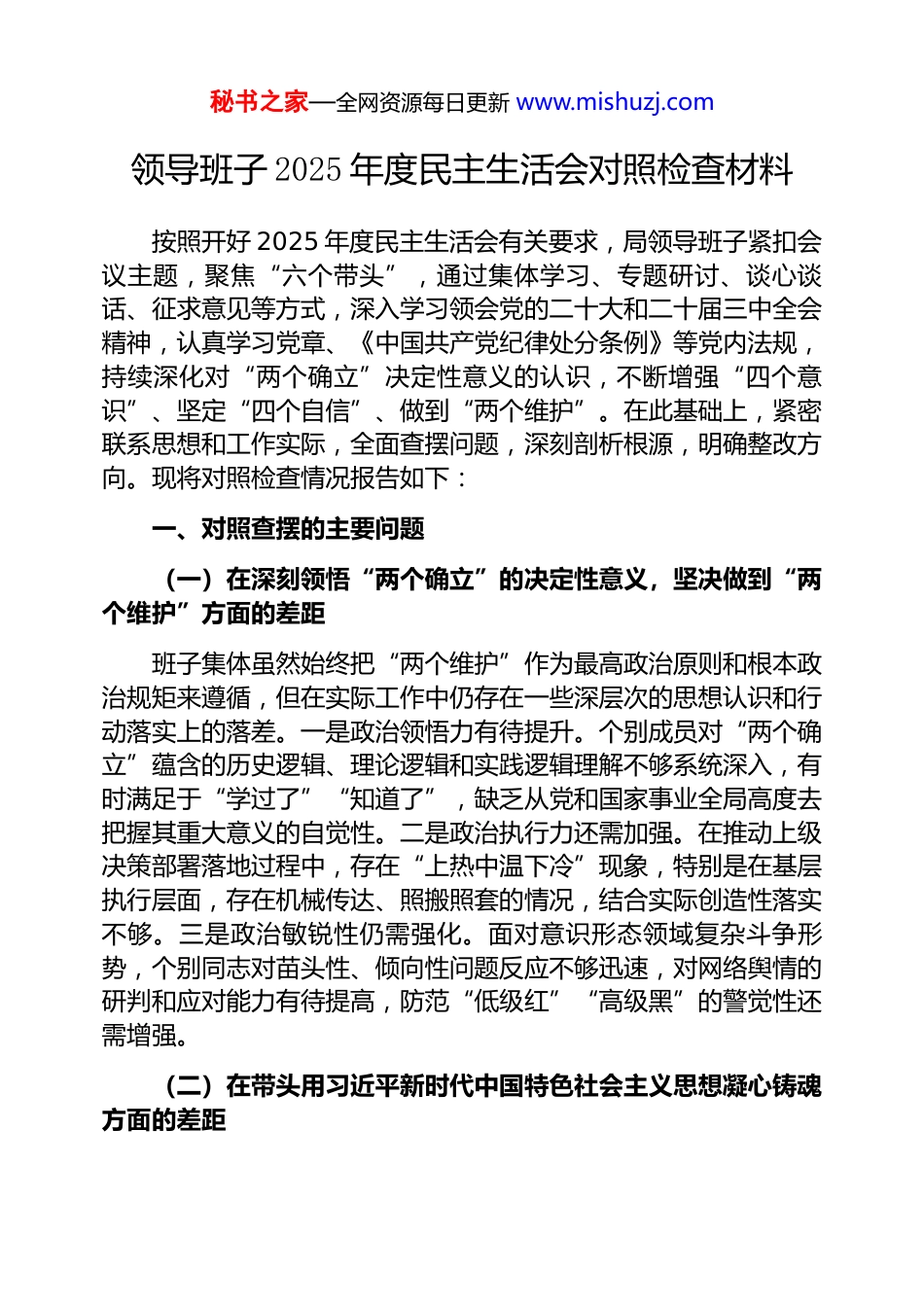 秘书之家—全网资源每日更新 www.mishuzj.com领导班子 2025 年度民主生活会对照检查材料按照开好 2025 年度民主生活会有关要求,局领导班子紧扣会议主题,聚焦“六个带头”,通过集体学习、专题研讨、谈心谈话、征求意见等方式,深入学习领会党的二十大和二十届三中全会精神,认真学习党章、《中国共产党纪律处分条例》等党内法规,持续深化对“两个确立”决定性意义的认识,不断增强“四个意识”、坚定“四个自信”、做到“两个维护”。在此基础上,紧密联系思想和工作实际,全面查摆问题,深刻剖析根源,明确整改方向。现将对照检查情况报告如下:一、对照查摆的主要问题(一)在深刻领悟“两个确立”的决定性意义,坚决做到“两个维护”方面的差距班子集体虽然始终把“两个维护”作为最高政治原则和根本政治规矩来遵循,但在实际工作中仍存在一些深层次的思想认识和行动落实上的落差。一是政治领悟力有待提升。个别成员对“两个确立”蕴含的历史逻辑、理论逻辑和实践逻辑理解不够系统深入,有时满足于“学过了”“知道了”,缺乏从党和国家事业全局高度去把握其重大意义的自觉性。二是政治执行力还需加强。在推动上级决策部署落地过程中,存在“上热中温下冷”现象,特别是在基层执行层面,存在机械传达、照搬照套的情况,结合实际创造性落实不够。三是政治敏锐性仍需强化。面对意识形态领域复杂斗争形势,个别同志对苗头性、倾向性问题反应不够迅速,对网络舆情的研判和应对能力有待提高,防范“低级红”“高级黑”的警觉性还需增强。(二)在带头用习近平新时代中国特色社会主义思想凝心铸魂方面的差距秘书之家—全网资源每日更新 www.mishuzj.com班子坚持把理论武装作为首要任务,但在学懂弄通做实上仍有短板。一是理论学习的系统性不强。学习多以集中传达、重点解读为主,缺乏长期规划和深度研读,对新思想的科学体系、核心要义、实践要求掌握不够全面,存在“碎片化”“浅表化”倾向。二是学用结合不够紧密。理论学习与业务工作“两张皮”现象尚未完全破解,运用党的创新理论指导实践、破解难题的能力不足。比如,在推动高质量发展、优化营商环境等重点工作中,未能充分运用新发展理念找到最优解。三是思想引领作用发挥不充分。对党员干部的思想动态掌握不够及时,思想政治工作方式方法较为传统,针对性和实效性有待提升,个别干部存在“重业务轻思想”的倾向,理想信念根基还需进一步夯实。(三)在带头坚持和加强党的全面领导方面的差距班子始终坚持党对一切工作的领导,但在制度落实和领导方式上仍有改进空间。一是议事决策机制执行不够严格。个别重大事项决策前调研论证不充分,听取基层意见不够广泛,存在“拍脑袋”决策的风险隐患。民主集中制落实中,有时“一把手”末位发言制度执行不到位,班子成员发表意见的主动性有待提高。二是党建与业务融合不深。存在“重部署、轻落实”“重形式、轻实效”问题,党建工作责任制落实层层递减,部分基层党组织战斗堡垒作用发挥不明显。三是统筹协调能力有待提升。面对跨部门、跨领域的复杂任务,牵头抓总、协调推进的力度不够,存在“各扫门前雪”现象,整体合力尚未完全形成。(四)在带头坚持以人民为中心的发展思想,推动改革发展稳定方面的差距班子始终把为民服务作为出发点和落脚点,但在回应群众关切、提升治理效能方面仍有不足。一是调查研究不够深入。下基层调研存在“走马观花”“被安排”现象,真正蹲点解剖麻雀、倾听群众心声的时间少,掌握第一手资料不全面,导致部分政策制定脱秘书之家—全网资源每日更新 www.mishuzj.com离实际。二是服务群众能力有待提升。面对群众多元化、个性化需求,服务供给方式单一,信息化手段应用不充分,办事流程仍显烦琐,“最后一公里”梗阻问题依然存在。三是推动改革攻坚的韧劲不足。面对体制机制障碍和历史遗留问题,有时存在畏难情绪和“等靠要”思想,缺乏“啃硬骨头”的决心和勇气,改革举措推进缓慢,成效不够明显。(五)在带头发扬斗争精神,防范化解风险挑战方面的差距班子具备一定的风险意识,但在应对复杂局面、敢于动真碰硬方面仍有短板。一是斗争意识不够强烈...