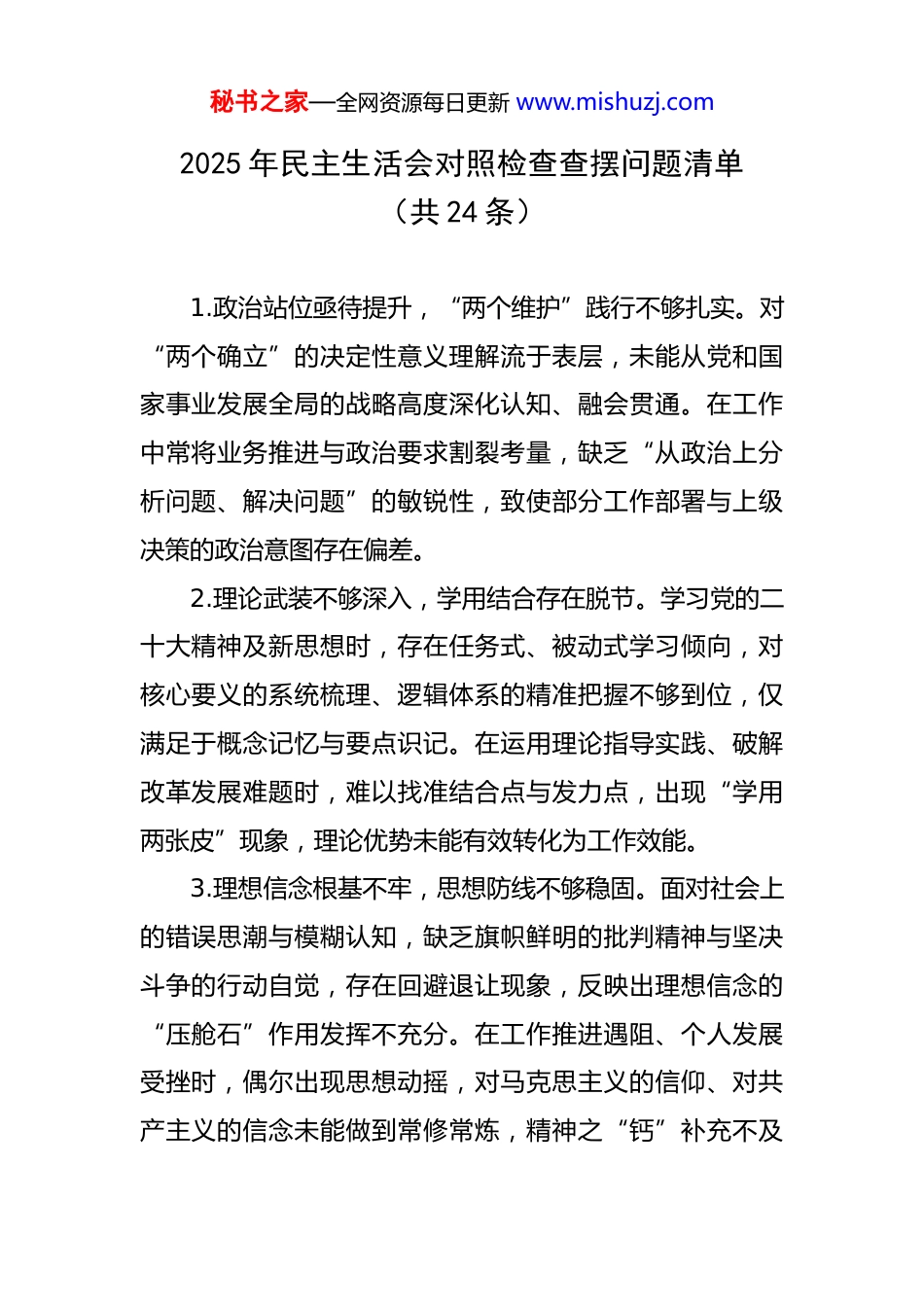 秘书之家—全网资源每日更新 www.mishuzj.com2025 年民主生活会对照检查查摆问题清单(共 24 条)1.政治站位亟待提升,“两个维护”践行不够扎实。对“两个确立”的决定性意义理解流于表层,未能从党和国家事业发展全局的战略高度深化认知、融会贯通。在工作中常将业务推进与政治要求割裂考量,缺乏“从政治上分析问题、解决问题”的敏锐性,致使部分工作部署与上级决策的政治意图存在偏差。2.理论武装不够深入,学用结合存在脱节。学习党的二十大精神及新思想时,存在任务式、被动式学习倾向,对核心要义的系统梳理、逻辑体系的精准把握不够到位,仅满足于概念记忆与要点识记。在运用理论指导实践、破解改革发展难题时,难以找准结合点与发力点,出现“学用两张皮”现象,理论优势未能有效转化为工作效能。3.理想信念根基不牢,思想防线不够稳固。面对社会上的错误思潮与模糊认知,缺乏旗帜鲜明的批判精神与坚决斗争的行动自觉,存在回避退让现象,反映出理想信念的“压舱石”作用发挥不充分。在工作推进遇阻、个人发展受挫时,偶尔出现思想动摇,对马克思主义的信仰、对共产主义的信念未能做到常修常炼,精神之“钙”补充不及秘书之家—全网资源每日更新 www.mishuzj.com时。4.党性锤炼不够扎实,自我革命精神弱化。参与民主生活会、组织生活会等党内政治生活时,自我批评避重就轻、流于形式,对自身问题剖析不深不透;相互批评缺乏“辣味”,以委婉建议替代严肃批评,“老好人”思想突出。对照党章党规开展自我检视不够主动,对党性修养弱化、宗旨意识淡化等问题察觉滞后,自我净化、自我完善的内生动力不足。5.宗旨意识树得不牢,联系群众不够紧密。下基层调研前准备工作不充分,对群众高度关注的教育、医疗、养老等民生痛点问题底数不清,导致调研过程中靶向不准、问效不实,难以掌握第一手情况。处理群众信访事项时,存在重程序性回复、轻实质性解决的倾向,对办理进度与办理质量的跟踪督办不够严格,部分群众诉求未能得到及时有效回应,践行群众路线不够扎实。6.担当精神有所欠缺,攻坚克难劲头不足。面对历史遗留信访积案、征地拆迁等重难点工作,存在畏难情绪与“怕担责、怕惹麻烦”的思想,主动牵头协调、推动解决的积极性不强。在重大项目推进过程中,遭遇审批瓶颈、资金短缺等困难时,缺乏“一抓到底”的韧劲与决心,有时存在向上级移交问题的倾向,未能切实履行牵头抓总职秘书之家—全网资源每日更新 www.mishuzj.com责。7.斗争精神不够强烈,原则底线坚守不严。对工作中存在的形式主义、官僚主义问题,如会议过多过滥、过度留痕等现象,因顾及人情关系与工作氛围,不愿当面较真碰硬,多以温和提醒替代严肃纠正。应对网络舆情及负面信息时,存在等待上级指令的被动心态,主动发声引导、妥善处置的意识与能力不足,斗争策略与方法运用不够灵活。8.政绩观念存在偏差,实干导向不够鲜明。谋划工作时,过度聚焦上级考核的显性指标,对老旧小区改造、背街小巷整治等群众期盼的民生“潜绩”投入精力不足,资源配置不够合理。在工作成果报送与数据统计中,存在层层加码、修饰完善的倾向,片面追求表面成效,忽视了工作的实际质量与群众的真实感受,偏离了以人民为中心的发展思想。9.纪律意识不够强烈,自我约束标准不高。对党的廉洁纪律重要性认识不够深刻,存在“只要不触碰高压线就行”的麻痹思想,对人情往来中的“小节”问题警惕性不足。在落实纪律规定及其要求方面,存在松懈滑坡倾向,对下属单位出现的违规吃喝、公车私用等问题,监督检查不够严格,执纪问责力度有待加强。秘书之家—全网资源每日更新 www.mishuzj.com10.规矩意识较为淡薄,制度执行不够严格。在重大事项请示报告工作中,存在“先斩后奏”“边干边报”的情况,错误认为“工作完成即可”,忽视了程序规范的重要性。执行单位内部规章制度时,常以“情况特殊、任务紧急”为由变通执行,对制度缺乏应有的敬畏之心,未能做到令行禁止、刚性落实。11.工作作风不够扎实,形式主义仍有残留。“以会议落实会议、以文件落实文件”的现象尚未彻底根除,对会议精神的传达部署多、跟踪问效少,缺乏闭环管理机...