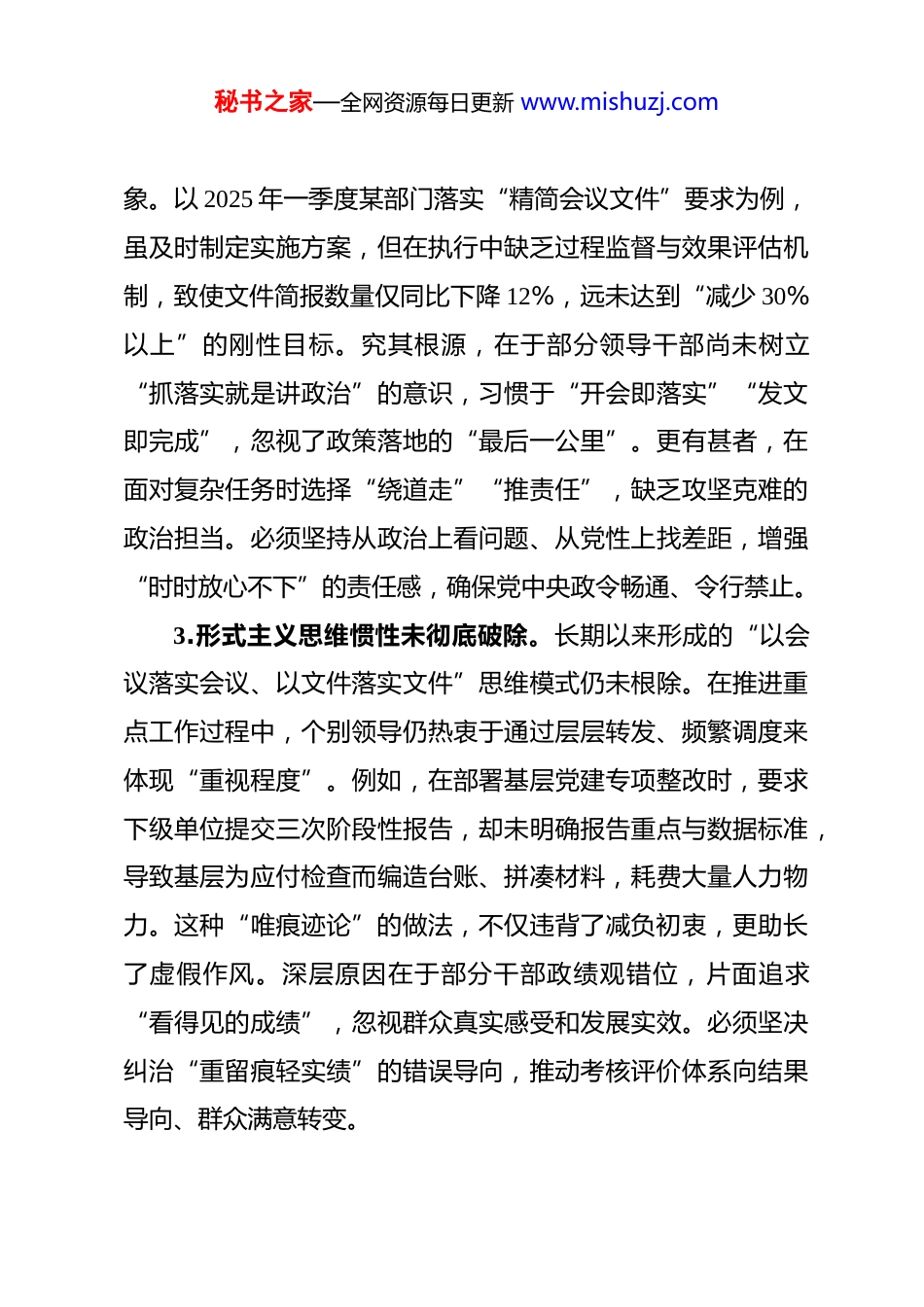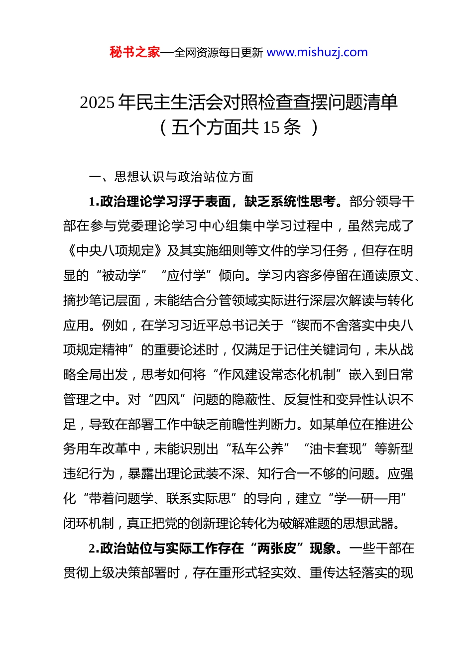 秘书之家—全网资源每日更新 www.mishuzj.com2025 年民主生活会对照检查查摆问题清单(五个方面共 15 条 )一、思想认识与政治站位方面1.政治理论学习浮于表面,缺乏系统性思考。部分领导干部在参与党委理论学习中心组集中学习过程中,虽然完成了《中央八项规定》及其实施细则等文件的学习任务,但存在明显的“被动学”“应付学”倾向。学习内容多停留在通读原文、摘抄笔记层面,未能结合分管领域实际进行深层次解读与转化应用。例如,在学习习近平总书记关于“锲而不舍落实中央八项规定精神”的重要论述时,仅满足于记住关键词句,未从战略全局出发,思考如何将“作风建设常态化机制”嵌入到日常管理之中。对“四风”问题的隐蔽性、反复性和变异性认识不足,导致在部署工作中缺乏前瞻性判断力。如某单位在推进公务用车改革中,未能识别出“私车公养”“油卡套现”等新型违纪行为,暴露出理论武装不深、知行合一不够的问题。应强化“带着问题学、联系实际思”的导向,建立“学—研—用”闭环机制,真正把党的创新理论转化为破解难题的思想武器。2.政治站位与实际工作存在“两张皮”现象。一些干部在贯彻上级决策部署时,存在重形式轻实效、重传达轻落实的现秘书之家—全网资源每日更新 www.mishuzj.com象。以 2025 年一季度某部门落实“精简会议文件”要求为例,虽及时制定实施方案,但在执行中缺乏过程监督与效果评估机制,致使文件简报数量仅同比下降 12%,远未达到“减少 30%以上”的刚性目标。究其根源,在于部分领导干部尚未树立“抓落实就是讲政治”的意识,习惯于“开会即落实”“发文即完成”,忽视了政策落地的“最后一公里”。更有甚者,在面对复杂任务时选择“绕道走”“推责任”,缺乏攻坚克难的政治担当。必须坚持从政治上看问题、从党性上找差距,增强“时时放心不下”的责任感,确保党中央政令畅通、令行禁止。3.形式主义思维惯性未彻底破除。长期以来形成的“以会议落实会议、以文件落实文件”思维模式仍未根除。在推进重点工作过程中,个别领导仍热衷于通过层层转发、频繁调度来体现“重视程度”。例如,在部署基层党建专项整改时,要求下级单位提交三次阶段性报告,却未明确报告重点与数据标准,导致基层为应付检查而编造台账、拼凑材料,耗费大量人力物力。这种“唯痕迹论”的做法,不仅违背了减负初衷,更助长了虚假作风。深层原因在于部分干部政绩观错位,片面追求“看得见的成绩”,忽视群众真实感受和发展实效。必须坚决纠治“重留痕轻实绩”的错误导向,推动考核评价体系向结果导向、群众满意转变。秘书之家—全网资源每日更新 www.mishuzj.com二、调查研究与工作作风方面1.调查研究“蜻蜓点水”,缺乏问题导向。当前调研工作中普遍存在的问题是“走马观花式”“盆景式”调研。部分班子成员下基层前未做充分准备,未提前收集群众诉求或分析问题症结,调研过程流于听汇报、看展板、拍照留痕。例如,一名分管城建的领导在调研老旧小区改造项目时,全程由街道干部陪同引导,未深入楼栋走访居民,也未召开居民座谈会,最终形成的方案脱离实际,引发群众强烈不满。此类现象反映出部分干部宗旨意识淡薄,缺乏“蹲点调研”“解剖麻雀”的耐心与决心。要大力推行“四不两直”工作法(不发通知、不打招呼、不听汇报、不用陪同接待、直奔基层、直插现场),鼓励领导干部带着课题沉下去,真正摸清民情、找准痛点、提出对策。2.文风会风整治不彻底,存在“以会议数量论英雄”倾向。尽管近年来持续整治“文山会海”,但部分单位仍存在会议过多过滥、文件冗长空洞等问题。数据显示,某部门 2025 年一季度印发正式文件数量同比增加 8%,其中不少内容照搬照抄上级文件,甚至出现“上下一般粗”“换汤不换药”的情况。在会议安排上,一周内连续召开三场主题相近的专题会议,议题重复、时间冗长,参会人员疲于奔命,严重影响正常业务运转。秘书之家—全网资源每日更新 www.mishuzj.com这背后反映的是部分领导干部对“高效行政”的理解偏差,误以为“开会多=重视度高”。必须严格执行会议审批制度,压缩非必要会议,提倡开短会、讲短话、发短文,推动机关运行...