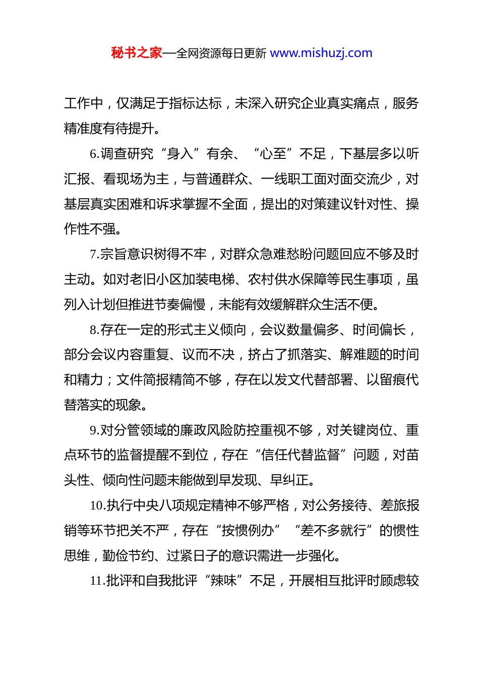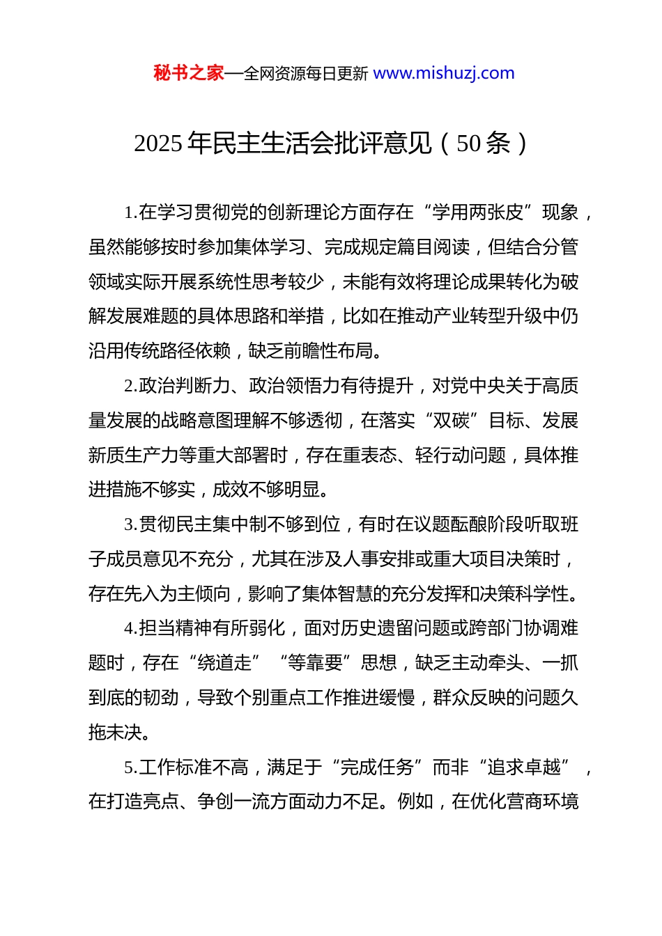秘书之家—全网资源每日更新 www.mishuzj.com2025 年民主生活会批评意见(50 条)1.在学习贯彻党的创新理论方面存在“学用两张皮”现象,虽然能够按时参加集体学习、完成规定篇目阅读,但结合分管领域实际开展系统性思考较少,未能有效将理论成果转化为破解发展难题的具体思路和举措,比如在推动产业转型升级中仍沿用传统路径依赖,缺乏前瞻性布局。2.政治判断力、政治领悟力有待提升,对党中央关于高质量发展的战略意图理解不够透彻,在落实“双碳”目标、发展新质生产力等重大部署时,存在重表态、轻行动问题,具体推进措施不够实,成效不够明显。3.贯彻民主集中制不够到位,有时在议题酝酿阶段听取班子成员意见不充分,尤其在涉及人事安排或重大项目决策时,存在先入为主倾向,影响了集体智慧的充分发挥和决策科学性。4.担当精神有所弱化,面对历史遗留问题或跨部门协调难题时,存在“绕道走”“等靠要”思想,缺乏主动牵头、一抓到底的韧劲,导致个别重点工作推进缓慢,群众反映的问题久拖未决。5.工作标准不高,满足于“完成任务”而非“追求卓越”,在打造亮点、争创一流方面动力不足。例如,在优化营商环境秘书之家—全网资源每日更新 www.mishuzj.com工作中,仅满足于指标达标,未深入研究企业真实痛点,服务精准度有待提升。6.调查研究“身入”有余、“心至”不足,下基层多以听汇报、看现场为主,与普通群众、一线职工面对面交流少,对基层真实困难和诉求掌握不全面,提出的对策建议针对性、操作性不强。7.宗旨意识树得不牢,对群众急难愁盼问题回应不够及时主动。如对老旧小区加装电梯、农村供水保障等民生事项,虽列入计划但推进节奏偏慢,未能有效缓解群众生活不便。8.存在一定的形式主义倾向,会议数量偏多、时间偏长,部分会议内容重复、议而不决,挤占了抓落实、解难题的时间和精力;文件简报精简不够,存在以发文代替部署、以留痕代替落实的现象。9.对分管领域的廉政风险防控重视不够,对关键岗位、重点环节的监督提醒不到位,存在“信任代替监督”问题,对苗头性、倾向性问题未能做到早发现、早纠正。10.执行中央八项规定精神不够严格,对公务接待、差旅报销等环节把关不严,存在“按惯例办”“差不多就行”的惯性思维,勤俭节约、过紧日子的意识需进一步强化。11.批评和自我批评“辣味”不足,开展相互批评时顾虑较秘书之家—全网资源每日更新 www.mishuzj.com多,怕影响团结、怕得罪人,多以“希望”“建议”代替直指问题,未能真正达到红脸出汗、排毒治病的效果。12.“一岗双责”履行不到位,存在重业务、轻党建倾向,对分管部门党风廉政建设指导督促不够经常,压力传导层层递减,党建工作与业务工作融合度不高。13.对年轻干部培养使用力度不够,压担子多、教方法少,梯队建设缺乏系统规划,部分关键岗位后备力量不足,存在人才断层风险。14.面对新形势新任务,知识更新滞后,对数字经济、人工智能、绿色金融等新领域新知识学习不主动,存在“本领恐慌”,影响了服务高质量发展的能力。15.推动改革创新的锐气不足,习惯沿用老经验、老办法处理新问题,在体制机制改革、流程再造等方面突破性举措不多,工作亮点不突出。16.对巡视巡察、审计等反馈问题整改存在“过关”心态,就事论事整改多,举一反三、建章立制少,长效机制建设滞后,同类问题易反复发生。17.在推动乡村振兴中统筹谋划不够,对产业发展、乡村治理、人居环境整治等重点工作协同推进不足,存在“单打一”现象,整体成效打折扣。秘书之家—全网资源每日更新 www.mishuzj.com18.服务企业意识有待加强,在招商引资和项目落地过程中,重签约轻服务,对企业后续运营中遇到的用地、用工、融资等难题协调解决不及时。19.对意识形态工作重视不够,对分管领域舆情风险研判不足,对网络空间错误言论斗争不够坚决,阵地管理存在薄弱环节。20.个人有关事项报告不够严谨细致,个别事项填报说明不清,存在漏报、模糊表述等情况,反映出纪律规矩意识需进一步增强。21.家风建设重视不够,对配偶、子女及身边工作人员教育提醒不经常,对其社会交往圈关注不多,廉洁“后院”防线需加固。22.在推动共同富裕方...