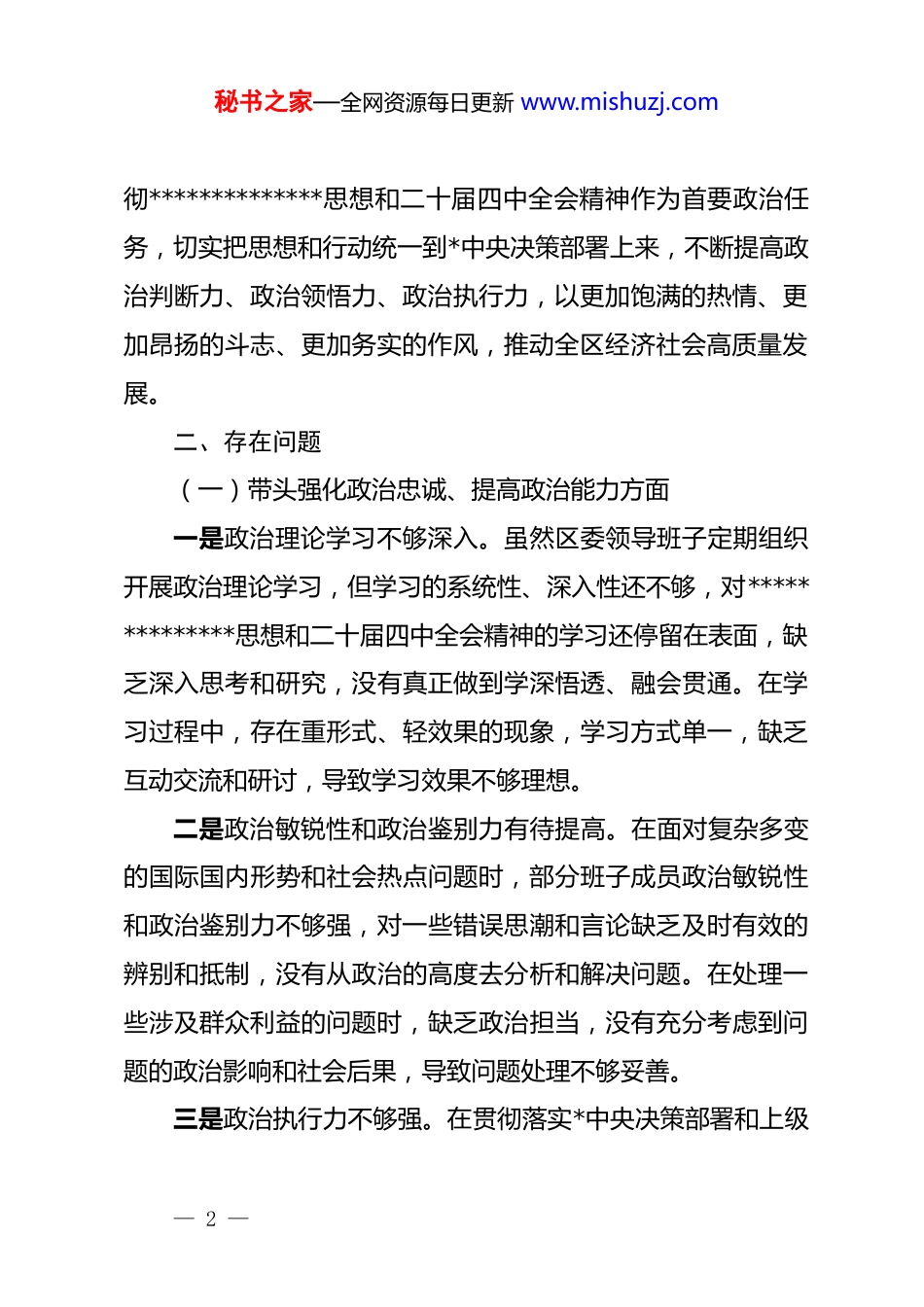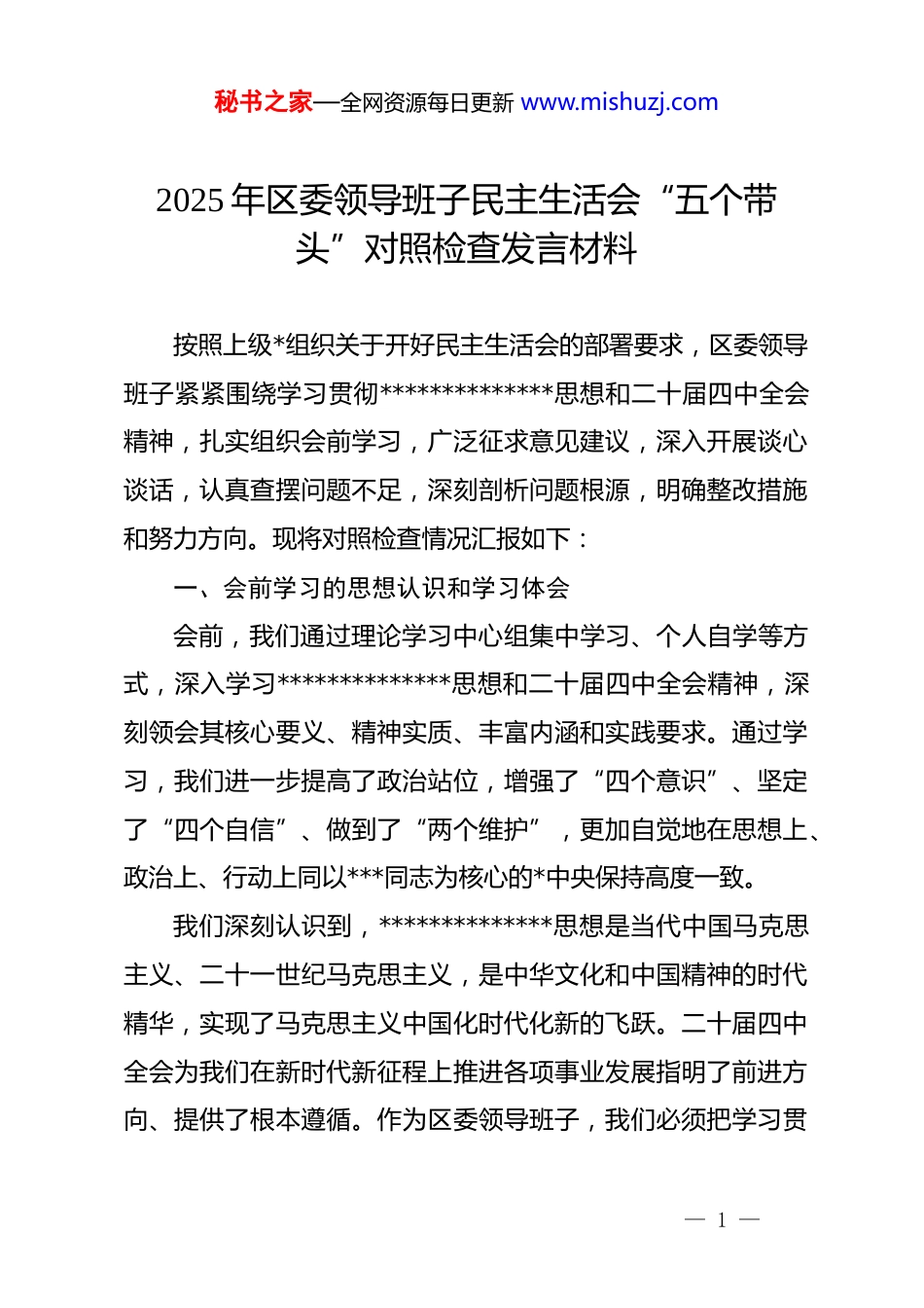 秘书之家—全网资源每日更新 www.mishuzj.com2025 年区委领导班子民主生活会“五个带头”对照检查发言材料按照上级*组织关于开好民主生活会的部署要求,区委领导班子紧紧围绕学习贯彻**************思想和二十届四中全会精神,扎实组织会前学习,广泛征求意见建议,深入开展谈心谈话,认真查摆问题不足,深刻剖析问题根源,明确整改措施和努力方向。现将对照检查情况汇报如下:一、会前学习的思想认识和学习体会会前,我们通过理论学习中心组集中学习、个人自学等方式,深入学习**************思想和二十届四中全会精神,深刻领会其核心要义、精神实质、丰富内涵和实践要求。通过学习,我们进一步提高了政治站位,增强了“四个意识”、坚定了“四个自信”、做到了“两个维护”,更加自觉地在思想上、政治上、行动上同以***同志为核心的*中央保持高度一致。我们深刻认识到,**************思想是当代中国马克思主义、二十一世纪马克思主义,是中华文化和中国精神的时代精华,实现了马克思主义中国化时代化新的飞跃。二十届四中全会为我们在新时代新征程上推进各项事业发展指明了前进方向、提供了根本遵循。作为区委领导班子,我们必须把学习贯— 1 —秘书之家—全网资源每日更新 www.mishuzj.com彻**************思想和二十届四中全会精神作为首要政治任务,切实把思想和行动统一到*中央决策部署上来,不断提高政治判断力、政治领悟力、政治执行力,以更加饱满的热情、更加昂扬的斗志、更加务实的作风,推动全区经济社会高质量发展。二、存在问题(一)带头强化政治忠诚、提高政治能力方面一是政治理论学习不够深入。虽然区委领导班子定期组织开展政治理论学习,但学习的系统性、深入性还不够,对**************思想和二十届四中全会精神的学习还停留在表面,缺乏深入思考和研究,没有真正做到学深悟透、融会贯通。在学习过程中,存在重形式、轻效果的现象,学习方式单一,缺乏互动交流和研讨,导致学习效果不够理想。二是政治敏锐性和政治鉴别力有待提高。在面对复杂多变的国际国内形势和社会热点问题时,部分班子成员政治敏锐性和政治鉴别力不够强,对一些错误思潮和言论缺乏及时有效的辨别和抵制,没有从政治的高度去分析和解决问题。在处理一些涉及群众利益的问题时,缺乏政治担当,没有充分考虑到问题的政治影响和社会后果,导致问题处理不够妥善。三是政治执行力不够强。在贯彻落实*中央决策部署和上级— 2 —秘书之家—全网资源每日更新 www.mishuzj.com*委工作要求时,存在打折扣、搞变通的现象,没有完全做到不打折扣、不搞变通。在推进一些重点工作和重大项目时,存在畏难情绪和拖延现象,缺乏钉钉子精神,导致工作进度缓慢,影响了工作成效。(二)带头固本培元、增强*性方面一是*性修养不够自觉。部分班子成员在日常工作和生活中,放松了对自己的*性要求,缺乏自我约束和自我监督,没有时刻以*员的标准严格要求自己。在面对一些利益诱惑时,缺乏坚定的*性原则,容易受到不良思想和行为的影响,导致*性修养出现滑坡。二是*内政治生活不够严肃。虽然区委领导班子严格落实“三会一课”、民主生活会、组织生活会等*内政治生活制度,但在实际执行过程中,存在形式主义现象,*内政治生活的质量不高。在民主生活会和组织生活会上,部分班子成员存在自我批评避重就轻、相互批评蜻蜓点水的现象,没有真正做到红脸出汗、排毒治病,*内政治生活的政治性、时代性、原则性、战斗性不够强。三是宗旨意识不够牢固。部分班子成员在工作中存在官僚主义和形式主义作风,对群众的需求和诉求关注不够,缺乏主动服务群众的意识和能力。在处理一些涉及群众利益的问题时,— 3 —秘书之家—全网资源每日更新 www.mishuzj.com没有充分听取群众的意见和建议,没有真正做到想群众之所想、急群众之所急、解群众之所难,导致群众对我们的工作满意度不高。(三)带头敬畏人民、敬畏组织、敬畏法纪方面一是对人民群众的敬畏之心不够。部分班子成员在工作中存在高高在上的心态,没有真正把人民群众放在心中最高位置,缺乏对人民群众的深厚感情。在处理一些涉及群众利益的问题时,没有充分考...