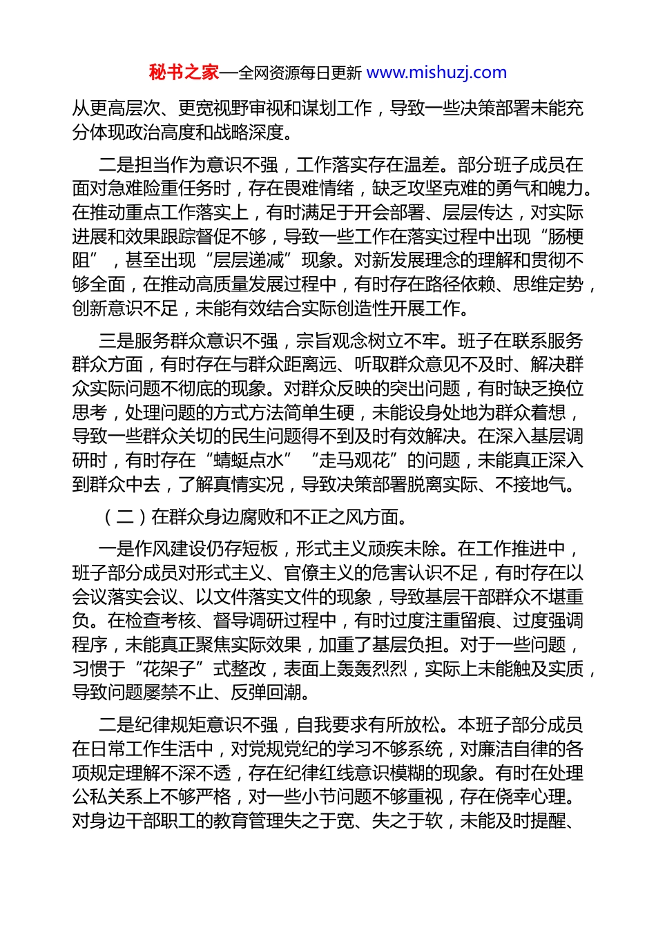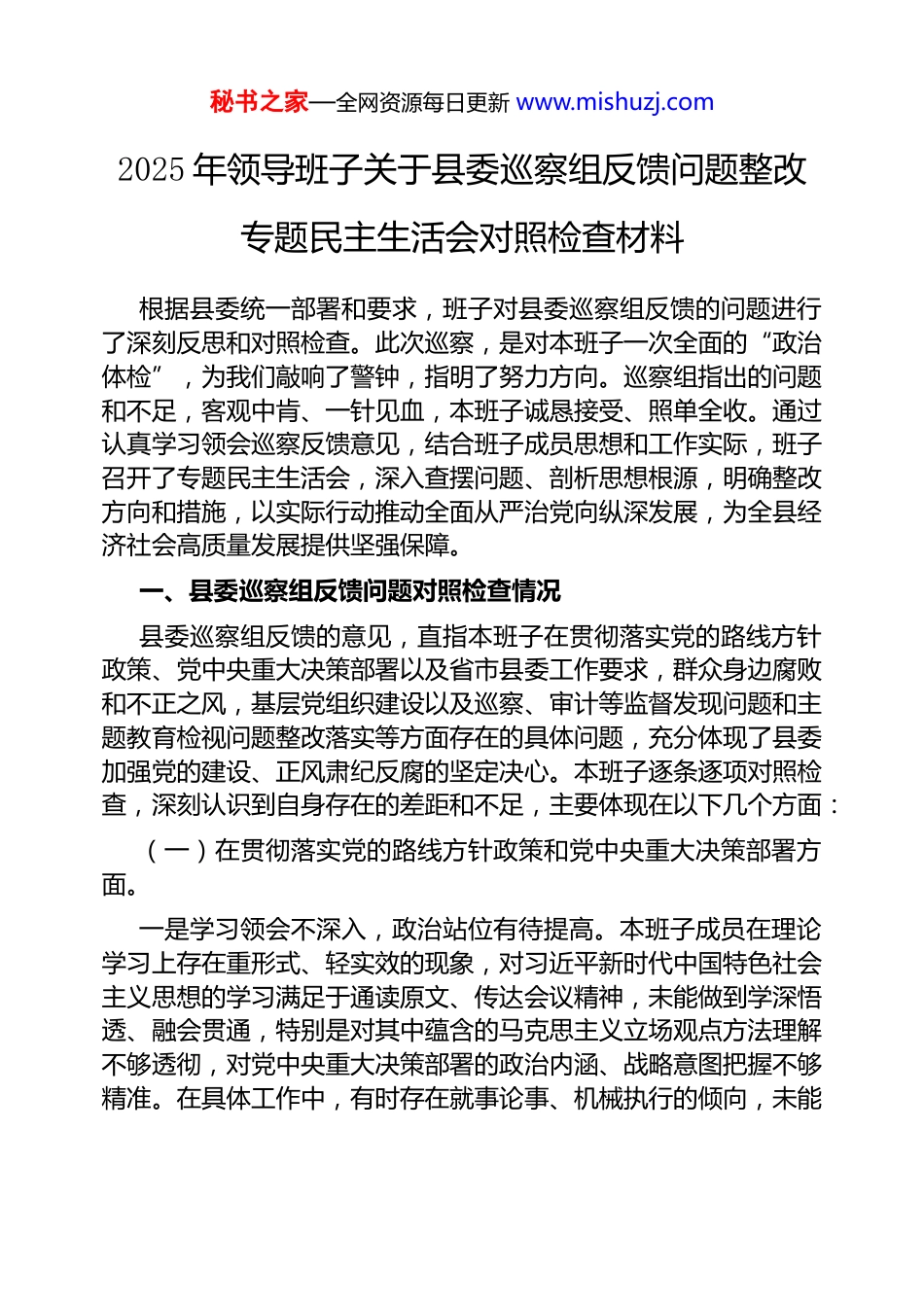 秘书之家—全网资源每日更新 www.mishuzj.com2025 年领导班子关于县委巡察组反馈问题整改专题民主生活会对照检查材料根据县委统一部署和要求,班子对县委巡察组反馈的问题进行了深刻反思和对照检查。此次巡察,是对本班子一次全面的“政治体检”,为我们敲响了警钟,指明了努力方向。巡察组指出的问题和不足,客观中肯、一针见血,本班子诚恳接受、照单全收。通过认真学习领会巡察反馈意见,结合班子成员思想和工作实际,班子召开了专题民主生活会,深入查摆问题、剖析思想根源,明确整改方向和措施,以实际行动推动全面从严治党向纵深发展,为全县经济社会高质量发展提供坚强保障。一、县委巡察组反馈问题对照检查情况县委巡察组反馈的意见,直指本班子在贯彻落实党的路线方针政策、党中央重大决策部署以及省市县委工作要求,群众身边腐败和不正之风,基层党组织建设以及巡察、审计等监督发现问题和主题教育检视问题整改落实等方面存在的具体问题,充分体现了县委加强党的建设、正风肃纪反腐的坚定决心。本班子逐条逐项对照检查,深刻认识到自身存在的差距和不足,主要体现在以下几个方面:(一)在贯彻落实党的路线方针政策和党中央重大决策部署方面。一是学习领会不深入,政治站位有待提高。本班子成员在理论学习上存在重形式、轻实效的现象,对习近平新时代中国特色社会主义思想的学习满足于通读原文、传达会议精神,未能做到学深悟透、融会贯通,特别是对其中蕴含的马克思主义立场观点方法理解不够透彻,对党中央重大决策部署的政治内涵、战略意图把握不够精准。在具体工作中,有时存在就事论事、机械执行的倾向,未能秘书之家—全网资源每日更新 www.mishuzj.com从更高层次、更宽视野审视和谋划工作,导致一些决策部署未能充分体现政治高度和战略深度。二是担当作为意识不强,工作落实存在温差。部分班子成员在面对急难险重任务时,存在畏难情绪,缺乏攻坚克难的勇气和魄力。在推动重点工作落实上,有时满足于开会部署、层层传达,对实际进展和效果跟踪督促不够,导致一些工作在落实过程中出现“肠梗阻”,甚至出现“层层递减”现象。对新发展理念的理解和贯彻不够全面,在推动高质量发展过程中,有时存在路径依赖、思维定势,创新意识不足,未能有效结合实际创造性开展工作。三是服务群众意识不强,宗旨观念树立不牢。班子在联系服务群众方面,有时存在与群众距离远、听取群众意见不及时、解决群众实际问题不彻底的现象。对群众反映的突出问题,有时缺乏换位思考,处理问题的方式方法简单生硬,未能设身处地为群众着想,导致一些群众关切的民生问题得不到及时有效解决。在深入基层调研时,有时存在“蜻蜓点水”“走马观花”的问题,未能真正深入到群众中去,了解真情实况,导致决策部署脱离实际、不接地气。(二)在群众身边腐败和不正之风方面。一是作风建设仍存短板,形式主义顽疾未除。在工作推进中,班子部分成员对形式主义、官僚主义的危害认识不足,有时存在以会议落实会议、以文件落实文件的现象,导致基层干部群众不堪重负。在检查考核、督导调研过程中,有时过度注重留痕、过度强调程序,未能真正聚焦实际效果,加重了基层负担。对于一些问题,习惯于“花架子”式整改,表面上轰轰烈烈,实际上未能触及实质,导致问题屡禁不止、反弹回潮。二是纪律规矩意识不强,自我要求有所放松。本班子部分成员在日常工作生活中,对党规党纪的学习不够系统,对廉洁自律的各项规定理解不深不透,存在纪律红线意识模糊的现象。有时在处理公私关系上不够严格,对一些小节问题不够重视,存在侥幸心理。对身边干部职工的教育管理失之于宽、失之于软,未能及时提醒、秘书之家—全网资源每日更新 www.mishuzj.com坚决纠正,导致一些不良风气滋生蔓延。在干部选拔任用、项目审批、资金使用等方面,有时存在程序不够规范、监督不够到位的问题。三是履行“一岗双责”不到位,主体责任压得不实。部分班子成员对分管领域和联系单位的党风廉政建设工作重视程度不够,未能将党风廉政建设与业务工作同部署、同落实、同检查、同考核。在干部日常监督管理上,存在“老好人”思想,对一些苗头...