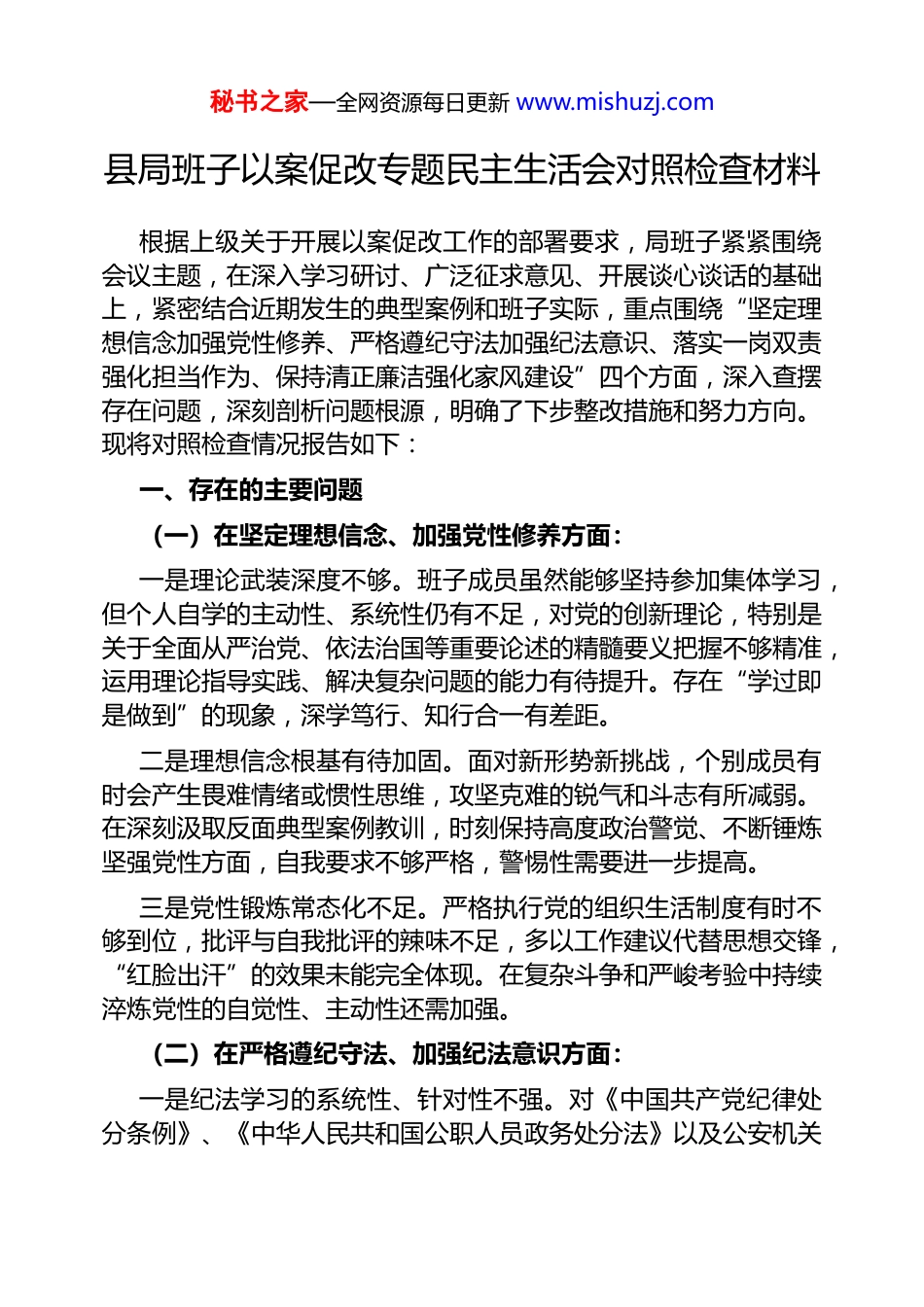 秘书之家—全网资源每日更新 www.mishuzj.com县局班子以案促改专题民主生活会对照检查材料根据上级关于开展以案促改工作的部署要求,局班子紧紧围绕会议主题,在深入学习研讨、广泛征求意见、开展谈心谈话的基础上,紧密结合近期发生的典型案例和班子实际,重点围绕“坚定理想信念加强党性修养、严格遵纪守法加强纪法意识、落实一岗双责强化担当作为、保持清正廉洁强化家风建设”四个方面,深入查摆存在问题,深刻剖析问题根源,明确了下步整改措施和努力方向。现将对照检查情况报告如下:一、存在的主要问题(一)在坚定理想信念、加强党性修养方面:一是理论武装深度不够。班子成员虽然能够坚持参加集体学习,但个人自学的主动性、系统性仍有不足,对党的创新理论,特别是关于全面从严治党、依法治国等重要论述的精髓要义把握不够精准,运用理论指导实践、解决复杂问题的能力有待提升。存在“学过即是做到”的现象,深学笃行、知行合一有差距。二是理想信念根基有待加固。面对新形势新挑战,个别成员有时会产生畏难情绪或惯性思维,攻坚克难的锐气和斗志有所减弱。在深刻汲取反面典型案例教训,时刻保持高度政治警觉、不断锤炼坚强党性方面,自我要求不够严格,警惕性需要进一步提高。三是党性锻炼常态化不足。严格执行党的组织生活制度有时不够到位,批评与自我批评的辣味不足,多以工作建议代替思想交锋,“红脸出汗”的效果未能完全体现。在复杂斗争和严峻考验中持续淬炼党性的自觉性、主动性还需加强。(二)在严格遵纪守法、加强纪法意识方面:一是纪法学习的系统性、针对性不强。对《中国共产党纪律处分条例》、《中华人民共和国公职人员政务处分法》以及公安机关秘书之家—全网资源每日更新 www.mishuzj.com内部各项纪律规定、执法规范的学习,有时满足于一般性了解,缺乏逐条逐款深入研究,对纪法界限的把握不够清晰、精准。二是法治思维和法治方式运用有欠缺。在指导分管领域工作时,有时过于强调效率和结果,对程序的合法性、规范性关注不够,存在一定的“重实体、轻程序”倾向。运用法治思维化解矛盾、维护稳定的能力需要进一步提升。三是内部监督执纪的刚性略显不足。对民警队伍的日常监督管理,虽然建立了制度,但在抓早抓小、防微杜渐方面力度不够,有时碍于情面,对苗头性、倾向性问题提醒批评多,动真碰硬、严肃处理少,未能完全发挥警示震慑作用。(三)在落实一岗双责、强化担当作为方面:一是责任压力传导存在衰减。班子成员对分管领域的业务工作抓得紧,但对党风廉政建设的重视程度和投入精力有时不够均衡,“一岗双责”意识有待进一步强化,压力向下传导不到位,存在“上热中温下冷”的现象。二是担当精神和斗争精神有待加强。面对历史遗留问题或难点堵点问题,有时存在求稳怕乱思想,主动啃硬骨头、打攻坚战的决心和魄力不足。在推动警务机制改革、提升警务效能等方面,创新意识和攻坚克难能力需进一步提升。三是队伍管理失之于宽、失之于软。对民警的日常教育管理监督不够严格细致,谈心谈话的深度和效果有待提高,对民警八小时以外的活动关注了解不够,未能完全掌握队伍的思想动态和廉政风险点。(四)在保持清正廉洁、强化家风建设方面:一是廉洁自律标准有待进一步提高。班子成员虽能守住底线,但在一些细节小事上自我要求不够严格,对社会上的一些不良风气警惕性不高,抵制不够坚决。在公务接待、公务用车等方面,有时存在打“擦边球”的现象。秘书之家—全网资源每日更新 www.mishuzj.com二是家风建设的主动性、自觉性不足。对家风建设的重要性认识不够到位,认为这是个人私事,主动教育、约束配偶、子女和身边工作人员的意识和措施不够有力,未能经常性地开展廉洁家风教育和提醒。三是自觉接受监督的意识不强。主动向组织汇报个人有关事项的自觉性有待提高,对于来自各方面监督有时存在习惯性“不适应”,听取干部群众意见建议不够虚心坦诚。二、产生问题的原因剖析深刻反思以上问题,其根源主要在于:一是理论武装抓得不紧,理想信念有所松动。对政治理论学习的重要性认识不足,缺乏“挤”和“钻”的精神,导致思想“总开关”拧得不够紧,理想...