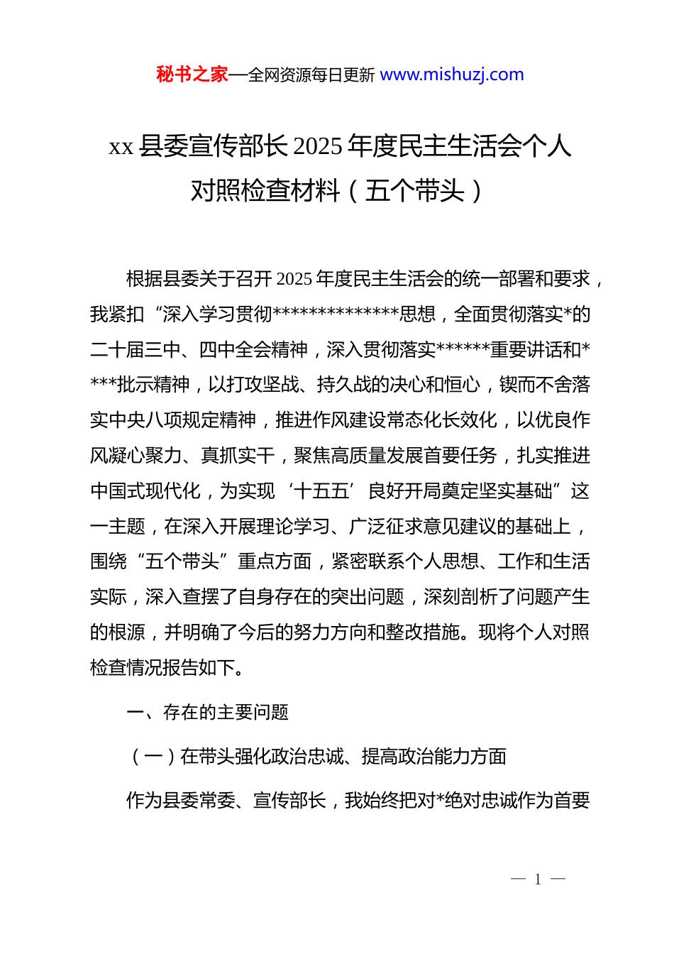 秘书之家—全网资源每日更新 www.mishuzj.comxx 县委宣传部长 2025 年度民主生活会个人对照检查材料(五个带头)根据县委关于召开 2025 年度民主生活会的统一部署和要求,我紧扣“深入学习贯彻**************思想,全面贯彻落实*的二十届三中、四中全会精神,深入贯彻落实******重要讲话和****批示精神,以打攻坚战、持久战的决心和恒心,锲而不舍落实中央八项规定精神,推进作风建设常态化长效化,以优良作风凝心聚力、真抓实干,聚焦高质量发展首要任务,扎实推进中国式现代化,为实现‘十五五’良好开局奠定坚实基础”这一主题,在深入开展理论学习、广泛征求意见建议的基础上,围绕“五个带头”重点方面,紧密联系个人思想、工作和生活实际,深入查摆了自身存在的突出问题,深刻剖析了问题产生的根源,并明确了今后的努力方向和整改措施。现将个人对照检查情况报告如下。一、存在的主要问题(一)在带头强化政治忠诚、提高政治能力方面作为县委常委、宣传部长,我始终把对*绝对忠诚作为首要— 1 —秘书之家—全网资源每日更新 www.mishuzj.com政治品质,深刻领悟“两个确立”的决定性意义,但在对标对表、知行合一上仍存在差距。一是政治判断力的敏锐性有待进一步增强。在面对意识形态领域的复杂形势时,虽然能够保持清醒头脑,坚守政治立场,但在预判网络舆情风险、洞察社会思潮潜在动向方面,前瞻性和穿透力还不够。例如,在 2025 年上半年,针对一些涉及我县重大项目建设的负面网络传言,虽然我们及时进行了正面回应和舆论引导,但事后复盘发现,未能提前对相关领域的社会心态和关注焦点进行深入研判,导致应对处置略显被动,未能第一时间抢占舆论引导的制高点,说明在从纷繁复杂的现象中见微知著、把握本质的政治判断力上还需持续锤炼。二是政治领悟力的穿透性有待进一步深化。在学习领会*的二十届四中全会精神的过程中,有时满足于对会议公报、决议等文本的通读和理解,但在将其蕴含的战略意图、政策导向与我县宣传思想文化工作的具体实践深度融合上,思考谋划的系统性和创造性还显不足。比如,在指导制定全县“十五五”文化发展规划初步构想时,虽然强调了要全面贯彻全会精神,但在如何将“发展新质生产力”的要求具体化为推动我县数字文化产业、文旅融合发展的创新路径和抓手方面,提出的思路和— 2 —秘书之家—全网资源每日更新 www.mishuzj.com举措还不够具体、精准,未能完全将中央的顶层设计转化为符合 xx 实际、可操作性强的工作方案。三是政治执行力的坚定性有待进一步提升。对中央、省委、市委和县委的决策部署,我始终做到不折不扣地贯彻执行。但在推动一些长期性、基础性工作时,有时存在“重部署、轻督导”的现象,导致工作成效未能达到最佳预期。以推进新时代文明实践中心建设为例,虽然年初制定了详尽的实施方案和考核标准,但在年中推进过程中,更多是通过会议调度和听取汇报来掌握进度,对部分乡镇存在的资源整合不到位、活动内容形式单一等深层次问题,未能及时通过“四下基层”的方式沉下去进行跟踪问"诊"、靶向"开方",导致政策执行的“最后一公里”存在堵点,影响了整体建设效能。(二)在带头固本培元、增强*性方面我始终坚持用**************思想武装头脑,锤炼*性,但对照共产*人精神追求的崇高标准,仍感到自身在固本培元、内外兼修上做得不够。一是理论学习的“钻劲”有所减弱。日常能够坚持参加中心组学习和个人自学,但有时存在实用主义倾向,对分管领域— 3 —秘书之家—全网资源每日更新 www.mishuzj.com的理论和政策学习得多、钻得深,而对经济、科技、法律等其他领域的知识学习不够系统、不够全面。在学习*章*规 dj 方面,更多时候是作为纪律要求来遵守,对其背后蕴含的马克思主义建*学说和*性原则思考感悟不深。这种学习上的不平衡、不深入,导致知识结构存在短板,在面对一些跨领域的复杂问题时,把握全局、融会贯通的能力受到一定影响。二是*性分析的“辣味”有所淡化。在参加组织生活时,能够坦诚地进行自我批评,但有时更多是谈工作中的不足,对思想深处、世界观改造方面的问题触及不深,缺乏“刮骨疗毒”的勇...