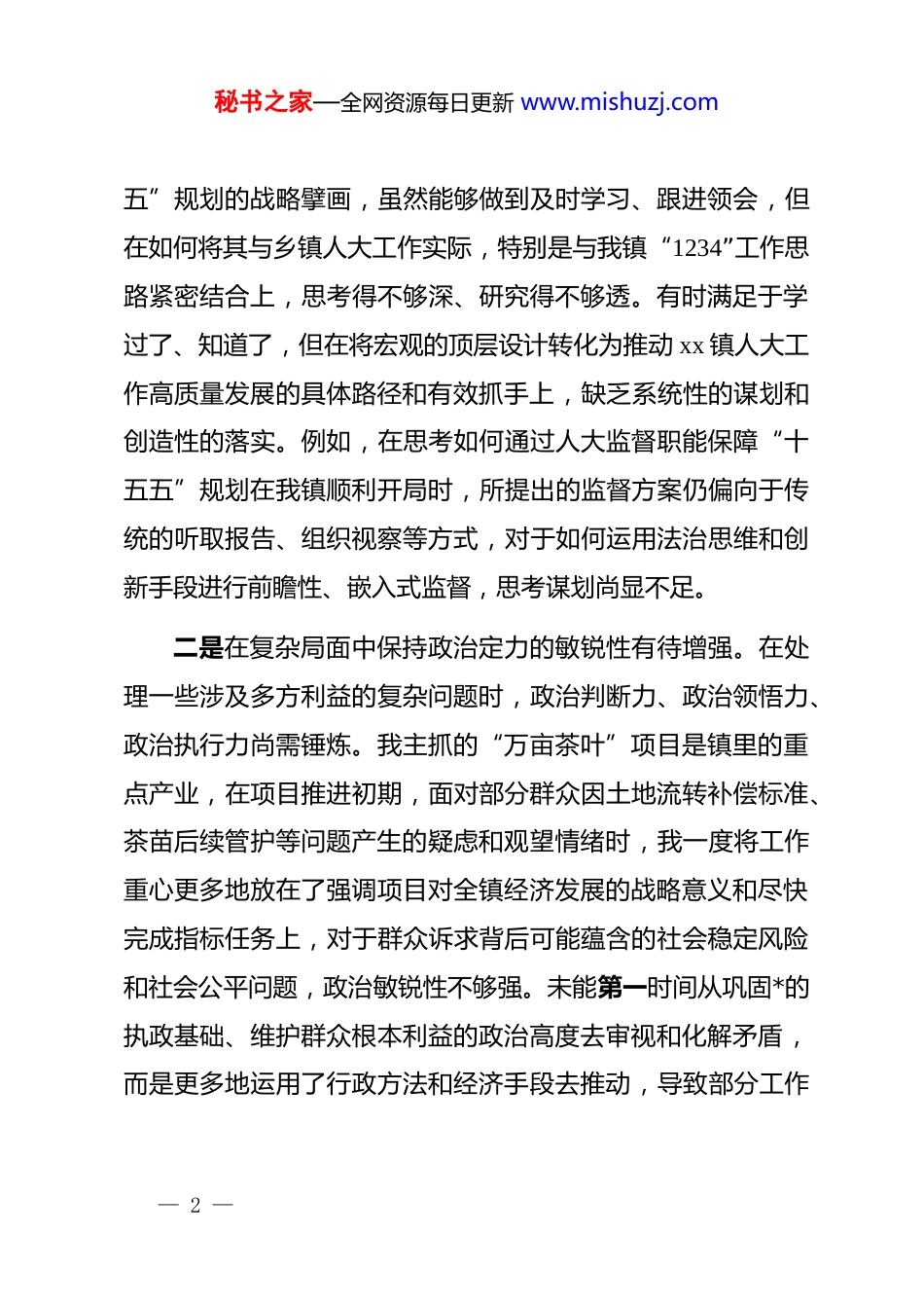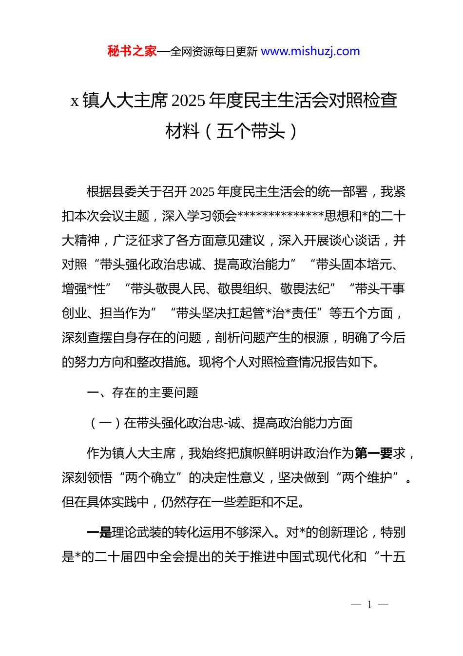 秘书之家—全网资源每日更新 www.mishuzj.comx 镇人大主席 2025 年度民主生活会对照检查材料(五个带头)根据县委关于召开 2025 年度民主生活会的统一部署,我紧扣本次会议主题,深入学习领会**************思想和*的二十大精神,广泛征求了各方面意见建议,深入开展谈心谈话,并对照“带头强化政治忠诚、提高政治能力”“带头固本培元、增强*性”“带头敬畏人民、敬畏组织、敬畏法纪”“带头干事创业、担当作为”“带头坚决扛起管*治*责任”等五个方面,深刻查摆自身存在的问题,剖析问题产生的根源,明确了今后的努力方向和整改措施。现将个人对照检查情况报告如下。一、存在的主要问题(一)在带头强化政治忠-诚、提高政治能力方面作为镇人大主席,我始终把旗帜鲜明讲政治作为第一要求,深刻领悟“两个确立”的决定性意义,坚决做到“两个维护”。但在具体实践中,仍然存在一些差距和不足。一是理论武装的转化运用不够深入。对*的创新理论,特别是*的二十届四中全会提出的关于推进中国式现代化和“十五— 1 —秘书之家—全网资源每日更新 www.mishuzj.com五”规划的战略擘画,虽然能够做到及时学习、跟进领会,但在如何将其与乡镇人大工作实际,特别是与我镇“1234”工作思路紧密结合上,思考得不够深、研究得不够透。有时满足于学过了、知道了,但在将宏观的顶层设计转化为推动 xx 镇人大工作高质量发展的具体路径和有效抓手上,缺乏系统性的谋划和创造性的落实。例如,在思考如何通过人大监督职能保障“十五五”规划在我镇顺利开局时,所提出的监督方案仍偏向于传统的听取报告、组织视察等方式,对于如何运用法治思维和创新手段进行前瞻性、嵌入式监督,思考谋划尚显不足。二是在复杂局面中保持政治定力的敏锐性有待增强。在处理一些涉及多方利益的复杂问题时,政治判断力、政治领悟力、政治执行力尚需锤炼。我主抓的“万亩茶叶”项目是镇里的重点产业,在项目推进初期,面对部分群众因土地流转补偿标准、茶苗后续管护等问题产生的疑虑和观望情绪时,我一度将工作重心更多地放在了强调项目对全镇经济发展的战略意义和尽快完成指标任务上,对于群众诉求背后可能蕴含的社会稳定风险和社会公平问题,政治敏锐性不够强。未能第一时间从巩固*的执政基础、维护群众根本利益的政治高度去审视和化解矛盾,而是更多地运用了行政方法和经济手段去推动,导致部分工作— 2 —秘书之家—全网资源每日更新 www.mishuzj.com走了弯路,虽然最终解决了问题,但反映出我在运用政治眼光观察和分析实际问题上的火候还不够。三是政治执行力在打通“最后一公里”上存在短板。对中央、省市县委和镇*委的决策部署,我能够做到坚决贯彻、令行禁止,但在推动这些决策在人大工作中落地生根、开花结果的全过程中,还存在跟踪问效不够紧、督促检查不够严的情况。例如,在推进“高质量发展,代表在行动”主题活动中,虽然年初制定了详实的活动方案,也组织了多次集中活动但在推动代表小组和代表个人常态化、长效化履职上,抓得还不够实。有时满足于活动的场面和声势,对于代表们提出的意见建议是否真正得到承办单位的有效解决,后续的跟踪监督力度有所减弱,导致一些好的建议未能完全转化为推动发展的实际成效,政治执行的闭环未能完全形成。(二)在带头固本培元、增强*性方面我始终牢记自己的第一身份是共产*员,注重在严肃的*内政治生活中锤炼*性。但深刻反思,对照更高标准,仍有一些方面做得不到位。一是参加双重组织生活的角色定位偶有偏差。作为镇领导— 3 —秘书之家—全网资源每日更新 www.mishuzj.com班子成员,能够严格执行双重组织生活制度,按时参加所在支部的“三会一课”和主题*日活动。但有时不自觉地带着“领导”的身份听取汇报、发表指导性意见较多,而以一名普通*员身份进行深刻的自我剖析、诚恳地听取他人批评意见做得不够。在支部组织生活会上,考虑到自己作为人大主席的身份,有时发言会不自觉地多谈工作成绩、多讲客观理由,对自身思想深处的问题触及不够,自我批评的“辣味”不足,在一定程度上影响了组织生活的政治性、时代性、原则性和战斗性。二是在践行初心使...