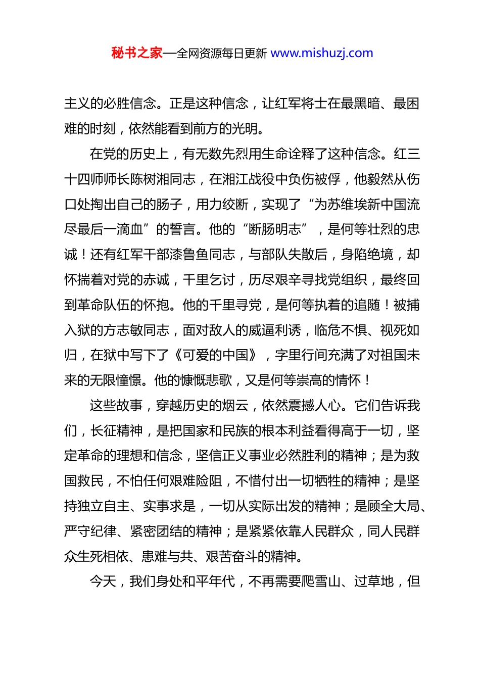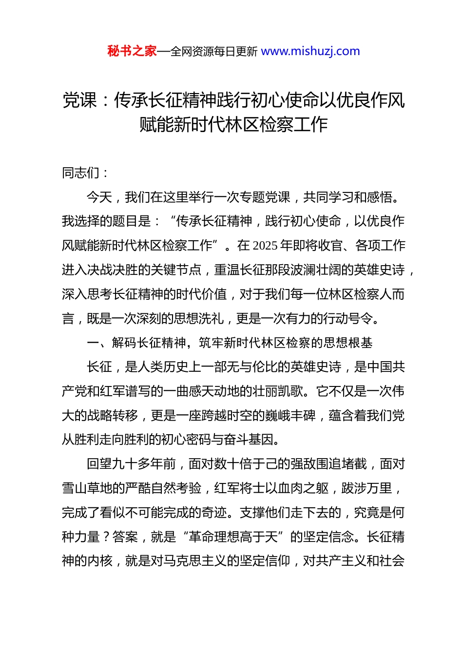 秘书之家—全网资源每日更新 www.mishuzj.com党课:传承长征精神践行初心使命以优良作风赋能新时代林区检察工作 同志们:今天,我们在这里举行一次专题党课,共同学习和感悟。我选择的题目是:“传承长征精神,践行初心使命,以优良作风赋能新时代林区检察工作”。在 2025 年即将收官、各项工作进入决战决胜的关键节点,重温长征那段波澜壮阔的英雄史诗,深入思考长征精神的时代价值,对于我们每一位林区检察人而言,既是一次深刻的思想洗礼,更是一次有力的行动号令。一、解码长征精神,筑牢新时代林区检察的思想根基长征,是人类历史上一部无与伦比的英雄史诗,是中国共产党和红军谱写的一曲感天动地的壮丽凯歌。它不仅是一次伟大的战略转移,更是一座跨越时空的巍峨丰碑,蕴含着我们党从胜利走向胜利的初心密码与奋斗基因。回望九十多年前,面对数十倍于己的强敌围追堵截,面对雪山草地的严酷自然考验,红军将士以血肉之躯,跋涉万里,完成了看似不可能完成的奇迹。支撑他们走下去的,究竟是何种力量?答案,就是“革命理想高于天”的坚定信念。长征精神的内核,就是对马克思主义的坚定信仰,对共产主义和社会秘书之家—全网资源每日更新 www.mishuzj.com主义的必胜信念。正是这种信念,让红军将士在最黑暗、最困难的时刻,依然能看到前方的光明。在党的历史上,有无数先烈用生命诠释了这种信念。红三十四师师长陈树湘同志,在湘江战役中负伤被俘,他毅然从伤口处掏出自己的肠子,用力绞断,实现了“为苏维埃新中国流尽最后一滴血”的誓言。他的“断肠明志”,是何等壮烈的忠诚!还有红军干部漆鲁鱼同志,与部队失散后,身陷绝境,却怀揣着对党的赤诚,千里乞讨,历尽艰辛寻找党组织,最终回到革命队伍的怀抱。他的千里寻党,是何等执着的追随!被捕入狱的方志敏同志,面对敌人的威逼利诱,临危不惧、视死如归,在狱中写下了《可爱的中国》,字里行间充满了对祖国未来的无限憧憬。他的慷慨悲歌,又是何等崇高的情怀!这些故事,穿越历史的烟云,依然震撼人心。它们告诉我们,长征精神,是把国家和民族的根本利益看得高于一切,坚定革命的理想和信念,坚信正义事业必然胜利的精神;是为救国救民,不怕任何艰难险阻,不惜付出一切牺牲的精神;是坚持独立自主、实事求是,一切从实际出发的精神;是顾全大局、严守纪律、紧密团结的精神;是紧紧依靠人民群众,同人民群众生死相依、患难与共、艰苦奋斗的精神。今天,我们身处和平年代,不再需要爬雪山、过草地,但秘书之家—全网资源每日更新 www.mishuzj.com我们同样面临着一场新的长征。对于我们 XX 林区检察院而言,这场新长征,就是守护好 XX 林区这一重要的国家生态安全屏障,用法治力量捍卫绿水青山。深学细悟长征精神,绝不是一句空洞的政治口号,而是我们精准履职、守护林区的现实需要和强大动力。它要求我们必须具备绝对忠诚的政治品格,确保检察权始终牢牢掌握在党和人民手中;它要求我们必须具备攻坚克难的斗争意志,直面生态保护领域的各种顽瘴痼疾;它要求我们必须具备求真务实的工作作风,把每一项检察工作都做深做实。长征精神,是我们这支队伍的魂与根,是我们战胜一切困难挑战的思想基石。二、践行初心使命,聚焦林区检察主责主业走好新长征路长征精神不仅是砥砺我们初心的精神滋养,更是推动林区检察工作提质增效的实践指引。我们脚下的 XX 林区,是我国西部重要的生态屏障和水源涵养地,它的生态状况,不仅关乎区域的生态平衡,更直接关乎下游数千万人民群众的切身利益和国家长远发展的战略大局。我们作为林区的“生态卫士”和“法律卫士”,使命光荣,责任重大。走好新时代林区检察的“长征路”,就是要将传承长征精神与践行习近平生态文明思想、习近平法治思想紧密结合起来,聚焦主责主业,以“守土有责、守土尽责”的担当,履行好党和人民赋予我们的神圣职秘书之家—全网资源每日更新 www.mishuzj.com责。(一)以长征的攻坚精神,深化“四大检察”协同履职。长征途中,红军面对的是立体化的围剿。今天,破坏生态环境的违法犯罪也呈现出复杂化、链条化的特征。我们必须打破思维定势和部门壁垒,统...