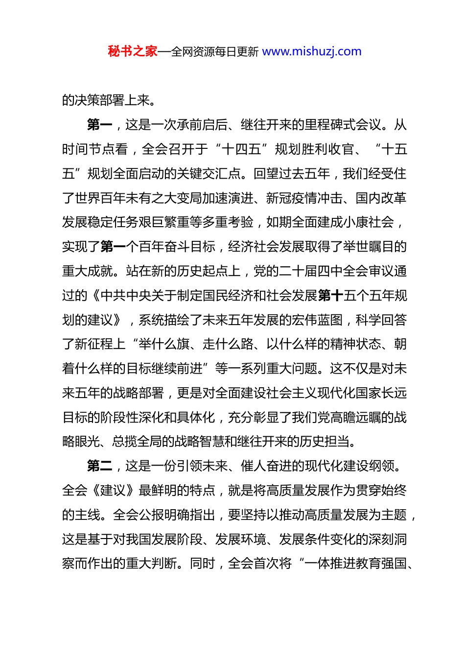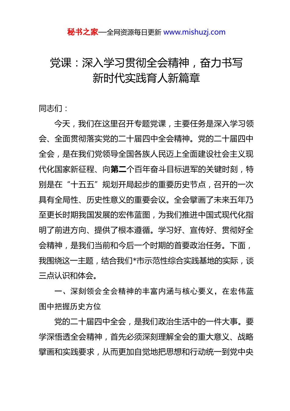 秘书之家—全网资源每日更新 www.mishuzj.com党课:深入学习贯彻全会精神,奋力书写新时代实践育人新篇章 同志们:今天,我们在这里召开专题党课,主要任务是深入学习领会、全面贯彻落实党的二十届四中全会精神。党的二十届四中全会,是在我们党领导全国各族人民迈上全面建设社会主义现代化国家新征程、向第二个百年奋斗目标进军的关键时刻,特别是在“十五五”规划开局起步的重要历史节点,召开的一次具有全局性、历史性意义的重要会议。全会擘画了未来五年乃至更长时期我国发展的宏伟蓝图,为我们推进中国式现代化指明了前进方向、提供了根本遵循。学习好、宣传好、贯彻好全会精神,是我们当前和今后一个时期的首要政治任务。下面,我围绕这一主题,结合我们*市示范性综合实践基地的实际,谈三点认识和体会。一、深刻领会全会精神的丰富内涵与核心要义,在宏伟蓝图中把握历史方位党的二十届四中全会,是我们政治生活中的一件大事。要学深悟透全会精神,首先必须深刻理解全会的重大意义、战略擘画和实践要求,从而更加自觉地把思想和行动统一到党中央秘书之家—全网资源每日更新 www.mishuzj.com的决策部署上来。第一,这是一次承前启后、继往开来的里程碑式会议。从时间节点看,全会召开于“十四五”规划胜利收官、“十五五”规划全面启动的关键交汇点。回望过去五年,我们经受住了世界百年未有之大变局加速演进、新冠疫情冲击、国内改革发展稳定任务艰巨繁重等多重考验,如期全面建成小康社会,实现了第一个百年奋斗目标,经济社会发展取得了举世瞩目的重大成就。站在新的历史起点上,党的二十届四中全会审议通过的《中共中央关于制定国民经济和社会发展第十五个五年规划的建议》,系统描绘了未来五年发展的宏伟蓝图,科学回答了新征程上“举什么旗、走什么路、以什么样的精神状态、朝着什么样的目标继续前进”等一系列重大问题。这不仅是对未来五年的战略部署,更是对全面建设社会主义现代化国家长远目标的阶段性深化和具体化,充分彰显了我们党高瞻远瞩的战略眼光、总揽全局的战略智慧和继往开来的历史担当。第二,这是一份引领未来、催人奋进的现代化建设纲领。全会《建议》最鲜明的特点,就是将高质量发展作为贯穿始终的主线。全会公报明确指出,要坚持以推动高质量发展为主题,这是基于对我国发展阶段、发展环境、发展条件变化的深刻洞察而作出的重大判断。同时,全会首次将“一体推进教育强国、秘书之家—全网资源每日更新 www.mishuzj.com科技强国、人才强国建设”作为独立部分进行系统部署,将教育的地位和作用提升到了前所未有的战略高度。这深刻揭示了教育、科技、人才在中国式现代化建设中的基础性、战略性支撑作用。教育是根基,科技是核心,人才是关键,三者相互依存、相互促进,共同构成国家竞争力的核心要素。这一战略部署,不仅为我国在激烈国际竞争中赢得主动、抢占未来发展制高点提供了根本指引,也为我们教育工作者指明了奋斗方向和核心使命,那就是必须把教育事业放在“国之大者”中去考量,为国家发展源源不断地培养和输送高素质人才。第三,这是一套为党育人、为国育才的教育发展行动指南。全会精神,特别是《建议》中关于教育的论述,深刻回答了“强国建设、教育何为”这一时代课题。全会强调要“办好人民满意的教育”,深刻揭示了我们教育事业的政治属性、人民属性和战略属性。政治属性,要求我们必须坚持党对教育事业的全面领导,牢牢把握社会主义办学方向,确保教育领域始终是坚持党的领导的坚强阵地。人民属性,要求我们必须坚持以人民为中心发展教育,着力解决人民群众急难愁盼的教育问题,推动教育资源更加公平、教育质量更高水平,让每个孩子都能享有公平而有质量的教育。战略属性,要求我们必须深刻理解教育在推动人的全面发展、服务经济社会发展、增强国家核心秘书之家—全网资源每日更新 www.mishuzj.com竞争力中的重要作用,自觉将教育发展融入国家发展大局。我们实践基地的根本任务就是“立德树人、实践育人”,全会的这些重要论述,为我们进一步明确办学方向、深化教育改革、提升育人质量提供了最直接、最权威的遵循。二、全面回顾“...