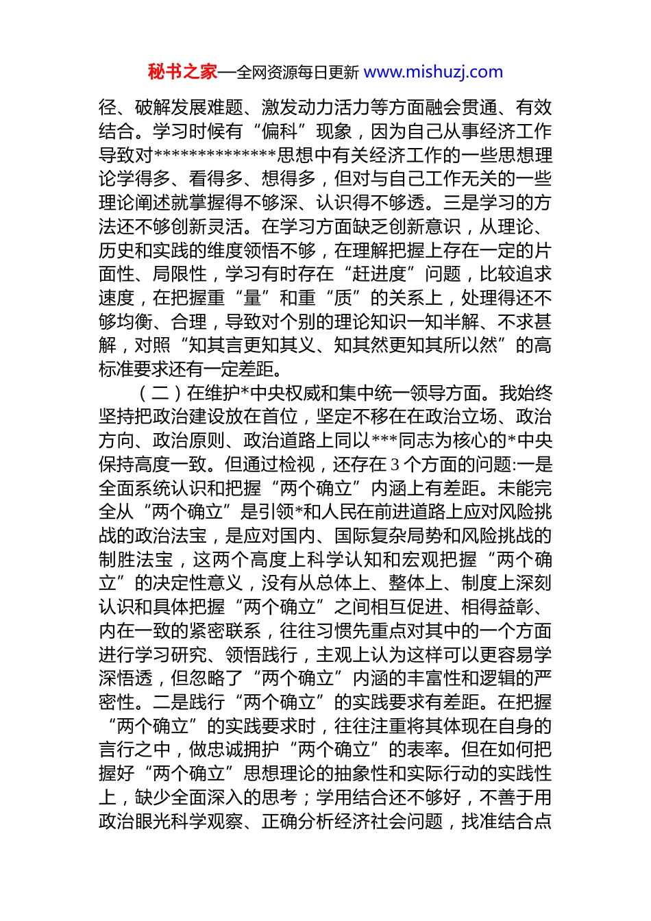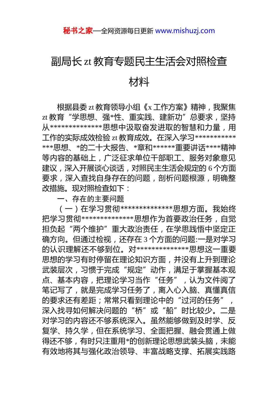 秘书之家—全网资源每日更新 www.mishuzj.com副局长 zt 教育专题民主生活会对照检查材料根据县委 zt 教育领导小组《x 工作方案》精神,我聚焦zt 教育“学思想、强*性、重实践、建新功”总要求,坚持从**************思想中汲取奋发进取的智慧和力量,用工作的实际成效检验 zt 教育成效。在深入学习**************思想、*的二十大报告、*章和******重要讲话****精神等内容的基础上,广泛征求单位干部职工、服务对象意见建议,深入开展谈心谈话,对照民主生活会规定的 6 个方面要求,深入查找自身存在的问题,剖析问题根源,明确整改措施。现对照检查如下:一、存在的主要问题(一)在学习贯彻**************思想方面。我始终把学习贯彻**************思想作为首要政治任务,自觉担负起“两个维护”重大政治责任,在学思践悟中坚定正确方向。但通过检视,还存在 3 个方面的问题:一是对学习的认识理解还不够到位。对**************思想这一重要思想的学习有时停留在理论知识方面,并没有上升到理论武装层次,习惯于完成“规定”动作,满足于掌握基本观点、基本内容,把理论学习当作“任务”,认为文件阅了笔记写了,就是完成学习任务了,离入心入脑、真懂真信的要求还有差距;常常只看到理论中的“过河的任务”,深入找寻如何解决问题的“桥”或“船”时比较少。二是对学习的内容还不够系统深入。虽然能够做到及时学、反复学、持久学,但在系统学习、全面把握、融会贯通上做得还不够,有时只注重用*的创新理论思想武装头脑,未能有效地将其与强化政治领导、丰富战略支撑、拓展实践路秘书之家—全网资源每日更新 www.mishuzj.com径、破解发展难题、激发动力活力等方面融会贯通、有效结合。学习时候有“偏科”现象,因为自己从事经济工作导致对**************思想中有关经济工作的一些思想理论学得多、看得多、想得多,但对与自己工作无关的一些理论阐述就掌握得不够深、认识得不够透。三是学习的方法还不够创新灵活。在学习方面缺乏创新意识,从理论、历史和实践的维度领悟不够,在理解把握上存在一定的片面性、局限性,学习有时存在“赶进度”问题,比较追求速度,在把握重“量”和重“质”的关系上,处理得还不够均衡、合理,导致对个别的理论知识一知半解、不求甚解,对照“知其言更知其义、知其然更知其所以然”的高标准要求还有一定差距。(二)在维护*中央权威和集中统一领导方面。我始终坚持把政治建设放在首位,坚定不移在在政治立场、政治方向、政治原则、政治道路上同以***同志为核心的*中央保持高度一致。但通过检视,还存在 3 个方面的问题:一是全面系统认识和把握“两个确立”内涵上有差距。未能完全从“两个确立”是引领*和人民在前进道路上应对风险挑战的政治法宝,是应对国内、国际复杂局势和风险挑战的制胜法宝,这两个高度上科学认知和宏观把握“两个确立”的决定性意义,没有从总体上、整体上、制度上深刻认识和具体把握“两个确立”之间相互促进、相得益彰、内在一致的紧密联系,往往习惯先重点对其中的一个方面进行学习研究、领悟践行,主观上认为这样可以更容易学深悟透,但忽略了“两个确立”内涵的丰富性和逻辑的严密性。二是践行“两个确立”的实践要求有差距。在把握“两个确立”的实践要求时,往往注重将其体现在自身的言行之中,做忠诚拥护“两个确立”的表率。但在如何把握好“两个确立”思想理论的抽象性和实际行动的实践性上,缺少全面深入的思考;学用结合还不够好,不善于用政治眼光科学观察、正确分析经济社会问题,找准结合点秘书之家—全网资源每日更新 www.mishuzj.com融入业务工作等方面存在一定不足,政治态度与实际行动未能达到高度的统一性和一致性。三是推动上级决策部署落实还有差距。能够认真贯彻执行中央、省、市和县委各项决策部署,但仍有一些工作还存在标准不高、措施不实的问题,个别工作在推进过程中,仍然存在思想不重视、贯彻不深入、落实打折扣的现象,对上级来文满足于“轮流圈阅”“层层转发”“安排部署”,亲自研究、督查落实不够,导致一些决策落实效果不好,在推进上级部署落实上还存在一定差距。(三)...