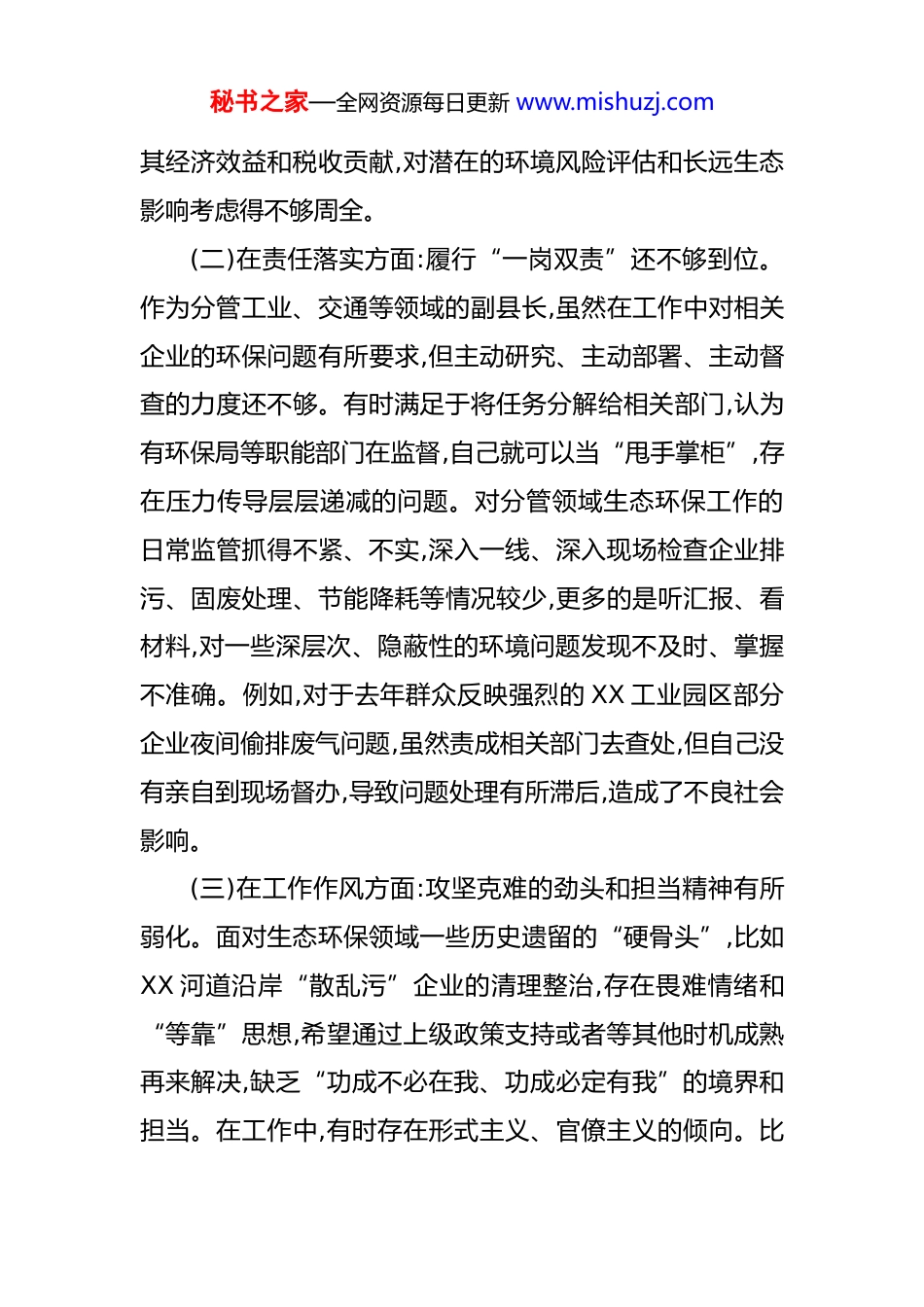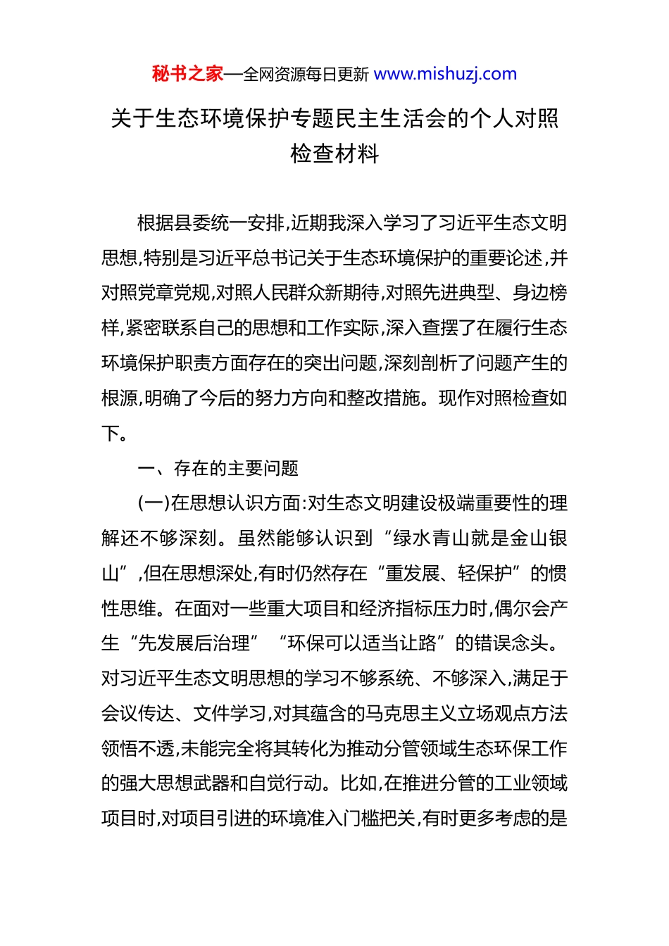 秘书之家—全网资源每日更新 www.mishuzj.com关于生态环境保护专题民主生活会的个人对照检查材料 根据县委统一安排,近期我深入学习了习近平生态文明思想,特别是习近平总书记关于生态环境保护的重要论述,并对照党章党规,对照人民群众新期待,对照先进典型、身边榜样,紧密联系自己的思想和工作实际,深入查摆了在履行生态环境保护职责方面存在的突出问题,深刻剖析了问题产生的根源,明确了今后的努力方向和整改措施。现作对照检查如下。一、存在的主要问题(一)在思想认识方面:对生态文明建设极端重要性的理解还不够深刻。虽然能够认识到“绿水青山就是金山银山”,但在思想深处,有时仍然存在“重发展、轻保护”的惯性思维。在面对一些重大项目和经济指标压力时,偶尔会产生“先发展后治理”“环保可以适当让路”的错误念头。对习近平生态文明思想的学习不够系统、不够深入,满足于会议传达、文件学习,对其蕴含的马克思主义立场观点方法领悟不透,未能完全将其转化为推动分管领域生态环保工作的强大思想武器和自觉行动。比如,在推进分管的工业领域项目时,对项目引进的环境准入门槛把关,有时更多考虑的是秘书之家—全网资源每日更新 www.mishuzj.com其经济效益和税收贡献,对潜在的环境风险评估和长远生态影响考虑得不够周全。(二)在责任落实方面:履行“一岗双责”还不够到位。作为分管工业、交通等领域的副县长,虽然在工作中对相关企业的环保问题有所要求,但主动研究、主动部署、主动督查的力度还不够。有时满足于将任务分解给相关部门,认为有环保局等职能部门在监督,自己就可以当“甩手掌柜”,存在压力传导层层递减的问题。对分管领域生态环保工作的日常监管抓得不紧、不实,深入一线、深入现场检查企业排污、固废处理、节能降耗等情况较少,更多的是听汇报、看材料,对一些深层次、隐蔽性的环境问题发现不及时、掌握不准确。例如,对于去年群众反映强烈的 XX 工业园区部分企业夜间偷排废气问题,虽然责成相关部门去查处,但自己没有亲自到现场督办,导致问题处理有所滞后,造成了不良社会影响。(三)在工作作风方面:攻坚克难的劲头和担当精神有所弱化。面对生态环保领域一些历史遗留的“硬骨头”,比如XX 河道沿岸“散乱污”企业的清理整治,存在畏难情绪和“等靠”思想,希望通过上级政策支持或者等其他时机成熟再来解决,缺乏“功成不必在我、功成必定有我”的境界和担当。在工作中,有时存在形式主义、官僚主义的倾向。比秘书之家—全网资源每日更新 www.mishuzj.com如,在部署环保工作时,开会多、发文多,但后续的跟踪问效、闭环管理做得不够。下基层调研时,有时“走马观花”,与企业负责人、一线工人、周边群众的深入交流不多,对真实情况的了解不够全面、不够接地气,导致一些决策和措施未能完全切中要害。(四)在能力本领方面:运用法治思维和市场化手段解决环保问题的能力有待提升。对新修订的《环境保护法》等法律法规的学习研究不够深入,运用法治手段解决复杂环境问题的意识和能力不强。在处理一些环保纠纷时,习惯于用行政命令的方式,而对于如何通过法律途径、经济杠杆来引导和约束企业行为,思考和探索不够。对于绿色金融、碳排放权交易、生态补偿等市场化、生态化的治理方式,了解不深,实践不多,未能有效将其运用到分管领域的工作中,推动产业绿色转型升级的思路和办法还比较单一。二、产生问题的原因剖析深刻反思以上问题,根源主要在以下几个方面:(一)理论学习有所松懈,理想信念不够牢固。根本原因在于对政治理论学习的重要性认识不足,未能持之以恒地用习近平新时代中国特色社会主义思想,特别是习近平生态文明思想来武装头脑、指导实践。学习存在片面性和实用主义,与工作联系紧密的就多学一点,联系不大的就少学一些,导秘书之家—全网资源每日更新 www.mishuzj.com致对生态文明建设这一“国之大者”的理解停留在概念层面,未能从中华民族永续发展的高度来把握其深刻内涵,导致思想上出现偏差,行动上出现差距。(二)宗旨意识有所淡化,群众立场不够坚定。随着工作岗位的变化和工作环境的改变,深入基层、深入群众的时间相对减少,与群众的直接联系不如以往紧密。对群众反映的生态环境问题,虽然也重视,但...
