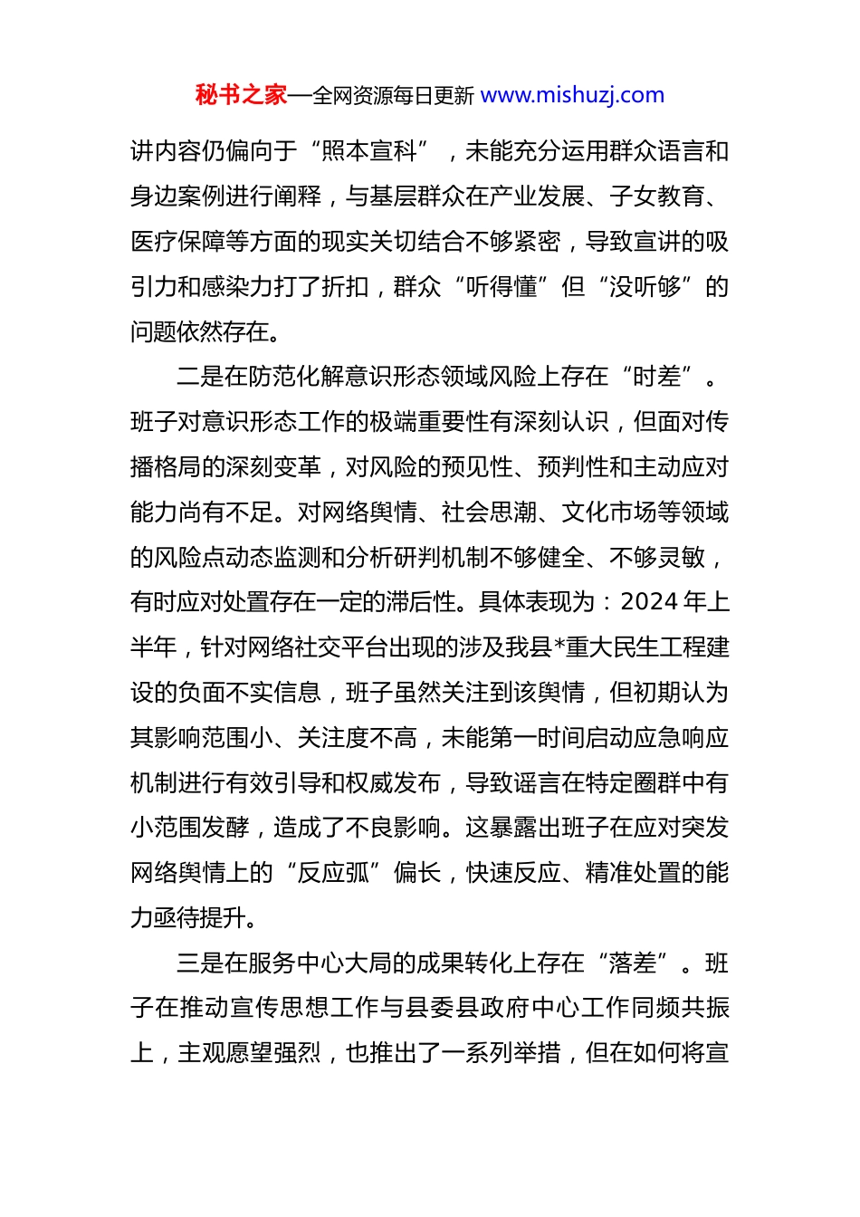秘书之家—全网资源每日更新 www.mishuzj.com县委宣传部领导班子关于巡察整改专题民主生活会对照检查材料 根据县委关于巡察整改工作的统一部署和本次专题民主生活会的具体安排,*县委宣传部领导班子紧紧围绕县委第*巡察组反馈的意见,坚持问题导向,结合思想和工作实际,深入开展学习研讨,广泛征求意见建议,严肃进行谈心谈话,全面查摆突出问题,深刻剖析问题根源,并明确了今后的整改方向与具体措施。现将班子对照检查情况报告如下。一、对照巡察反馈意见查摆出的主要问题(一)聚焦基层贯彻落实党的理论路线方针政策和党中央决策部署和省委市委县委工作情况方面一是在推动理论武装入脑入心上存在“温差”。班子在组织推动党的创新理论学习宣传贯彻上,虽然能够做到迅速部署、全面覆盖,但在提升理论武装的“穿透力”和“转化率”上仍有不足,存在“上热中温下冷”的现象。对理论宣传如何更精准地对接基层干部群众的思想实际和现实需求,研究得不够深、不够透。具体表现为:在组织开展的“新思想润*”系列百姓宣讲活动中,尽管覆盖面广、场次多,但巡察反馈和基层调研发现,部分场次的宣秘书之家—全网资源每日更新 www.mishuzj.com讲内容仍偏向于“照本宣科”,未能充分运用群众语言和身边案例进行阐释,与基层群众在产业发展、子女教育、医疗保障等方面的现实关切结合不够紧密,导致宣讲的吸引力和感染力打了折扣,群众“听得懂”但“没听够”的问题依然存在。二是在防范化解意识形态领域风险上存在“时差”。班子对意识形态工作的极端重要性有深刻认识,但面对传播格局的深刻变革,对风险的预见性、预判性和主动应对能力尚有不足。对网络舆情、社会思潮、文化市场等领域的风险点动态监测和分析研判机制不够健全、不够灵敏,有时应对处置存在一定的滞后性。具体表现为:2024 年上半年,针对网络社交平台出现的涉及我县*重大民生工程建设的负面不实信息,班子虽然关注到该舆情,但初期认为其影响范围小、关注度不高,未能第一时间启动应急响应机制进行有效引导和权威发布,导致谣言在特定圈群中有小范围发酵,造成了不良影响。这暴露出班子在应对突发网络舆情上的“反应弧”偏长,快速反应、精准处置的能力亟待提升。三是在服务中心大局的成果转化上存在“落差”。班子在推动宣传思想工作与县委县政府中心工作同频共振上,主观愿望强烈,也推出了一系列举措,但在如何将宣秘书之家—全网资源每日更新 www.mishuzj.com传的“软实力”有效转化为推动经济社会高质量发展的“硬支撑”上,谋划不够系统,抓手不够有力,成果转化不够明显。具体表现为:在围绕我县“*生态康养旅游示范区”建设的对外宣传工作中,虽然在多家主流媒体进行了宣传报道,营造了良好氛围,但在深度挖掘*康养文化内涵、策划标志性文旅 IP、精准对接目标客源市场、吸引高端康养项目落地等方面的策略和力度有所欠缺。宣传工作更多停留在“广而告之”的层面,未能有效形成“引而促之”的发展实效,宣传优势向发展优势的转化通道不畅。(二)聚焦群众身边腐败问题和不正之风,推动全面从严治党向基层延伸方面一是文风会风整治不够彻底,形式主义顽疾仍需深化纠治。班子带头贯彻落实中央八项规定及其实施细则精神,但在力戒形式主义、官僚主义方面,标准还不够高,要求还不够严。有时仍存在以文件落实文件、以会议落实会议的现象,对基层的一些“指尖上的形式主义”监督纠治不够有力。具体表现为:在 2025 年初部署全县精神文明创建工作中,下发的相关文件和方案中,对各乡镇(街道)和县直单位的任务分解指标过多、过细,要求报送的台账资料名目繁多,增加了基层单位整理材料、应付检查的负担。班子成员在下基层调研时,虽然也能发现这一问秘书之家—全网资源每日更新 www.mishuzj.com题,但未能及时推动从源头上进行精简和优化,反映出在为基层减负工作中,动真碰硬的决心和力度尚有不足。二是对宣传文化领域项目资金的监管存在薄弱环节。随着我县文化事业的繁荣发展,宣传文化领域的专项资金和项目逐年增多。班子在项目审批和资金拨付环节能够严格把关,但在项目实施过程的全程监督和项目完成后的绩效...