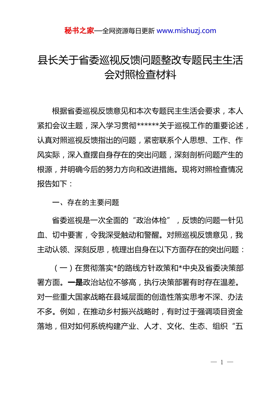秘书之家—全网资源每日更新 www.mishuzj.com县长关于省委巡视反馈问题整改专题民主生活会对照检查材料根据省委巡视反馈意见和本次专题民主生活会要求,本人紧扣会议主题,深入学习贯彻******关于巡视工作的重要论述,认真对照巡视反馈指出的问题,紧密联系个人思想、工作、作风实际,深入查摆自身存在的突出问题,深刻剖析问题产生的根源,并明确今后的努力方向和改进措施。现将对照检查情况报告如下:一、存在的主要问题省委巡视是一次全面的“政治体检”,反馈的问题一针见血、切中要害,令我深受触动和警醒。对照巡视反馈意见,我主动认领、深刻反思,梳理出自身在以下方面存在的突出问题:(一)在贯彻落实*的路线方针政策和*中央及省委决策部署方面。一是政治站位不够高,执行决策部署有时存在温差。对一些重大国家战略在县域层面的创造性落实思考不深、办法不多。例如,在推动乡村振兴战略时,有时过于强调项目资金落地,但对如何系统构建产业、人才、文化、生态、组织“五— 1 —秘书之家—全网资源每日更新 www.mishuzj.com个振兴”协同机制缺乏深度谋划,存在“碎片化”推进现象。二是新发展理念树得不牢,推动高质量发展有偏差。有时未能完全摆脱“速度情结”和“路径依赖”,在面对经济下行压力时,曾有过“先上车、后补票”的念头,对个别高能耗、环保门槛低的项目一度态度暧昧。例如,去年在研判一个传统建材扩建项目时,虽知其环保压力大,但考虑到短期税收和就业,未能第一时间坚决否决,后经上级环保部门预警才叫停。三是防范化解重大风险意识不强,存在麻痹思想。对县域内隐性债务风险认识不足,化解措施偏软。例如,曾对个别平台公司通过复杂融资结构变相举债行为监管不到位,未能及时预警并采取强硬干预措施,导致债务化解窗口期被延误。四是意识形态工作责任制落实不到位。对分管领域和部门意识形态阵地管理抓得不紧,定期分析研判不够。例如,对县政府门户网站、政务新媒体发布内容的审核把关有时依赖部门,亲自过问、抽查少,曾出现个别信息表述不严谨的问题。五是执行民主集中制有时不够充分。在县政府常务会议上,对一些自认为比较成熟、紧急的事项,有时讨论不够充分,听取班子成员意见的耐心不足。例如,在某次研究城市拆迁补偿标准调整方案时,因时间紧,会前沟通酝酿不足,会上未能充分吸纳不同意见,导致政策出台后引发了一些后续矛盾。— 2 —秘书之家—全网资源每日更新 www.mishuzj.com(二)在落实全面从严治*战略部署方面。一是履行“一岗双责”压力传导不足。对政府系统*风廉政建设满足于开会强调、签订责任书,对分管部门“一把手”的日常监督提醒不够经常、不够具体。例如,对某局主要领导出现的苗头性、倾向性问题,仅作了口头提醒,未进行严肃的批评教育和跟踪督促,后来该同志因其他违纪问题被查处。二是整治形式主义、官僚主义韧劲不足。对基层反映强烈的文山会海、过度留痕等问题,虽然部署了整治,但效果不彰。例如,要求精简会议,但有时为了体现“重视”,仍然召集乡镇主要负责同志参加一些可开可不开的会议,存在“以会议落实会议”现象。三是对重点领域廉政风险防控盯得不紧。对工程建设、土地出让、政府采购等领域的监管制度建设存在滞后,对关键岗位人员的廉政教育抓得不实。例如,县里某市政项目招投标过程中出现围标串标嫌疑,暴露出我对招投标监管环节的漏洞未能及时督促堵塞。四是主动接受监督意识不够强。对人大依法监督、政协民主监督、社会舆论监督有时存在“怕麻烦”心理,习惯于内部运转。例如,对人大代表提出的某个重点建议,满足于部门书面答复,未能亲自组织深入研究推动落实,导致问题解决不彻底。五是艰苦奋斗精神有所减退。在公务活动中,有时存在“爱面子”思想,对接待标准把关不够严格。例如,上级部门来县调研,有时担— 3 —秘书之家—全网资源每日更新 www.mishuzj.com心接待不周影响印象,默许了超标准安排就餐的情况。六是家风建设重视不够。对配偶、子女及身边工作人员的教育管理约束不够严格,有时对他们的社会交往过问不多。例如,有群众反映我的亲属利用影响力承揽小额工程,虽经查不属...