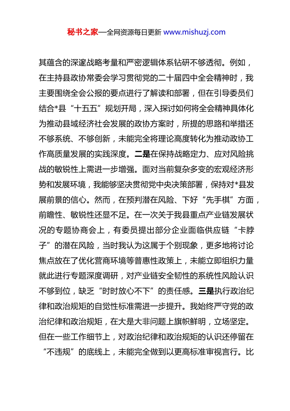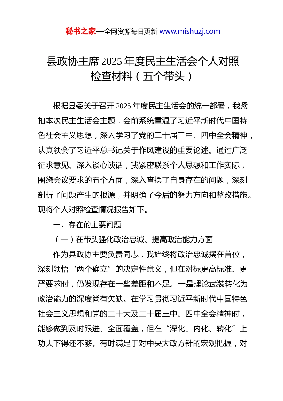 秘书之家—全网资源每日更新 www.mishuzj.com县政协主席 2025 年度民主生活会个人对照检查材料(五个带头)根据县委关于召开 2025 年度民主生活会的统一部署,我紧扣本次民主生活会主题,会前系统重温了习近平新时代中国特色社会主义思想,深入学习了党的二十届三中、四中全会精神,认真领会了习近平总书记关于作风建设的重要论述。通过广泛征求意见、深入谈心谈话,我紧密联系个人思想和工作实际,围绕会议要求的五个方面,深入查摆了自身存在的问题,深刻剖析了问题产生的根源,并明确了今后的努力方向和整改措施。现将个人对照检查情况报告如下。一、存在的主要问题(一)在带头强化政治忠诚、提高政治能力方面作为县政协主要负责同志,我始终将政治忠诚摆在首位,深刻领悟“两个确立”的决定性意义,但在对标更高标准、更严要求时,仍发现存在一些差距和不足。一是理论武装转化为政治能力的深度尚有欠缺。在学习贯彻习近平新时代中国特色社会主义思想和党的二十大及二十届三中、四中全会精神时,能够做到及时跟进、全面覆盖,但在“深化、内化、转化”上功夫下得还不够。有时满足于对中央大政方针的宏观把握,对秘书之家—全网资源每日更新 www.mishuzj.com其蕴含的深邃战略考量和严密逻辑体系钻研不够透彻。例如,在主持县政协常委会学习贯彻党的二十届四中全会精神时,我主要围绕全会公报的要点进行了解读和部署,但在引导委员们结合*县“十五五”规划开局,深入探讨如何将全会精神具体化为推动县域经济社会发展的政协方案时,所提的思路和举措还不够系统、不够创新,未能完全将理论高度转化为推动政协工作高质量发展的实践深度。二是在保持战略定力、应对风险挑战的敏锐性上需进一步增强。面对当前复杂多变的宏观经济形势和发展环境,我能够坚决贯彻党中央决策部署,保持对*县发展前景的信心。然而,在预判潜在风险、下好“先手棋”方面,前瞻性、敏锐性还显不足。在一次关于我县重点产业链发展状况的专题协商会上,有委员提出部分企业面临供应链“卡脖子”的潜在风险,当时我认为这属于个别现象,更多地将讨论焦点放在了优化营商环境等普惠性政策上,未能立即组织力量就此进行专题深度调研,对产业链安全韧性的系统性风险认识不够到位,缺乏“时时放心不下”的责任感。三是执行政治纪律和政治规矩的自觉性标准需进一步提升。我始终严守党的政治纪律和政治规矩,在大是大非问题上旗帜鲜明,立场坚定。但在一些工作细节上,对政治纪律和政治规矩的认识还停留在“不违规”的底线上,未能完全做到以更高标准审视言行。比秘书之家—全网资源每日更新 www.mishuzj.com如,在与一些企业家委员交流时,为了营造轻松氛围、体现亲和力,有时会过多地谈论市场行情和企业经营的“生意经”,而将政治理论、方针政策的学习交流“软化”处理,客观上弱化了对政协委员首先是政治身份的提醒和引导,未能时时处处体现出作为党内高级干部应有的政治严肃性。(二)在带头固本培元、增强党性方面我始终注重加强党性修养,但深刻反思,在持之以恒、常修常炼方面仍有差距,党性锤炼的主动性和自觉性还需加强。一是运用党的创新理论改造主观世界的力度不够。能够坚持参加党组理论学习中心组学习和个人自学,但在改造世界观、人生观、价值观这个“总开关”问题上,还存在学用脱节的现象。有时学习理论是为了应对工作需要,带着问题学、联系实际学做得不够,未能真正将学习成果转化为坚定的理想信念和强大的精神力量。例如,在学习党史过程中,我对革命先辈的崇高精神由衷敬佩,但较少把自己摆进去,深入思考在新的历史条件下,如何像先辈那样为了党和人民的事业攻坚克难,导致党性修养的提升更多停留在思想感悟层面,距离触及灵魂、融入血脉还有差距。二是弘扬共产党人精神追求的标杆作用发挥不充分。作为一名老党员,我自认为对党的精神谱系有较深理解和感悟。但在日常工作中,将这些伟大精神内化为行动自觉、秘书之家—全网资源每日更新 www.mishuzj.com外化为率先垂范做得还不够。在推进工作中遇到阻力时,有时会首先考虑如何调整方案、绕开障碍,而缺少了那么一股“明知山有虎、偏向虎山...