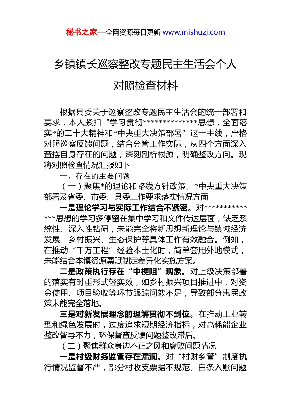 秘书之家—全网资源每日更新 www.mishuzj.com乡镇镇长巡察整改专题民主生活会个人对照检查材料根据县委关于巡察整改专题民主生活会的统一部署和要求,本人紧扣“学习贯彻**************思想,全面落实*的二十大精神和*中央重大决策部署”这一主线,严格对照巡察反馈问题,结合分管工作实际,从四个方面深入查摆自身存在的问题,深刻剖析根源,明确整改方向。现将对照检查情况汇报如下:一、存在的主要问题(一)聚焦*的理论和路线方针政策、*中央重大决策部署及省委、市委、县委工作要求落实情况方面一是理论学习与实际工作结合不紧密。对**************思想的学习多停留在集中学习和文件传达层面,缺乏系统性、深入性钻研,未能完全将新思想新理论与镇域经济发展、乡村振兴、生态保护等具体工作有效融合。例如,在推动“千万工程”经验本土化时,简单套用外地模式,未能结合本镇资源禀赋制定差异化实施方案。二是政策执行存在“中梗阻”现象。对上级决策部署的落实有时重形式轻实效,如乡村振兴项目推进中,对资金使用、项目验收等环节跟踪问效不足,导致部分惠民政策未能完全落地。三是对新发展理念的理解贯彻不到位。在推动工业转型和绿色发展时,过度追求短期经济指标,对高耗能企业整改督导不力,环保督查反馈问题整改滞后。(二)聚焦群众身边不正之风和腐败问题情况一是村级财务监管存在漏洞。对“村财乡管”制度执行情况监督不严,部分村收支票据不规范、白条入账问题秘书之家—全网资源每日更新 www.mishuzj.com突出,甚至出现公款私存、虚列支出套取资金等现象。二是集体“三资”管理不规范。对农村集体资产、资源、资金的台账建立不完善,部分资产流失严重(如集体山林、鱼塘承包程序不规范),资源租赁发包缺乏公开竞标,导致群众信访频发。三是民生领域微腐败纠治不力。对低保审批、危房改造等民生资金发放审核不严,曾出现优亲厚友、吃拿卡要等问题,虽经查处但未彻底根除。(三)聚焦基层*组织领导班子和干部队伍建设情况一是 dj 主体责任落实不到位。对村级*组织建设指导不足,部分村“两委”班子战斗力弱化,民主决策流于形式甚至出现“一言堂”现象。二是干部队伍建设缺乏长远规划。对年轻干部培养重视不够,村级财务人员业务素质参差不齐,且因待遇低、任务重导致人员流动频繁,影响工作连续性。三是*内政治生活不严肃。组织生活会批评与自我批评“辣味”不足,对村干部违纪问题多以提醒代替问责,震慑效果有限。(四)聚焦巡视巡察、审计、主体责任检查等各类监督检查反馈问题整改和成果运用情况一是整改工作存在“过关”心态。对巡察反馈的村级财务混乱问题,仅满足于追缴资金、处理责任人,未从制度层面深挖根源,导致类似问题反复发生。二是整改成果转化不足。如审计指出的固定资产闲置问题(如扶贫车间、加工厂),仅简单关停而未盘活利用未能将整改与产业升级有效结合。三是长效机制建设滞后。对巡察提出的“三资”监管漏洞,虽制定了台账管理制度,但动态更新不及时,缺乏常态化审计监督,民主理财小组作用未充分发挥。二、产生问题的原因剖析(一)理想信念不够牢固秘书之家—全网资源每日更新 www.mishuzj.com理论武装深度不足。对*的创新理论满足于“学过”“知道”,未能真正内化为政治判断力和执行力,导致工作中存在经验主义和路径依赖。宗旨意识有所淡化。忙于事务性工作多,深入群众调研少,对民生痛点难点问题未能主动靠前解决,如村级财务公开流于形式,反映出自律意识不强。(二)政治站位不够高大局意识欠缺。在处理经济发展与生态保护关系时,未能完全跳出本位主义,对中央环保督察反馈问题整改缺乏一抓到底的决心。政治敏锐性不强。对村级“微腐败”的顽固性认识不足,监督执纪偏软,未能从巩固*的执政基础高度看待群众身边不正之风。(三)作风能力:担当精神不足攻坚克难锐气消减。面对历史遗留的资产资源纠纷问题,存在畏难情绪,缺乏敢啃硬骨头的勇气(如集体土地被长期侵占问题久拖不决)。工作作风不扎实。对项目落实重部署轻检查,如惠民工程验收走过场,未能通过一线调研发现真实问题。(四)制度执行:纪律约束不严制度落实...