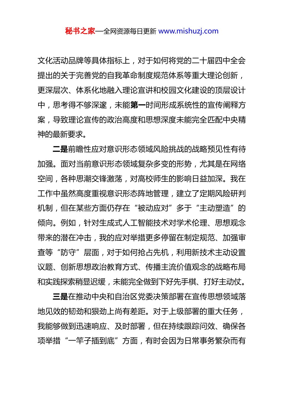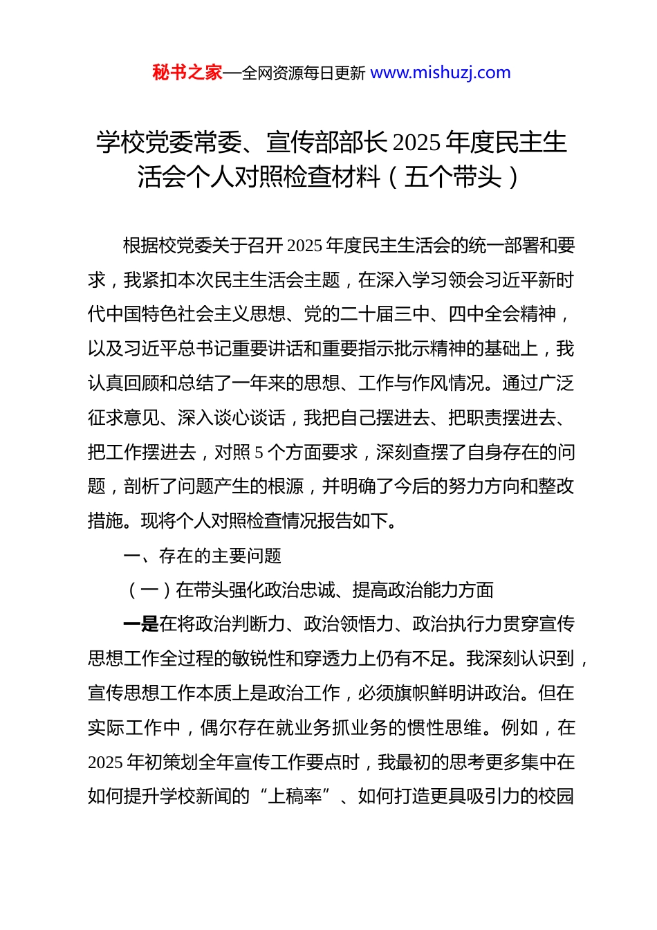 秘书之家—全网资源每日更新 www.mishuzj.com学校党委常委、宣传部部长 2025 年度民主生活会个人对照检查材料(五个带头)根据校党委关于召开 2025 年度民主生活会的统一部署和要求,我紧扣本次民主生活会主题,在深入学习领会习近平新时代中国特色社会主义思想、党的二十届三中、四中全会精神,以及习近平总书记重要讲话和重要指示批示精神的基础上,我认真回顾和总结了一年来的思想、工作与作风情况。通过广泛征求意见、深入谈心谈话,我把自己摆进去、把职责摆进去、把工作摆进去,对照 5 个方面要求,深刻查摆了自身存在的问题,剖析了问题产生的根源,并明确了今后的努力方向和整改措施。现将个人对照检查情况报告如下。一、存在的主要问题(一)在带头强化政治忠诚、提高政治能力方面一是在将政治判断力、政治领悟力、政治执行力贯穿宣传思想工作全过程的敏锐性和穿透力上仍有不足。我深刻认识到,宣传思想工作本质上是政治工作,必须旗帜鲜明讲政治。但在实际工作中,偶尔存在就业务抓业务的惯性思维。例如,在2025 年初策划全年宣传工作要点时,我最初的思考更多集中在如何提升学校新闻的“上稿率”、如何打造更具吸引力的校园秘书之家—全网资源每日更新 www.mishuzj.com文化活动品牌等具体指标上,对于如何将党的二十届四中全会提出的关于完善党的自我革命制度规范体系等重大理论创新,更深层次、体系化地融入理论宣讲和校园文化建设的顶层设计中,思考得不够深邃,未能第一时间形成系统性的宣传阐释方案,导致理论宣传的政治高度和思想深度未能完全匹配中央精神的最新要求。二是前瞻性应对意识形态领域风险挑战的战略预见性有待加强。面对当前意识形态领域复杂多变的形势,尤其是在网络空间,各种思潮交锋激荡,对高校师生的影响日益加深。我在工作中虽然高度重视意识形态阵地管理,建立了定期风险研判机制,但在某些方面仍存在“被动应对”多于“主动塑造”的倾向。例如,针对生成式人工智能技术对学术伦理、思想观念带来的潜在冲击,我的应对举措更多停留在制定规范、加强审查等“防守”层面,对于如何抢占先机,利用新技术主动设置议题、创新思想政治教育方式、传播主流价值观念的战略布局和实践探索稍显迟缓,未能完全做到下好先手棋、打好主动仗。三是在推动中央和自治区党委决策部署在宣传思想领域落地见效的韧劲和狠劲上尚有差距。对于上级部署的重大任务,我能够做到迅速响应、及时部署,但在持续跟踪问效、确保各项举措“一竿子插到底”方面,有时会因为日常事务繁杂而有秘书之家—全网资源每日更新 www.mishuzj.com所松懈。比如,在落实整治形式主义为基层减负长效机制中,虽然我牵头制定了精简会议文件、改进调研作风的具体措施,但在后续执行过程中,对于个别学院为了“留痕”而制作的宣传展板过多、新媒体平台内容“穿新鞋走老路”等隐形形式主义问题,没能及时进行深入的“回头看”和靶向纠治,体现了抓落实的钉钉子精神尚需进一步强化。(二)在带头固本培元、增强党性方面一是在理论学习的系统性和转化运用上存在“温差”。作为宣传部部长,我深知理论武装的极端重要性,能够坚持参加党委理论学习中心组学习和个人自学。但静心反思,有时学习存在任务驱动的现象,满足于完成“规定动作”,对习近平新-时代中国特色社会主义思想,特别是其中的世界观和方法论,未能完全做到融会贯通、举一反三。例如,在学习习近平文化思想的过程中,我对其中的“七个着力”要求能够熟练掌握并用于指导工作部署,但对于这些要求背后深厚的历史逻辑、理论逻辑和实践逻辑,钻研得不够透彻,导致在指导学校“文映溪山”文化品牌建设时,提出的创新举措有时更多是形式上的翻新,未能深刻触及文化育人的根本内核,理论学习成果向实践转化的效能未能最大化。二是在党性修养与业务工作深度融合上存在“两张皮”现秘书之家—全网资源每日更新 www.mishuzj.com象。我时常提醒自己要用党性原则指导业务工作,但在具体实践中,偶尔会将二者割裂开来。在推动“溪山融媒”中心建设过程中,我的工作重心较多地放在了技术平台搭建、采编流程再造、传播矩阵构建等业务层面,追...