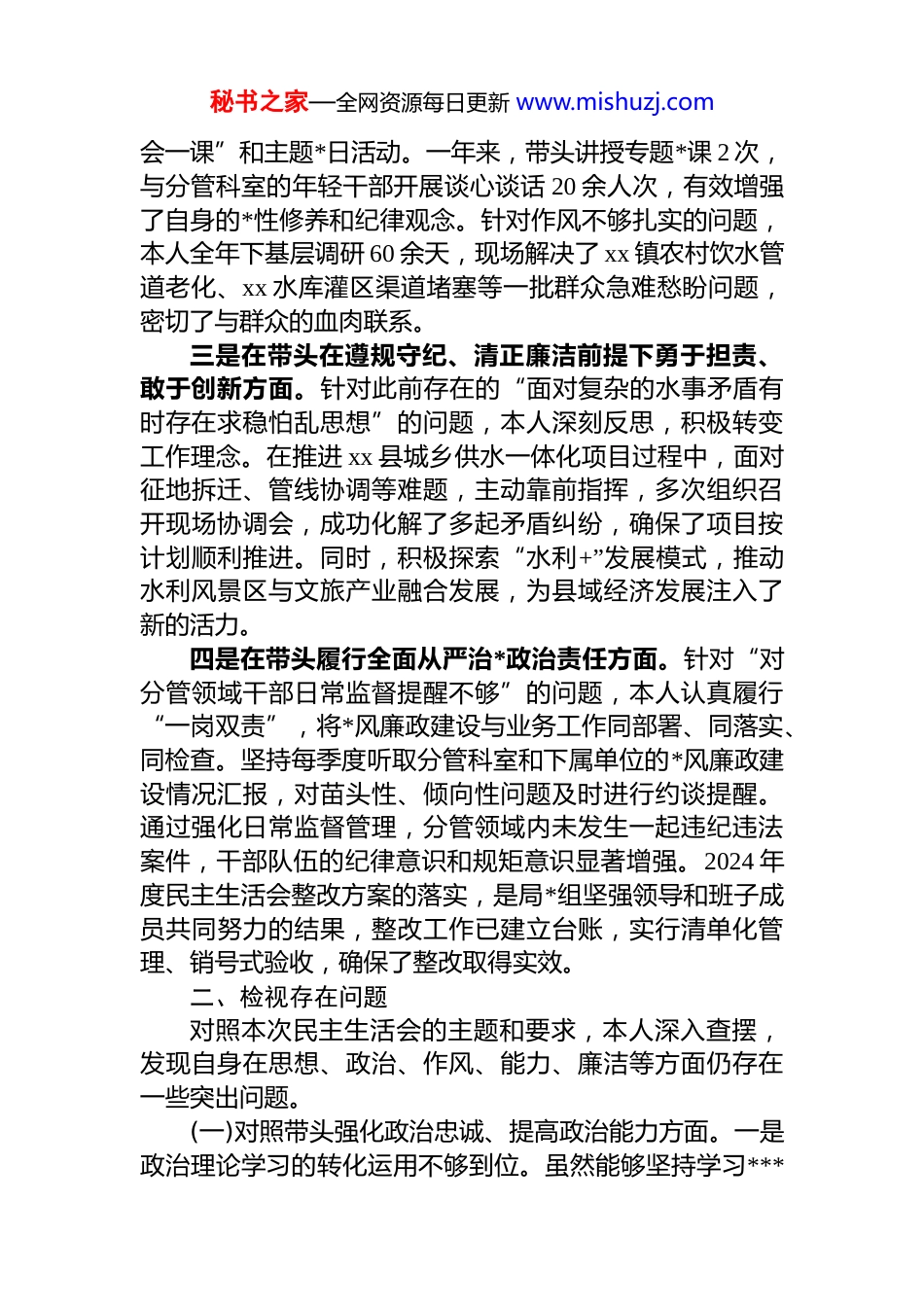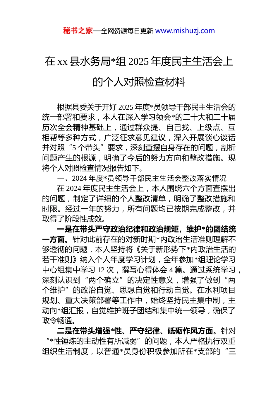 秘书之家—全网资源每日更新 www.mishuzj.com在 xx 县水务局*组 2025 年度民主生活会上的个人对照检查材料根据县委关于开好 2025 年度*员领导干部民主生活会的统一部署和要求,本人在深入学习领会*的二十大和二十届历次全会精神基础上,通过群众提、自己找、上级点、互相帮等多种方式,广泛征求意见建议,深入开展谈心谈话并对照“5 个带头”要求,深刻查摆自身存在的问题,剖析问题产生的根源,明确了今后的努力方向和整改措施。现将个人对照检查情况报告如下。一、2024 年度*员领导干部民主生活会整改落实情况在 2024 年度民主生活会上,本人围绕六个方面查摆出的问题,制定了详细的个人整改清单,明确了整改措施和时限。经过一年的努力,所有问题均已按期完成整改,并取得了阶段性成效。一是在带头严守政治纪律和政治规矩,维护*的团结统一方面。针对此前存在的对新时期*内政治生活准则理解不够透彻的问题,本人坚持将《关于新形势下*内政治生活的若干准则》纳入个人年度学习计划,全年参加*组理论学习中心组集中学习 12 次,撰写心得体会 4 篇。通过系统学习,深刻认识到“两个确立”的决定性意义,增强了做到“两个维护”的政治自觉、思想自觉和行动自觉。在水利项目规划、重大决策部署等工作中,始终坚持民主集中制,主动向*组汇报,自觉维护班子团结和集中统一领导,确保了政令畅通。二是在带头增强*性、严守纪律、砥砺作风方面。针对“*性锤炼的主动性有所减弱”的问题,本人严格执行双重组织生活制度,以普通*员身份积极参加所在*支部的“三秘书之家—全网资源每日更新 www.mishuzj.com会一课”和主题*日活动。一年来,带头讲授专题*课 2 次,与分管科室的年轻干部开展谈心谈话 20 余人次,有效增强了自身的*性修养和纪律观念。针对作风不够扎实的问题,本人全年下基层调研 60 余天,现场解决了 xx 镇农村饮水管道老化、xx 水库灌区渠道堵塞等一批群众急难愁盼问题,密切了与群众的血肉联系。三是在带头在遵规守纪、清正廉洁前提下勇于担责、敢于创新方面。针对此前存在的“面对复杂的水事矛盾有时存在求稳怕乱思想”的问题,本人深刻反思,积极转变工作理念。在推进 xx 县城乡供水一体化项目过程中,面对征地拆迁、管线协调等难题,主动靠前指挥,多次组织召开现场协调会,成功化解了多起矛盾纠纷,确保了项目按计划顺利推进。同时,积极探索“水利+”发展模式,推动水利风景区与文旅产业融合发展,为县域经济发展注入了新的活力。四是在带头履行全面从严治*政治责任方面。针对“对分管领域干部日常监督提醒不够”的问题,本人认真履行“一岗双责”,将*风廉政建设与业务工作同部署、同落实、同检查。坚持每季度听取分管科室和下属单位的*风廉政建设情况汇报,对苗头性、倾向性问题及时进行约谈提醒。通过强化日常监督管理,分管领域内未发生一起违纪违法案件,干部队伍的纪律意识和规矩意识显著增强。2024 年度民主生活会整改方案的落实,是局*组坚强领导和班子成员共同努力的结果,整改工作已建立台账,实行清单化管理、销号式验收,确保了整改取得实效。二、检视存在问题对照本次民主生活会的主题和要求,本人深入查摆,发现自身在思想、政治、作风、能力、廉洁等方面仍存在一些突出问题。(一)对照带头强化政治忠诚、提高政治能力方面。一是政治理论学习的转化运用不够到位。虽然能够坚持学习***秘书之家—全网资源每日更新 www.mishuzj.com***********思想,特别是***关于治水兴水的重要论述,但在学以致用、推动工作方面还存在差距。有时满足于“学过了”“记下了”,但在如何运用新发展理念破解我县水资源短缺、水生态损害、水环境污染等难题上,思考不深、办法不多,未能完全将学习成果转化为推动 xx 水利事业高质量发展的强大动力。二是政治判断力、政治领悟力、政治执行力仍需提升。对一些社会思潮和复杂舆情的政治鉴别力不够敏锐,对其可能对水利工作带来的影响预判不足。例如,在面对网络上关于 xx 河道采砂管理的负面舆情时,初期应对较为被动,未能第一时间从政治高度认识其潜在风险,导致舆情发酵,造成了不良影响。三是...