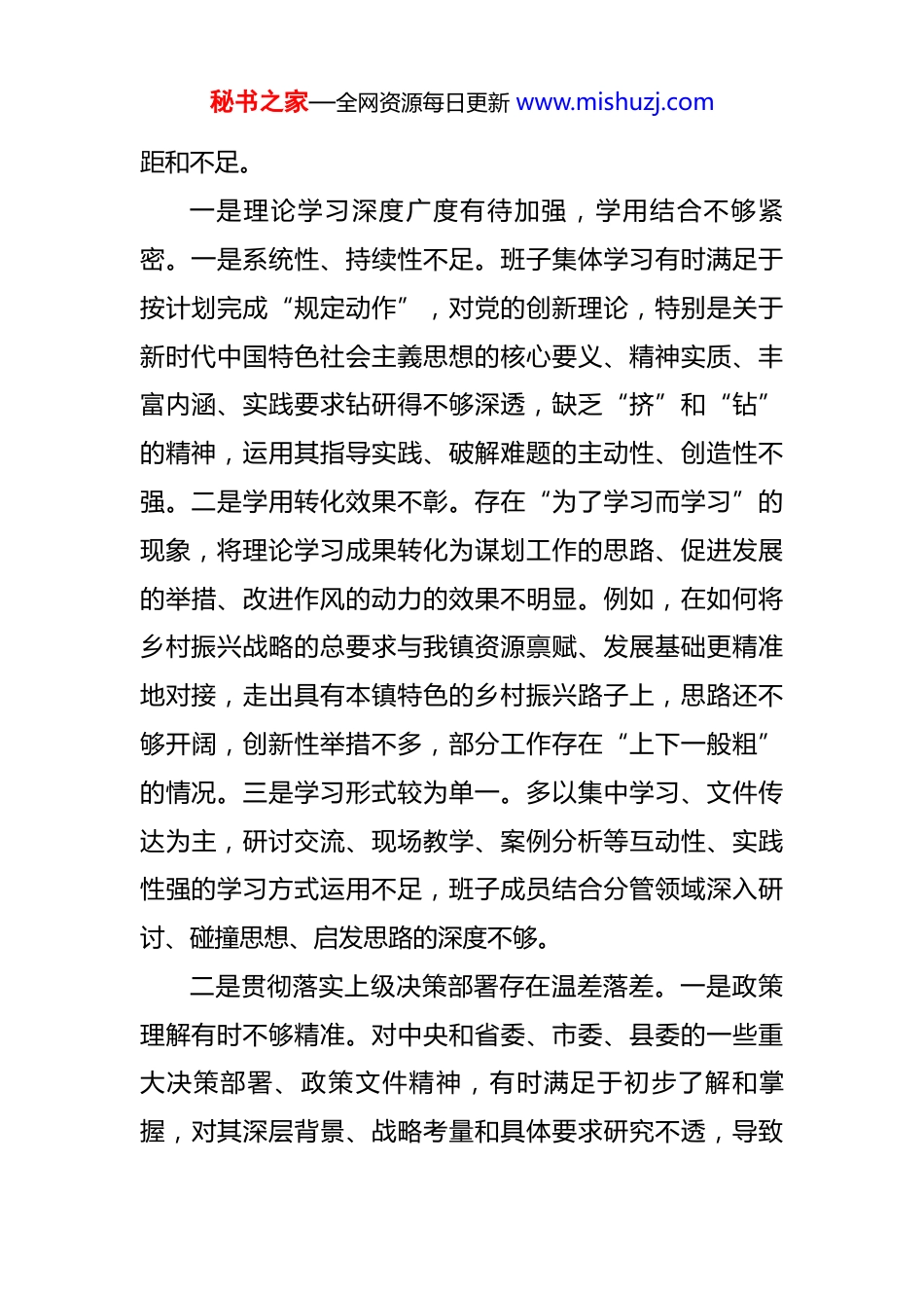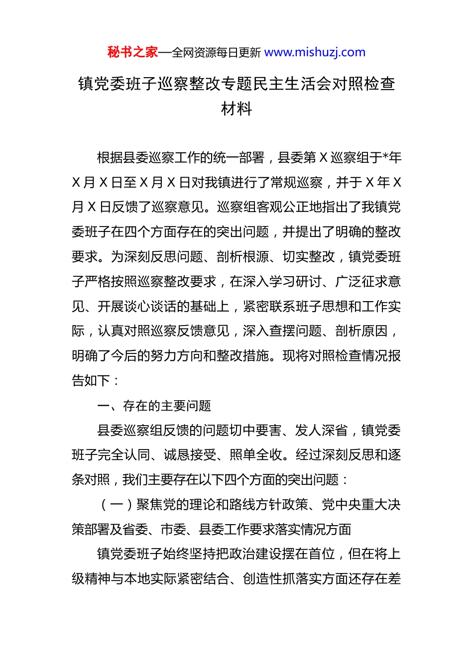 秘书之家—全网资源每日更新 www.mishuzj.com镇党委班子巡察整改专题民主生活会对照检查材料 根据县委巡察工作的统一部署,县委第 X 巡察组于*年X 月 X 日至 X 月 X 日对我镇进行了常规巡察,并于 X 年 X月 X 日反馈了巡察意见。巡察组客观公正地指出了我镇党委班子在四个方面存在的突出问题,并提出了明确的整改要求。为深刻反思问题、剖析根源、切实整改,镇党委班子严格按照巡察整改要求,在深入学习研讨、广泛征求意见、开展谈心谈话的基础上,紧密联系班子思想和工作实际,认真对照巡察反馈意见,深入查摆问题、剖析原因,明确了今后的努力方向和整改措施。现将对照检查情况报告如下:一、存在的主要问题县委巡察组反馈的问题切中要害、发人深省,镇党委班子完全认同、诚恳接受、照单全收。经过深刻反思和逐条对照,我们主要存在以下四个方面的突出问题:(一)聚焦党的理论和路线方针政策、党中央重大决策部署及省委、市委、县委工作要求落实情况方面镇党委班子始终坚持把政治建设摆在首位,但在将上级精神与本地实际紧密结合、创造性抓落实方面还存在差秘书之家—全网资源每日更新 www.mishuzj.com距和不足。一是理论学习深度广度有待加强,学用结合不够紧密。一是系统性、持续性不足。班子集体学习有时满足于按计划完成“规定动作”,对党的创新理论,特别是关于新时代中国特色社会主義思想的核心要义、精神实质、丰富内涵、实践要求钻研得不够深透,缺乏“挤”和“钻”的精神,运用其指导实践、破解难题的主动性、创造性不强。二是学用转化效果不彰。存在“为了学习而学习”的现象,将理论学习成果转化为谋划工作的思路、促进发展的举措、改进作风的动力的效果不明显。例如,在如何将乡村振兴战略的总要求与我镇资源禀赋、发展基础更精准地对接,走出具有本镇特色的乡村振兴路子上,思路还不够开阔,创新性举措不多,部分工作存在“上下一般粗”的情况。三是学习形式较为单一。多以集中学习、文件传达为主,研讨交流、现场教学、案例分析等互动性、实践性强的学习方式运用不足,班子成员结合分管领域深入研讨、碰撞思想、启发思路的深度不够。二是贯彻落实上级决策部署存在温差落差。一是政策理解有时不够精准。对中央和省委、市委、县委的一些重大决策部署、政策文件精神,有时满足于初步了解和掌握,对其深层背景、战略考量和具体要求研究不透,导致秘书之家—全网资源每日更新 www.mishuzj.com在制定具体落实方案时可能出现偏差或遗漏。二是执行力度有时层层递减。对于某些难度较大、周期较长的工作任务,有时存在畏难情绪或“等靠要”思想,攻坚克难的锐气不足,导致工作推进速度偏慢、效果未达预期。例如,在推动某些重点项目建设、化解历史遗留问题等方面,有时跟进督促不够紧,抓落实的韧劲有待加强。三是结合镇情实际创新不足。有时习惯于当“二传手”,简单照搬照抄上级要求,未能充分结合本镇发展阶段、产业特点、群众需求等实际情况进行细化、具体化,缺乏富有针对性和可操作性的“自选动作”,工作的特色和亮点不突出。三是推动高质量发展的战略定力和能力有待提升。一是对新发展理念的理解和践行不够深入。有时仍存在重经济发展轻环境保护、重项目建设轻民生改善的倾向,在统筹发展与安全、发展与环保、效率与公平等方面平衡把握得不够好。二是产业转型升级步伐不够快。对我镇主导产业的培育、新兴产业的支持力度有待加大,产业链条短、附加值不高的问题依然存在,科技创新对经济发展的支撑作用不明显。三是深化改革、优化营商环境的力度需进一步加大。在“放管服”改革、要素保障、服务企业等方面,还存在一些堵点、难点,主动服务意识、破解瓶颈的能力需要进一步增强,部分惠企政策的“最后一公里”尚秘书之家—全网资源每日更新 www.mishuzj.com未完全畅通。(二)聚焦群众身边不正之风和腐败问题情况镇党委班子始终坚持以人民为中心的发展思想,但在整治群众反映强烈的突出问题、维护群众切身利益方面还需持续用力。一是整治形式主义、官僚主义问题不够彻底。一是文山会海现象仍有存在。虽然进行了整治,但有时会议多、文件多、汇报...