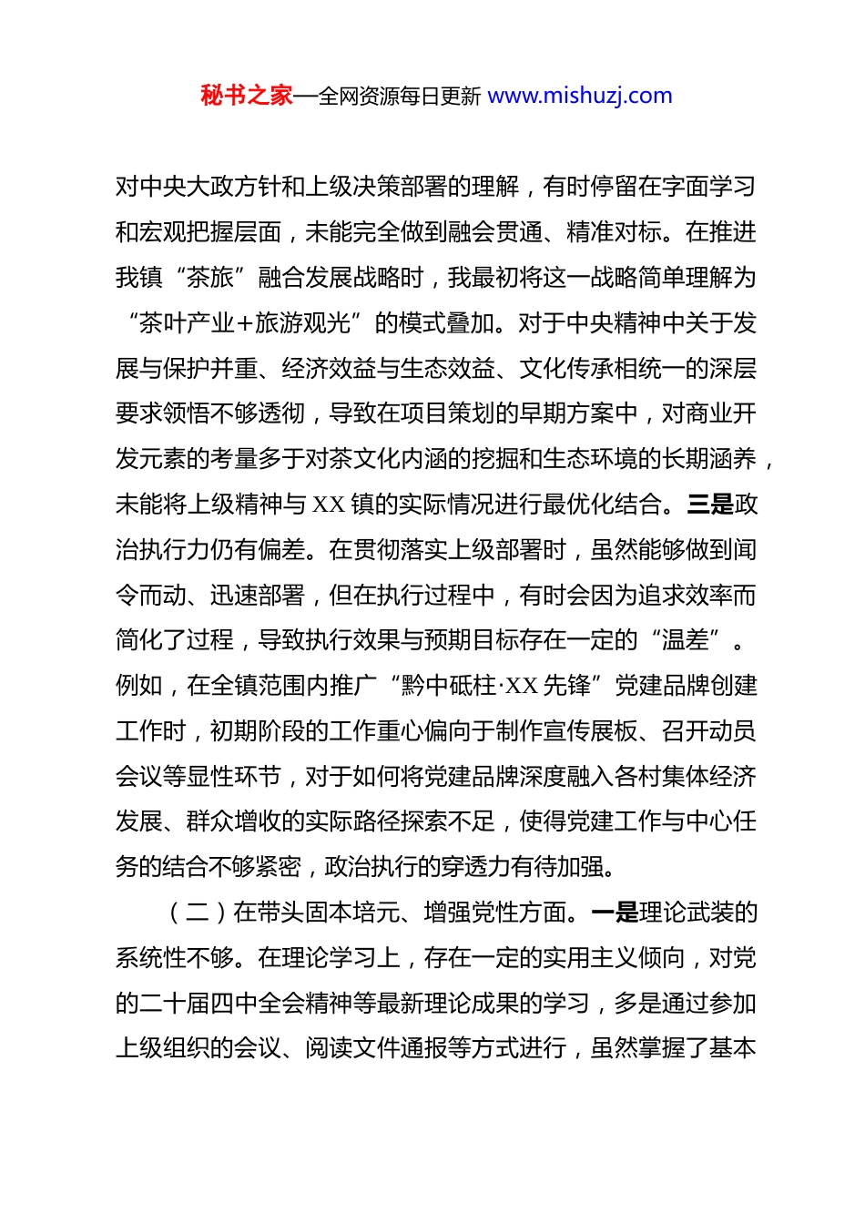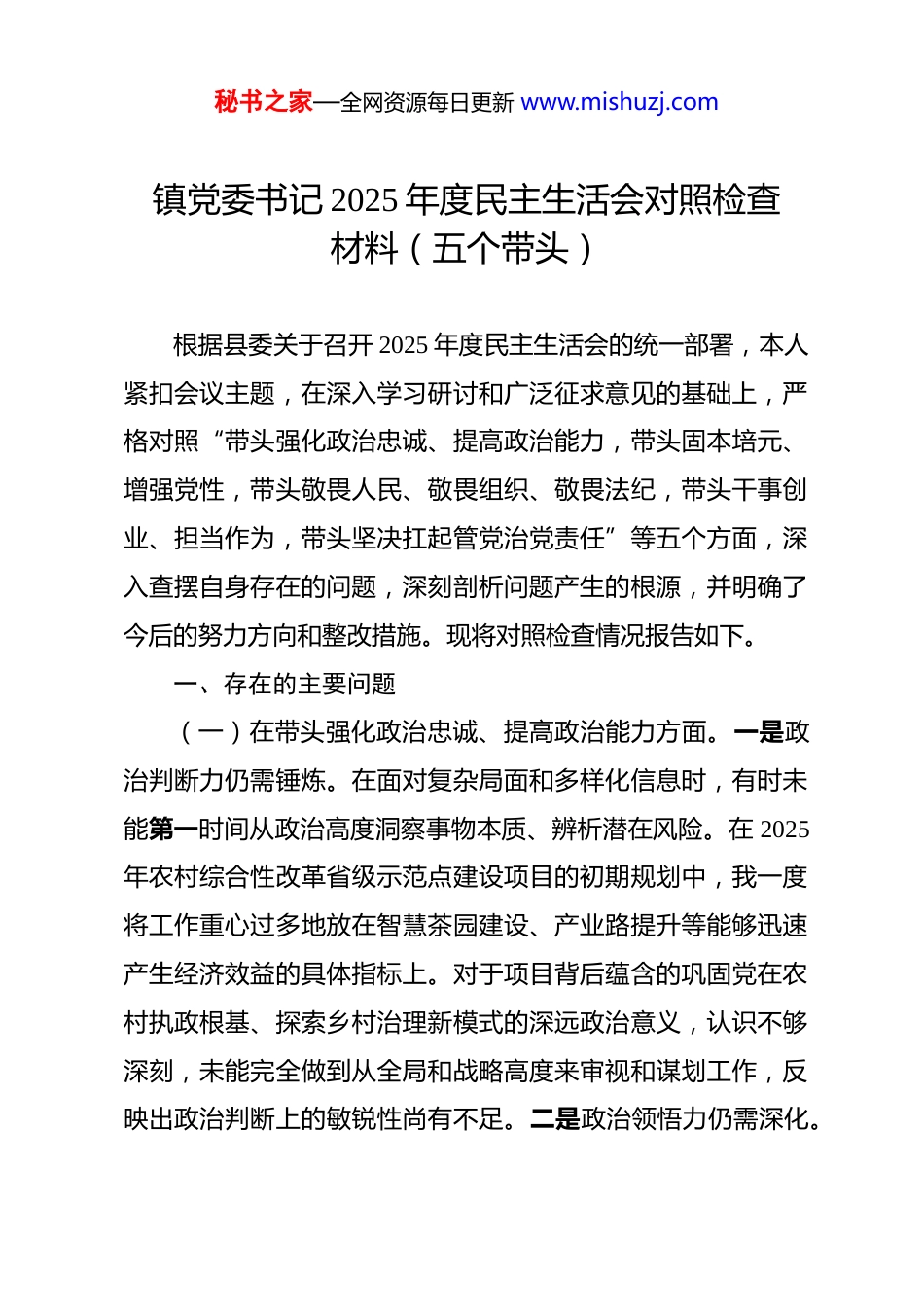 秘书之家—全网资源每日更新 www.mishuzj.com镇党委书记 2025 年度民主生活会对照检查材料(五个带头)根据县委关于召开 2025 年度民主生活会的统一部署,本人紧扣会议主题,在深入学习研讨和广泛征求意见的基础上,严格对照“带头强化政治忠诚、提高政治能力,带头固本培元、增强党性,带头敬畏人民、敬畏组织、敬畏法纪,带头干事创业、担当作为,带头坚决扛起管党治党责任”等五个方面,深入查摆自身存在的问题,深刻剖析问题产生的根源,并明确了今后的努力方向和整改措施。现将对照检查情况报告如下。一、存在的主要问题(一)在带头强化政治忠诚、提高政治能力方面。一是政治判断力仍需锤炼。在面对复杂局面和多样化信息时,有时未能第一时间从政治高度洞察事物本质、辨析潜在风险。在 2025年农村综合性改革省级示范点建设项目的初期规划中,我一度将工作重心过多地放在智慧茶园建设、产业路提升等能够迅速产生经济效益的具体指标上。对于项目背后蕴含的巩固党在农村执政根基、探索乡村治理新模式的深远政治意义,认识不够深刻,未能完全做到从全局和战略高度来审视和谋划工作,反映出政治判断上的敏锐性尚有不足。二是政治领悟力仍需深化。秘书之家—全网资源每日更新 www.mishuzj.com对中央大政方针和上级决策部署的理解,有时停留在字面学习和宏观把握层面,未能完全做到融会贯通、精准对标。在推进我镇“茶旅”融合发展战略时,我最初将这一战略简单理解为“茶叶产业+旅游观光”的模式叠加。对于中央精神中关于发展与保护并重、经济效益与生态效益、文化传承相统一的深层要求领悟不够透彻,导致在项目策划的早期方案中,对商业开发元素的考量多于对茶文化内涵的挖掘和生态环境的长期涵养,未能将上级精神与 XX 镇的实际情况进行最优化结合。三是政治执行力仍有偏差。在贯彻落实上级部署时,虽然能够做到闻令而动、迅速部署,但在执行过程中,有时会因为追求效率而简化了过程,导致执行效果与预期目标存在一定的“温差”。例如,在全镇范围内推广“黔中砥柱·XX 先锋”党建品牌创建工作时,初期阶段的工作重心偏向于制作宣传展板、召开动员会议等显性环节,对于如何将党建品牌深度融入各村集体经济发展、群众增收的实际路径探索不足,使得党建工作与中心任务的结合不够紧密,政治执行的穿透力有待加强。(二)在带头固本培元、增强党性方面。一是理论武装的系统性不够。在理论学习上,存在一定的实用主义倾向,对党的二十届四中全会精神等最新理论成果的学习,多是通过参加上级组织的会议、阅读文件通报等方式进行,虽然掌握了基本秘书之家—全网资源每日更新 www.mishuzj.com要义,但缺少系统性的深入研读和专题研讨。尤其是在结合我镇具体工作,如在推进农村规模化供水工程这类涉及长远发展的重大项目时,未能自觉运用党的创新理论来指导分析项目推进中遇到的深层次矛盾和问题,导致理论学习与实践运用结合不够紧密。二是先锋模范作用发挥不充分。作为党委书记,在一些工作中对自己高标准、严要求坚持得不够好。尤其是在村级党组织带头人队伍建设上,过去一度将选拔标准更多地聚焦于致富带富能力、产业发展思路等显性才干上,对于候选人的政治素养、党性修养和奉献精神的考察不够深入细致。这导致个别村干部虽然懂经营、会管理,但在凝聚党员、服务群众方面的先锋模 á 范作用不突出,反映出我在固本培元、筑牢基层战斗堡垒的根本性工作上思考得不够深远。三是党内政治生活锤炼不严格。虽然能够严格执行民主集中制,但在开展批评和自我批评时,有时还存在“好人主义”思想,顾及情面、回避矛盾。在镇党委班子的民主生活会或组织生活会上,对于其他同志工作层面上的问题敢于提出意见,但对于思想深处、党性修养方面的潜在问题,往往点到为止,批评的“辣味”不足。对于自身存在的问题,有时也只是泛泛而谈,未能真正做到“红脸出汗、排毒治病”,党性锻炼的主动性和深刻性有待提高。秘书之家—全网资源每日更新 www.mishuzj.com(三)在带头敬畏人民、敬畏组织、敬畏法纪方面。一是深入践行群众路线不够彻底。虽然经常下乡调研,但有时存在“精英视角”,...