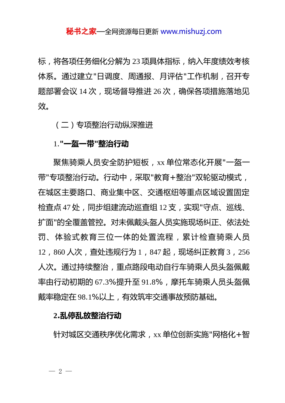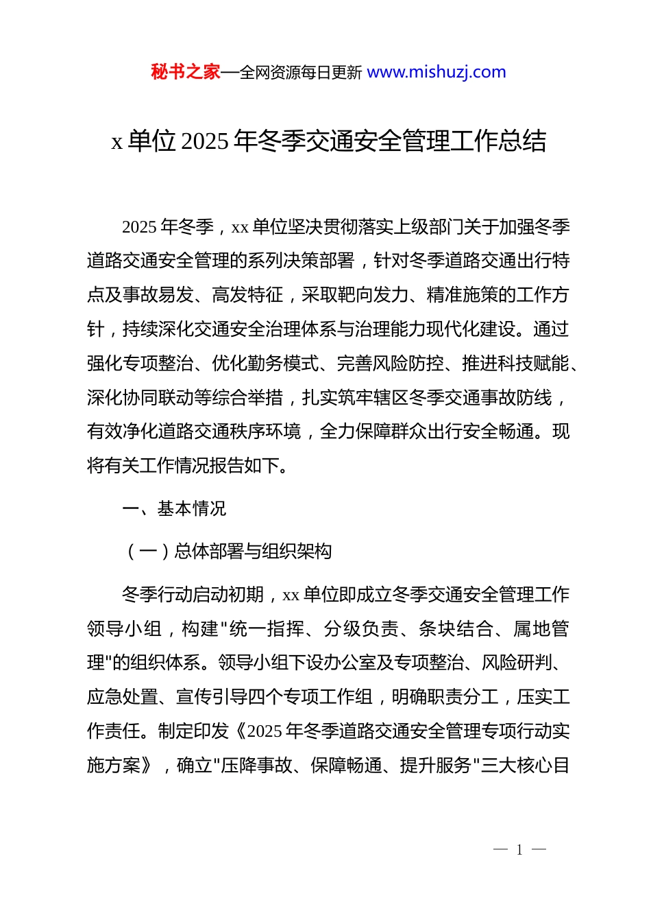 秘书之家—全网资源每日更新 www.mishuzj.comx 单位 2025 年冬季交通安全管理工作总结2025 年冬季,xx 单位坚决贯彻落实上级部门关于加强冬季道路交通安全管理的系列决策部署,针对冬季道路交通出行特点及事故易发、高发特征,采取靶向发力、精准施策的工作方针,持续深化交通安全治理体系与治理能力现代化建设。通过强化专项整治、优化勤务模式、完善风险防控、推进科技赋能、深化协同联动等综合举措,扎实筑牢辖区冬季交通事故防线,有效净化道路交通秩序环境,全力保障群众出行安全畅通。现将有关工作情况报告如下。一、基本情况(一)总体部署与组织架构冬季行动启动初期,xx 单位即成立冬季交通安全管理工作领导小组,构建"统一指挥、分级负责、条块结合、属地管理"的组织体系。领导小组下设办公室及专项整治、风险研判、应急处置、宣传引导四个专项工作组,明确职责分工,压实工作责任。制定印发《2025 年冬季道路交通安全管理专项行动实施方案》,确立"压降事故、保障畅通、提升服务"三大核心目— 1 —秘书之家—全网资源每日更新 www.mishuzj.com标,将各项任务细化分解为 23 项具体指标,纳入年度绩效考核体系。通过建立"日调度、周通报、月评估"工作机制,召开专题部署会议 14 次,现场督导推进 26 次,确保各项措施落地见效。(二)专项整治行动纵深推进1."一盔一带"整治行动聚焦骑乘人员安全防护短板,xx 单位常态化开展"一盔一带"专项整治行动。行动中,采取"教育+整治"双轮驱动模式,在城区主要路口、商业集中区、交通枢纽等重点区域设置固定检查点 47 处,同步组建流动巡查组 12 支,实现"守点、巡线、扩面"的全覆盖管控。对未佩戴头盔人员实施现场纠正、依法处罚、体验式教育三位一体的处置流程,累计检查骑乘人员12,860 人次,查处违规行为 1,847 起,现场纠正教育 3,256人次。通过持续整治,重点路段电动自行车骑乘人员头盔佩戴率由行动初期的 67.3%提升至 91.8%,摩托车骑乘人员头盔佩戴率稳定在 98.1%以上,有效筑牢交通事故预防基础。2.乱停乱放整治行动针对城区交通秩序优化需求,xx 单位创新实施"网格化+智— 2 —秘书之家—全网资源每日更新 www.mishuzj.com能化"治理模式。将城区划分为 8 大管理网格、32 个勤务责任区,采取"高峰守点、平峰巡线、夜间扩面"的勤务模式,强化对主次干道、背街小巷、农贸市场周边等易堵点段的管控力度。依托视频巡查与路面铁骑联动机制,及时发现处置违停行为。累计清理乱停乱放车辆 4,923 辆次,查处违规停放行为 6,234起,拖移严重影响通行车辆 287 辆,优化设置停车泊位 1,240个,增设隔离设施 3,600 米。通过综合整治,城区主要道路通行效率提升 15.6%,群众关于停车秩序的投诉量同比下降42.3%。3.夜查酒驾整治行动为严厉打击酒驾醉驾违法行为,xx 单位创新实施"夜间+凌晨"双时段勤务模式。每晚 20 时至次日 2 时,在餐饮娱乐场所集中区域设置固定检查点 9 处;针对清晨 6 至 9 点隔夜酒驾、宿醉驾车风险,增设清晨临检点 5 处,实现 24 小时无缝监管。行动中,整合交警、特警、派出所等多警力资源,形成"守点+巡线+突击"相结合的立体管控网络。累计开展夜查行动 86 次,检查车辆 45,320 辆次,查获酒驾违法行为 127 起,其中饮酒驾驶 89 起、醉酒驾驶 38 起,血醇浓度最高达 263mg/100ml。所有查获案件均依法快侦快办,移送起诉率 100%,有效震慑— 3 —秘书之家—全网资源每日更新 www.mishuzj.com了酒后驾驶违法行为。(三)教育培训与能力建设xx 单位将人员能力提升作为冬季行动的基础工程。2025 年11 月,组织全体执勤民警、辅警开展冬季交通安全管理专项培训,采取"线上理论+线下实战"相结合模式,邀请行业专家授课 12 场次,培训覆盖率达 100%。培训内容涵盖冬季事故预防理论、恶劣天气应急处置、新型执法装备操作、安全防护规范等 模 块 。 训 后 组 织 闭 卷 考 核 , 参 考 人 员 385 名 , 合 格 率98.7%,优秀率 76.4%。针对一线执法人员,每半月开展一次最小作战单元演练,提升协同作...