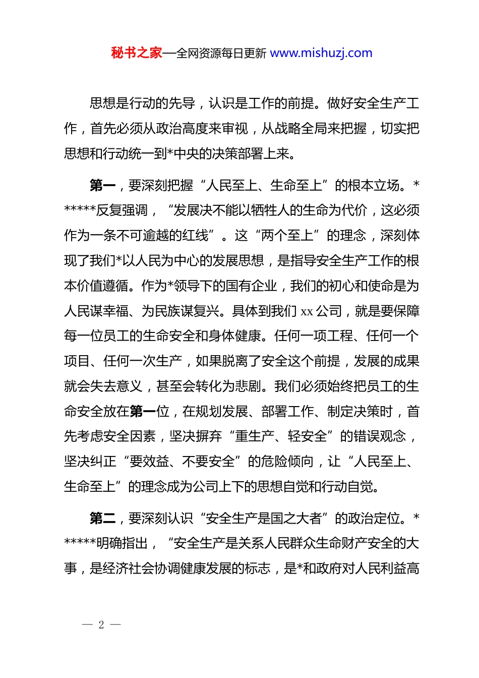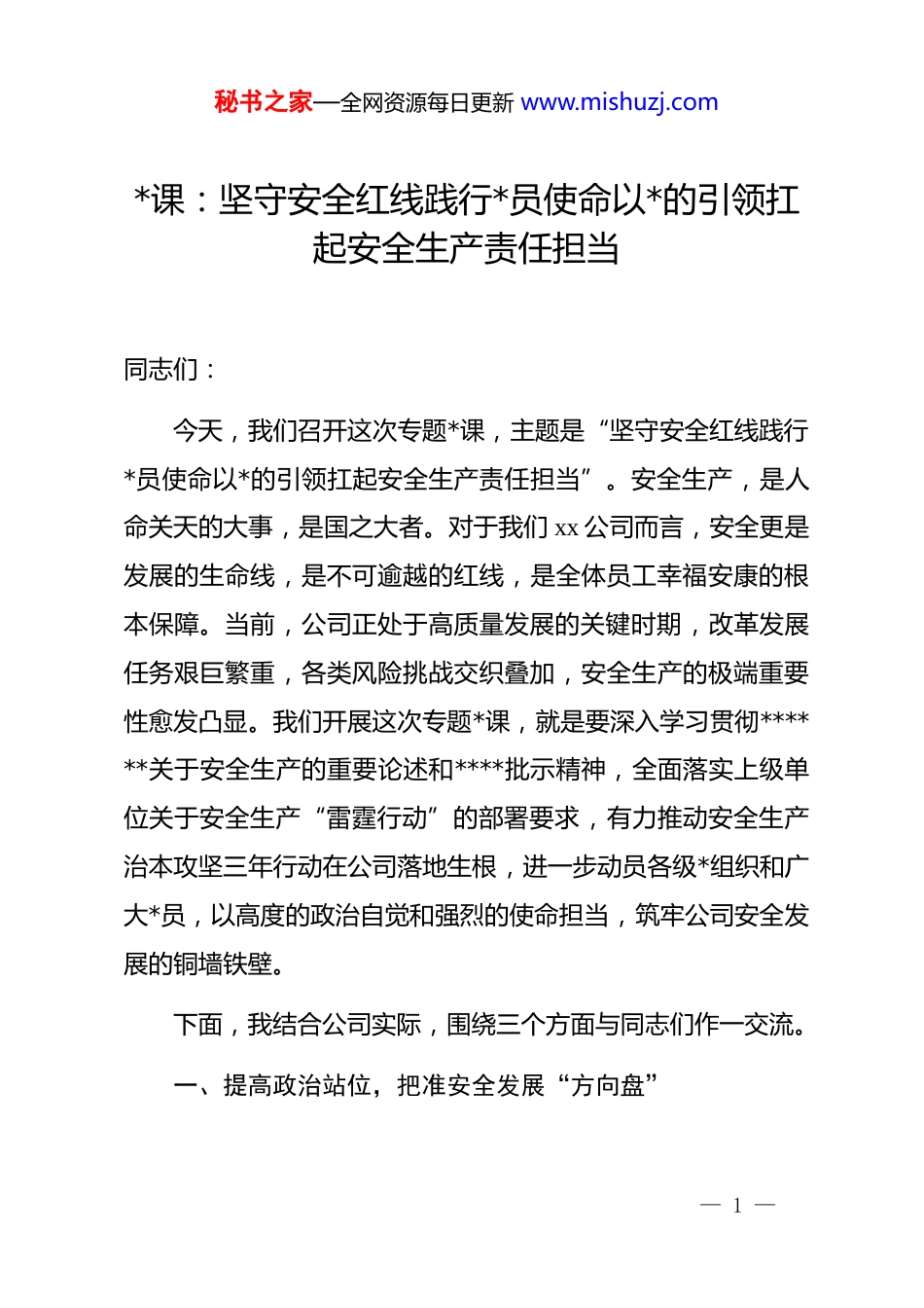 秘书之家—全网资源每日更新 www.mishuzj.com*课:坚守安全红线践行*员使命以*的引领扛起安全生产责任担当同志们:今天,我们召开这次专题*课,主题是“坚守安全红线践行*员使命以*的引领扛起安全生产责任担当”。安全生产,是人命关天的大事,是国之大者。对于我们 xx 公司而言,安全更是发展的生命线,是不可逾越的红线,是全体员工幸福安康的根本保障。当前,公司正处于高质量发展的关键时期,改革发展任务艰巨繁重,各类风险挑战交织叠加,安全生产的极端重要性愈发凸显。我们开展这次专题*课,就是要深入学习贯彻******关于安全生产的重要论述和****批示精神,全面落实上级单位关于安全生产“雷霆行动”的部署要求,有力推动安全生产治本攻坚三年行动在公司落地生根,进一步动员各级*组织和广大*员,以高度的政治自觉和强烈的使命担当,筑牢公司安全发展的铜墙铁壁。下面,我结合公司实际,围绕三个方面与同志们作一交流。一、提高政治站位,把准安全发展“方向盘”— 1 —秘书之家—全网资源每日更新 www.mishuzj.com思想是行动的先导,认识是工作的前提。做好安全生产工作,首先必须从政治高度来审视,从战略全局来把握,切实把思想和行动统一到*中央的决策部署上来。第一,要深刻把握“人民至上、生命至上”的根本立场。******反复强调,“发展决不能以牺牲人的生命为代价,这必须作为一条不可逾越的红线”。这“两个至上”的理念,深刻体现了我们*以人民为中心的发展思想,是指导安全生产工作的根本价值遵循。作为*领导下的国有企业,我们的初心和使命是为人民谋幸福、为民族谋复兴。具体到我们 xx 公司,就是要保障每一位员工的生命安全和身体健康。任何一项工程、任何一个项目、任何一次生产,如果脱离了安全这个前提,发展的成果就会失去意义,甚至会转化为悲剧。我们必须始终把员工的生命安全放在第一位,在规划发展、部署工作、制定决策时,首先考虑安全因素,坚决摒弃“重生产、轻安全”的错误观念,坚决纠正“要效益、不要安全”的危险倾向,让“人民至上、生命至上”的理念成为公司上下的思想自觉和行动自觉。第二,要深刻认识“安全生产是国之大者”的政治定位。******明确指出,“安全生产是关系人民群众生命财产安全的大事,是经济社会协调健康发展的标志,是*和政府对人民利益高— 2 —秘书之家—全网资源每日更新 www.mishuzj.com度负责的要求”。将安全生产上升到“国之大者”的高度,充分说明了其在*和国家事业全局中的战略地位。当前,我国正处在实现中华民族伟大复兴的关键时期,需要一个安全稳定的社会环境。一次重大的生产安全事故,不仅会造成人民生命财产的巨大损失,更可能引发社会问题,影响发展大局。xx 公司作为国家装备制造业的重要力量,我们的安全生产状况,直接关系到产业链供应链的稳定,关系到国家重大工程的建设,关系到国有企业的形象和声誉。我们必须胸怀“国之大者”,深刻认识到抓好安全生产不仅是经济问题、管理问题,更是严肃的政治问题。每一名*员干部都要从维护国家安全、社会稳定、人民安居乐业的政治高度来看待安全、抓好安全,以“时时放心不下”的责任感,守土有责、守土负责、守土尽责。第三,要深刻理解“统筹发展和安全”的战略要求。安全是发展的前提,发展是安全的保障,二者相辅相成、辩证统一。没有安全的发展是脆弱的、不可持续的,而没有发展的安全也是缺乏基础的、长不了的。过去一些单位,在追求规模扩张和速度增长时,往往忽视了安全投入和风险防控,结果付出了惨痛的代价,教训极为深刻。高质量发展,必然是安全的发展。我们要完整、准确、全面贯彻新发展理念,把安全发展贯穿公— 3 —秘书之家—全网资源每日更新 www.mishuzj.com司发展各领域和全过程。在做大做强主业的同时,必须同步规划、同步部署、同步推进安全生产工作。要处理好安全与进度、安全与效益的关系,当安全与生产发生矛盾时,生产必须无条件为安全让路。要加大安全投入,提升本质安全水平,依靠科技进步和管理创新,从根本上提高风险防范能力。只有实现了高水平的安全,我们才能心无旁骛地谋发展、求突破,才能在激烈的市场竞...