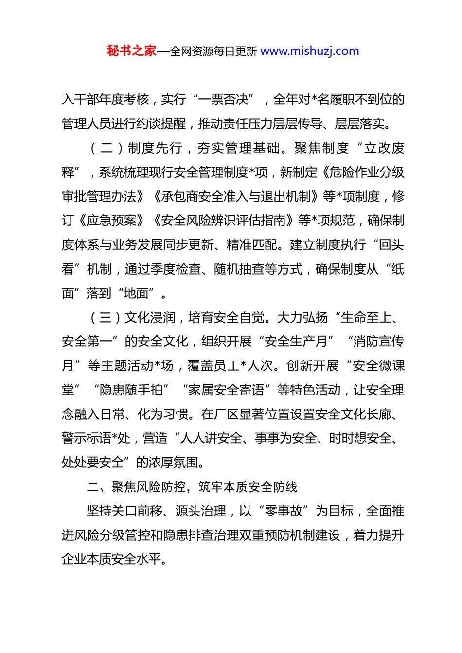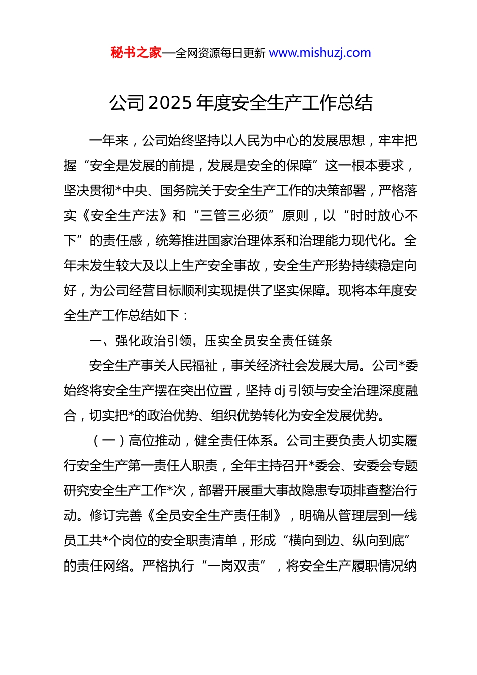 秘书之家—全网资源每日更新 www.mishuzj.com公司 2025 年度安全生产工作总结一年来,公司始终坚持以人民为中心的发展思想,牢牢把握“安全是发展的前提,发展是安全的保障”这一根本要求,坚决贯彻*中央、国务院关于安全生产工作的决策部署,严格落实《安全生产法》和“三管三必须”原则,以“时时放心不下”的责任感,统筹推进国家治理体系和治理能力现代化。全年未发生较大及以上生产安全事故,安全生产形势持续稳定向好,为公司经营目标顺利实现提供了坚实保障。现将本年度安全生产工作总结如下:一、强化政治引领,压实全员安全责任链条安全生产事关人民福祉,事关经济社会发展大局。公司*委始终将安全生产摆在突出位置,坚持 dj 引领与安全治理深度融合,切实把*的政治优势、组织优势转化为安全发展优势。(一)高位推动,健全责任体系。公司主要负责人切实履行安全生产第一责任人职责,全年主持召开*委会、安委会专题研究安全生产工作*次,部署开展重大事故隐患专项排查整治行动。修订完善《全员安全生产责任制》,明确从管理层到一线员工共*个岗位的安全职责清单,形成“横向到边、纵向到底”的责任网络。严格执行“一岗双责”,将安全生产履职情况纳秘书之家—全网资源每日更新 www.mishuzj.com入干部年度考核,实行“一票否决”,全年对*名履职不到位的管理人员进行约谈提醒,推动责任压力层层传导、层层落实。(二)制度先行,夯实管理基础。聚焦制度“立改废释”,系统梳理现行安全管理制度*项,新制定《危险作业分级审批管理办法》《承包商安全准入与退出机制》等*项制度,修订《应急预案》《安全风险辨识评估指南》等*项规范,确保制度体系与业务发展同步更新、精准匹配。建立制度执行“回头看”机制,通过季度检查、随机抽查等方式,确保制度从“纸面”落到“地面”。(三)文化浸润,培育安全自觉。大力弘扬“生命至上、安全第一”的安全文化,组织开展“安全生产月”“消防宣传月”等主题活动*场,覆盖员工*人次。创新开展“安全微课堂”“隐患随手拍”“家属安全寄语”等特色活动,让安全理念融入日常、化为习惯。在厂区显著位置设置安全文化长廊、警示标语*处,营造“人人讲安全、事事为安全、时时想安全、处处要安全”的浓厚氛围。二、聚焦风险防控,筑牢本质安全防线坚持关口前移、源头治理,以“零事故”为目标,全面推进风险分级管控和隐患排查治理双重预防机制建设,着力提升企业本质安全水平。秘书之家—全网资源每日更新 www.mishuzj.com(一)精准辨识,动态管控风险。组织各生产单元开展全覆盖、无死角的安全风险辨识评估,全年累计辨识各类风险点*个,其中重大风险*个、较大风险*个。针对高风险区域和关键环节,实施“红橙黄蓝”四色动态管理,制定并落实工程技术、管理控制、个体防护、应急处置等*项管控措施。例如,在危化品存储区加装智能气体监测与自动喷淋联动系统,在大型设备操作区推行“双人确认、视频留痕”操作规程,有效降低人为失误风险。(二)闭环整改,消除事故隐患。深入开展重大事故隐患专项排查整治 2025 行动,聚焦动火、有限空间、高处作业等高危环节,以及老旧装置、电气线路、消防设施等重点领域,全年组织综合性检查*次、专项检查*次,排查一般隐患*项、重大隐患*项。建立隐患台账,实行“发现—登记—整改—验收—销号”全流程闭环管理,整改完成率达 100%。投入安全技改资金*万元,用于更换老化管道*米、升级配电系统*套、增设安全防护装置*台(套),从硬件上消除事故诱因。(三)科技赋能,提升监管效能。积极推进“工业互联网+安全生产”建设,建成集视频监控、环境监测、人员定位、预警报警于一体的智慧安全平台。平台接入关键设备传感器*个,实现对温度、压力、液位等参数的实时监测与智能分析,秘书之家—全网资源每日更新 www.mishuzj.com全年自动预警并成功干预潜在风险事件*起。推广使用移动巡检app,实现隐患上报、任务派发、整改反馈线上流转,平均处理时效缩短*%,大幅提升安全管理效率。三、夯实基层基础,锻造过硬应急处突能力基层是安全生产的第一道防线,应急能力是守护生命的最后屏障。公司坚...
