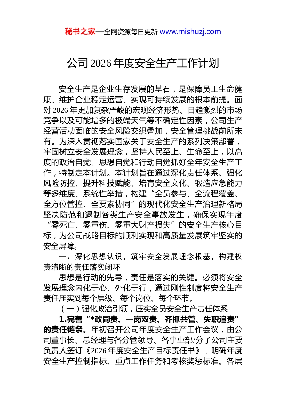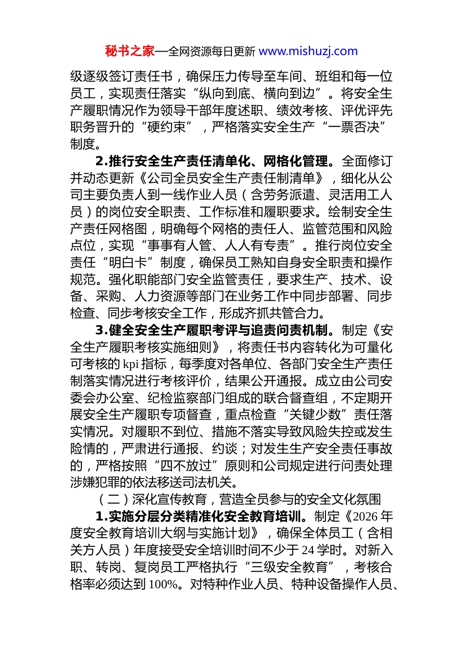 秘书之家—全网资源每日更新 www.mishuzj.com公司 2026 年度安全生产工作计划安全生产是企业生存发展的基石,是保障员工生命健康、维护企业稳定运营、实现可持续发展的根本前提。面对 2026 年更加复杂严峻的宏观经济形势、日趋激烈的市场竞争以及可能增多的极端天气等不确定性因素,公司生产经营活动面临的安全风险交织叠加,安全管理挑战前所未有。为深入贯彻落实国家关于安全生产的系列决策部署,牢固树立安全发展理念,坚持人民至上、生命至上,以高度的政治自觉、思想自觉和行动自觉抓好全年安全生产工作,特制定本计划。本计划旨在通过深化责任体系、强化风险防控、提升科技赋能、培育安全文化、锻造应急能力等多维度、系统性举措,构建“全员参与、全流程覆盖、全方位管控、全要素协同”的现代化安全生产治理新格局坚决防范和遏制各类生产安全事故发生,确保实现年度“零死亡、零重伤、零重大财产损失”的安全生产核心目标,为公司战略目标的顺利实现和高质量发展筑牢坚实的安全屏障。一、深化思想认识,筑牢安全发展理念根基,构建权责清晰的责任落实闭环思想是行动的先导,责任是落实的关键。必须将安全发展理念内化于心、外化于行,通过刚性制度将安全生产责任压实到每个层级、每个岗位、每个环节。(一)强化政治引领,压实全员安全生产责任体系1.完善“*政同责、一岗双责、齐抓共管、失职追责”的责任链条。年初召开公司年度安全生产工作会议,由公司董事长、总经理与各分管领导、各事业部/分子公司主要负责人签订《2026 年度安全生产目标责任书》,明确年度安全生产控制指标、重点工作任务和考核奖惩标准。各层秘书之家—全网资源每日更新 www.mishuzj.com级逐级签订责任书,确保压力传导至车间、班组和每一位员工,实现责任落实“纵向到底、横向到边”。将安全生产履职情况作为领导干部年度述职、绩效考核、评优评先职务晋升的“硬约束”,严格落实安全生产“一票否决”制度。2.推行安全生产责任清单化、网格化管理。全面修订并动态更新《公司全员安全生产责任制清单》,细化从公司主要负责人到一线作业人员(含劳务派遣、灵活用工人员)的岗位安全职责、工作标准和履职要求。绘制安全生产责任网格图,明确每个网格的责任人、监管范围和风险点位,实现“事事有人管、人人有专责”。推行岗位安全责任“明白卡”制度,确保员工熟知自身安全职责和操作规范。强化职能部门安全监管责任,要求生产、技术、设备、采购、人力资源等部门在业务工作中同步部署、同步检查、同步考核安全工作,形成齐抓共管合力。3.健全安全生产履职考评与追责问责机制。制定《安全生产履职考核实施细则》,将责任书内容转化为可量化可考核的 kpi 指标,每季度对各单位、各部门安全生产责任制落实情况进行考核评价,结果公开通报。成立由公司安委会办公室、纪检监察部门组成的联合督查组,不定期开展安全生产履职专项督查,重点检查“关键少数”责任落实情况。对履职不到位、措施不落实导致风险失控或发生险情的,严肃进行通报、约谈;对发生生产安全责任事故的,严格按照“四不放过”原则和公司规定进行问责处理涉嫌犯罪的依法移送司法机关。(二)深化宣传教育,营造全员参与的安全文化氛围1.实施分层分类精准化安全教育培训。制定《2026 年度安全教育培训大纲与实施计划》,确保全体员工(含相关方人员)年度接受安全培训时间不少于 24 学时。对新入职、转岗、复岗员工严格执行“三级安全教育”,考核合格率必须达到 100%。对特种作业人员、特种设备操作人员、秘书之家—全网资源每日更新 www.mishuzj.com班组长、安全管理人员等重点人群,开展专项强化培训、复训和资质管理,确保持证上岗率 100%。创新培训形式,利用“安全云课堂”平台推送微课程,在车间设立“安全角”,开展“班前五分钟安全分享”、“岗位风险我来讲”等活动,提升培训的针对性和实效性。2.开展常态化警示教育与安全文化活动。每月至少组织一次全员事故案例警示教育活动,深入剖析行业内外典型事故原因,用事故教训推动安全工作。利用“安全生产月”、“消防宣传月”、“交通安全日”等重要节点,组织开展...