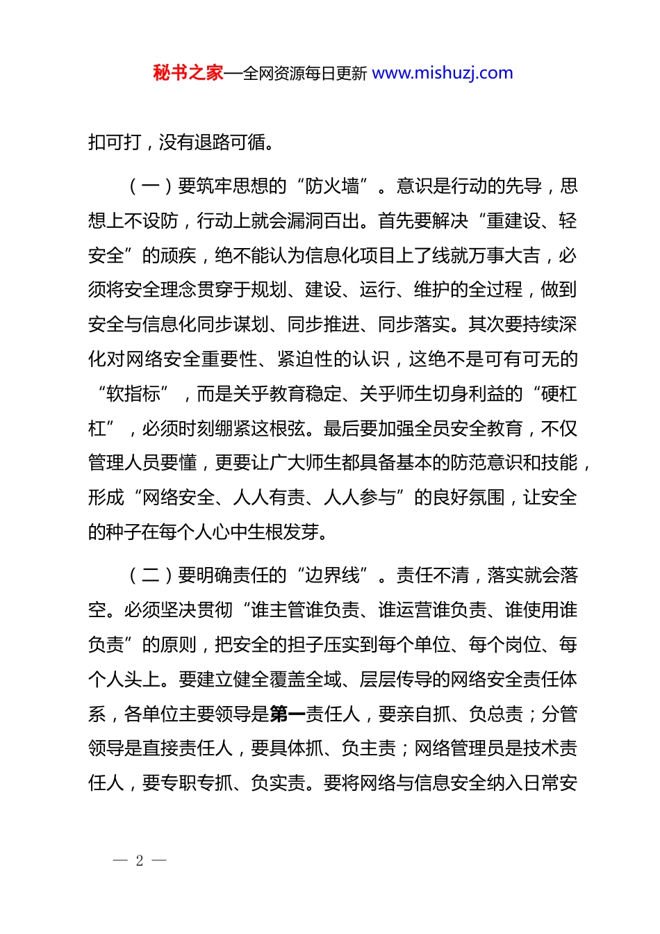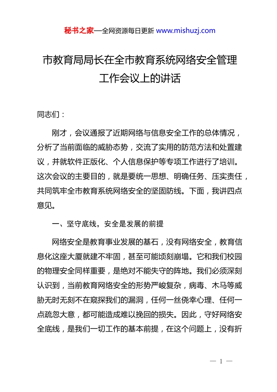 秘书之家—全网资源每日更新 www.mishuzj.com市教育局局长在全市教育系统网络安全管理工作会议上的讲话同志们:刚才,会议通报了近期网络与信息安全工作的总体情况,分析了当前面临的威胁态势,交流了实用的防范方法和处置建议,并就软件正版化、个人信息保护等专项工作进行了培训。这次会议的主要目的,就是要统一思想、明确任务、压实责任,共同筑牢全市教育系统网络安全的坚固防线。下面,我讲四点意见。一、坚守底线,安全是发展的前提网络安全是教育事业发展的基石,没有网络安全,教育信息化这座大厦就建不牢固,甚至可能顷刻崩塌。它和我们校园的物理安全同样重要,是绝对不能失守的阵地。我们必须深刻认识到,当前教育网络安全的形势严峻复杂,病毒、木马等威胁无时无刻不在窥探我们的漏洞,任何一丝侥幸心理、任何一点疏忽大意,都可能造成难以挽回的损失。因此,守好网络安全底线,是我们一切工作的基本前提,在这个问题上,没有折— 1 —秘书之家—全网资源每日更新 www.mishuzj.com扣可打,没有退路可循。(一)要筑牢思想的“防火墙”。意识是行动的先导,思想上不设防,行动上就会漏洞百出。首先要解决“重建设、轻安全”的顽疾,绝不能认为信息化项目上了线就万事大吉,必须将安全理念贯穿于规划、建设、运行、维护的全过程,做到安全与信息化同步谋划、同步推进、同步落实。其次要持续深化对网络安全重要性、紧迫性的认识,这绝不是可有可无的“软指标”,而是关乎教育稳定、关乎师生切身利益的“硬杠杠”,必须时刻绷紧这根弦。最后要加强全员安全教育,不仅管理人员要懂,更要让广大师生都具备基本的防范意识和技能,形成“网络安全、人人有责、人人参与”的良好氛围,让安全的种子在每个人心中生根发芽。(二)要明确责任的“边界线”。责任不清,落实就会落空。必须坚决贯彻“谁主管谁负责、谁运营谁负责、谁使用谁负责”的原则,把安全的担子压实到每个单位、每个岗位、每个人头上。要建立健全覆盖全域、层层传导的网络安全责任体系,各单位主要领导是第一责任人,要亲自抓、负总责;分管领导是直接责任人,要具体抓、负主责;网络管理员是技术责任人,要专职专抓、负实责。要将网络与信息安全纳入日常安— 2 —秘书之家—全网资源每日更新 www.mishuzj.com全管理范畴,作为重要指标纳入考核评价体系,对因责任不落实、措施不到位导致发生重大安全事件的,要依法依规严肃追责问责,切实拧紧责任链条。(三)要织密制度的“防护网”。没有规矩,不成方圆。安全不能只靠临时性的补救,必须依靠制度提供长期稳定的保障。要加快完善本地区、本单位网络安全管理的各项规章制度,从网络接入、系统上线、数据管理到日常运维、应急响应,每一个环节都要有章可循、有法可依。要重点制定和完善网络安全事件应急预案,明确处置流程、责任分工和报告机制,并定期组织演练,确保预案关键时刻真管用、真有效。要建立常态化的安全监测、通报、整改机制,像定期体检一样,及时发现“病灶”,清除“隐患”,让制度真正成为我们应对风险挑战的可靠屏障。二、精准发力,防范是有效的保障网络安全是动态的、持续的对抗,被动防御永远跟不上威胁变化的步伐。我们必须转变观念,从事后补救转向事前预防、事中管控,构筑起主动、精准、高效的纵深防御体系。这就像中医治未病,最高明的策略是让人不生病,而不是等病入膏肓再去找良方。我们要把工作的着力点放在预防上,下好先手棋,— 3 —秘书之家—全网资源每日更新 www.mishuzj.com打好主动仗。(一)要打好威胁的“预防针”。预警早一秒,风险少一分。要建立常态化的网络安全威胁预警机制,密切跟踪最新的漏洞信息和攻击手法,及时向各地各校发布风险提示和防范指南,让大家知道风险在哪里、是什么样的风险、什么时候可能发生风险。要针对当前常见的病毒、木马、网络钓鱼等威胁,结合我们教育系统内发生的真实案例,进行深入剖析,提炼出简单明了、操作性强的防范方法和处置建议,让即使非专业的老师和管理员也能看懂学会、用得上手。要加强对门户网站、业务系统、校园 led 大屏、邮箱等重要信息资产的日常监测和巡检...