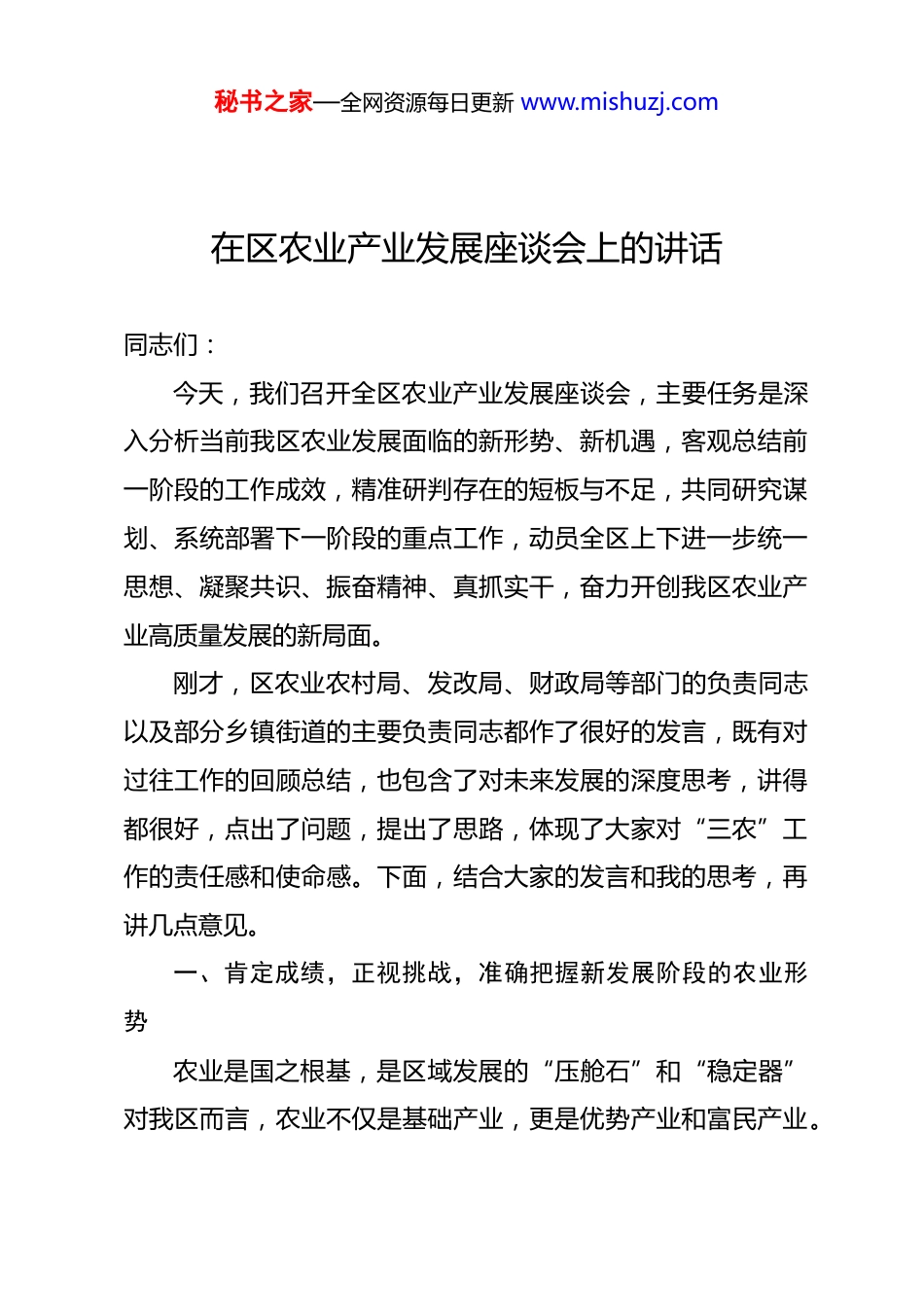秘书之家—全网资源每日更新 www.mishuzj.com在区农业产业发展座谈会上的讲话同志们:今天,我们召开全区农业产业发展座谈会,主要任务是深入分析当前我区农业发展面临的新形势、新机遇,客观总结前一阶段的工作成效,精准研判存在的短板与不足,共同研究谋划、系统部署下一阶段的重点工作,动员全区上下进一步统一思想、凝聚共识、振奋精神、真抓实干,奋力开创我区农业产业高质量发展的新局面。刚才,区农业农村局、发改局、财政局等部门的负责同志以及部分乡镇街道的主要负责同志都作了很好的发言,既有对过往工作的回顾总结,也包含了对未来发展的深度思考,讲得都很好,点出了问题,提出了思路,体现了大家对“三农”工作的责任感和使命感。下面,结合大家的发言和我的思考,再讲几点意见。一、肯定成绩,正视挑战,准确把握新发展阶段的农业形势农业是国之根基,是区域发展的“压舱石”和“稳定器”对我区而言,农业不仅是基础产业,更是优势产业和富民产业。秘书之家—全网资源每日更新 www.mishuzj.com近年来,区委、区政府始终把“三农”工作摆在重中之重的位置,团结带领全区广大干部群众,攻坚克难,锐意进取,推动农业农村发展取得了显著成效。回顾过去一年的工作,全区农业产业呈现出稳中有进、提质增效的良好态势。粮食安全根基持续夯实。面对复杂多变的外部环境和自然挑战,全区粮食生产实现连年丰收,总产量持续稳定在 15 亿斤以上的高位水平为保障区域粮食安全作出了XX 贡献。特别是在今年的夏粮生产中,通过大力推广优良品种和先进种植技术,全区小麦单产和总产再创新高,成功入选国家玉米单产提升整建制推进县,这是对我们工作的极大肯定。现代农业发展步伐加快。截至 2024 年第一季度,全区农林牧渔业总产值达到 9.53 亿元,增速达到 4.3%,展现出强劲的发展韧性。蔬菜、肉蛋奶、水产品等重要农产品的供给保障能力显著增强,第一季度蔬菜总产量达 8.37 万吨,肉蛋奶总产量达3.83 万吨,水产品总量达 1921 吨,有效满足了市场需求,丰富了百姓的“菜篮子”。特色产业集群初具规模。立足各乡镇资源禀赋,“一镇一业、一村一品”的产业布局日趋完善。XX村的草莓和樱桃、XX 镇的鲈鱼、XX 镇的棚菜、XX 镇的大枣等一批特色农产品品牌,在市场上已经有了一定的知名度,成为了带动农民增收致富的“金字招牌”,初步实现了从“有没秘书之家—全网资源每日更新 www.mishuzj.com有”到“好不好”的转变。高标准农田建设、农业基础设施升级等工作也在扎实推进。在肯定成绩的同时,我们更要清醒地认识到,对标高质量发展的要求,对标先进地区的成功经验,对标人民群众对美好生活的新期待,我区农业产业发展仍然面临着不少亟待破解的难题和挑战。一是产业链条不够长。我们的农业生产多以初级产品、原料产品为主,精深加工能力不足,产品附加值不高。农产品大多停留在“原字号”直销阶段,产业链延伸不够,农产品加工业产值占农业总产值的比重有待进一步提高。二是品牌效应不够响。虽然我们打造了一些特色产品,但缺乏一个能够代表全区整体形象、具有强大市场号召力的区域公共品牌。现有品牌多而散、小而弱,市场辨识度和竞争力有待加强,品牌溢价能力未能充分体现。三是科技赋能不够深。现代农业科技的应用广度和深度仍然不足,智慧农业、数字农业尚处于起步探索阶段。产学研合作机制不够紧密,科技成果向现实生产力转化的通道还不够顺畅,农业生产的标准化、智能化水平亟待提升。四是融合发展不够活。农业与旅游、康养、文化、电商等产业的融合程度不高,休闲农业、观光农业、创意农业等新业态发展滞后,农业的多种功能和多元价值尚未得到充分发掘。这些问题,是制约我区农业从“大”到“强”转变的关键秘书之家—全网资源每日更新 www.mishuzj.com瓶颈,必须下大力气加以解决。二、聚焦关键,精准发力,全力筑牢农业高质量发展的根基推动农业产业高质量发展是一项系统工程,不能“胡子眉毛一把抓”,必须找准主攻方向和关键环节,实施精准策略,实现重点突破。首先,要坚决扛起粮食安全政治责任。粮食安全是“国之大者”,任何时候都不能有丝毫放松。...