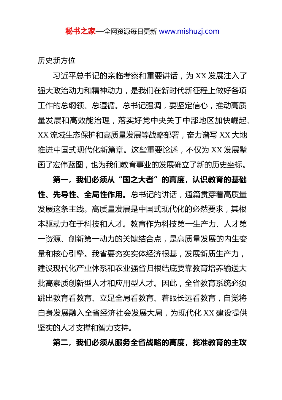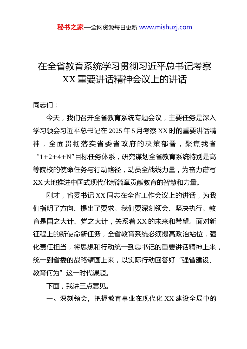 秘书之家—全网资源每日更新 www.mishuzj.com在全省教育系统学习贯彻习近平总书记考察XX 重要讲话精神会议上的讲话同志们:今天,我们召开全省教育系统专题会议,主要任务是深入学习领会习近平总书记在 2025 年 5 月考察 XX 时的重要讲话精神 , 全 面 贯 彻 落 实 省 委 省 政 府 的 决 策 部 署 , 聚 焦 我 省“1+2+4+N”目标任务体系,研究谋划全省教育系统特别是高等院校的使命任务与行动路径,动员全战线力量,为奋力谱写XX 大地推进中国式现代化新篇章贡献教育的智慧和力量。刚才,省委书记 XX 同志在全省工作会议上的讲话,为我们指明了方向、提出了要求。我们要深刻领会、坚决执行。教育是国之大计、党之大计,关系着 XX 的未来和希望。面对新征程上的新使命新任务,全省教育系统必须提高政治站位,强化责任担当,将思想和行动统一到总书记的重要讲话精神上来,统一到省委的战略擘画上来,以实际行动回答好“强省建设、教育何为”这一时代课题。下面,我讲三点意见。一、深刻领会,把握教育事业在现代化 XX 建设全局中的秘书之家—全网资源每日更新 www.mishuzj.com历史新方位习近平总书记的亲临考察和重要讲话,为 XX 发展注入了强大政治动力和精神动力,是我们在新时代新征程上做好各项工作的总纲领、总遵循。总书记强调,要坚定信心,推动高质量发展和高效能治理,落实好党中央关于中部地区加快崛起、XX 流域生态保护和高质量发展等战略部署,奋力谱写 XX 大地推进中国式现代化新篇章。这些重要论述,不仅为 XX 发展擘画了宏伟蓝图,也为我们教育事业的发展确立了新的历史坐标。第一,我们必须从“国之大者”的高度,认识教育的基础性、先导性、全局性作用。总书记的讲话,通篇贯穿着高质量发展这条主线。高质量发展是中国式现代化的必然要求,其根本驱动力在于科技和人才。教育作为科技第一生产力、人才第一资源、创新第一动力的关键结合点,是高质量发展的内生变量和核心引擎。我省要夯实实体经济根基,发展新质生产力,建设现代化产业体系和农业强省归根结底要靠教育培养输送大批高素质创新型人才和应用型人才。因此,全省教育系统必须跳出教育看教育、立足全局看教育、着眼长远看教育,自觉将自身发展融入全省经济社会发展大局,为现代化 XX 建设提供坚实的人才支撑和智力支持。第二,我们必须从服务全省战略的高度,找准教育的主攻秘书之家—全网资源每日更新 www.mishuzj.com方向和核心任务。省委提出的“1+2+4+N”目标任务体系,是贯彻落实总书记重要讲话精神的具体化、项目化行动方案。这一体系明确了当前和今后一个时期全省发展的总目标、方法论、着力点和工作要求,构成了现代化 XX 建设的“四梁八柱”。其中,“1”是总目标,“2”是方法论,“4”是四大着力点,涵盖产业、农业、生态、民生,“N”则是一系列重点工作。教育系统不能游离于这个体系之外,必须主动对标、精准嵌入,将服务“1+2+4+N”作为我们工作的出发点和落脚点。我们的学科专业设置、人才培养模式、科研创新方向、社会服务功能,都必须与这一体系同频共振、同向发力,真正做到省委省政府的中心工作推进到哪里,教育的服务和支撑就跟进到哪里。第三,我们必须从践行嘱托的政治高度,扛起教育在生态文明建设中的特殊责任。总书记在 XX 考察时,特别强调要“着力加强生态环境保护,持之以恒加强重点流域生态保护治理,深化污染防治攻坚,筑牢生态安全屏障”。省委书记 XX同志也指出,要为奋力谱写 XX 大地推进中国式现代化新篇章厚植绿色底色、生态优势。这是总书记的殷殷嘱托,也是 XX实现永续发展的必然选择。高校作为知识、文化和创新的高地,不仅是能源消耗和碳排放的重要单元,更是传播生态文明理念、研发绿色低碳技术、培养生态保护人才的关键阵地。我们必须秘书之家—全网资源每日更新 www.mishuzj.com深刻认识到,在推动绿色低碳转型中,教育系统责任重大、使命光荣,必须先行一步、争当表率。二、精准对标,明确服务“1+2+4+N”目标体系的核心任务全省教育系统要紧密围绕“1+2+4+N”目标体系,发挥自身优势,找准切入点和...