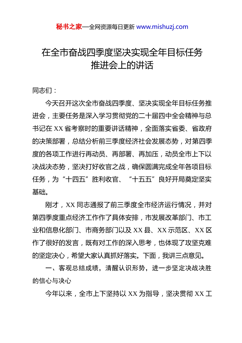 秘书之家—全网资源每日更新 www.mishuzj.com在全市奋战四季度坚决实现全年目标任务推进会上的讲话同志们:今天召开这次全市奋战四季度、坚决实现全年目标任务推进会,主要任务是深入学习贯彻党的二十届四中全会精神与总书记在 XX 省考察时的重要讲话精神,全面落实省委、省政府的决策部署,总结分析前三季度经济社会发展态势,对第四季度的各项工作进行再动员、再部署、再加压,动员全市上下以决战决态势,坚决打好收官之战,确保圆满完成全年各项目标任务,为“十四五”胜利收官、“十五五”良好开局奠定坚实基础。刚才,XX 同志通报了前三季度全市经济运行情况,并对第四季度重点经济工作作了具体安排,市发展改革部门、市工业和信息化部门、市商务部门以及 XX 县、XX 示范区、XX 区作了很好的发言,既有对工作的深入思考,也体现了攻坚克难的坚定决心,希望大家认真抓好落实。下面,我讲三点意见。一、客观总结成绩,清醒认识形势,进一步坚定决战决胜的信心与决心今年以来,全市上下坚持以 XX 为指导,坚决贯彻 XX 工秘书之家—全网资源每日更新 www.mishuzj.com作要求,坚持稳中求进工作总基调,完整、准确、全面贯彻新发展理念,锚定高质量发展首要任务,全力以赴拼经济、促发展、惠民生、保稳定,推动经济运行呈现出稳中有进、结构趋优、动能增强的良好态势。从主要指标看,经济发展的“基本盘”更加稳固。前三季度,全市经济运行延续了回升向好态势。初步核算,全市地区生产总值同比增长 5.2%,高于全国、全省平均水平;规模以上工业增加值增长 6.5%,工业“压舱石”作用持续显现;固定资产投资增长 6.1%,特别是制造业投资和高技术产业投资分别实现 10.3%和 12.5%的较快增长,投资结构持续优化;社会消费品零售总额增长 7.8%,市场活力稳步恢复。这些关键数据充分说明,全市经济发展的韧性强、潜力大、后劲足,长期向好的基本面没有改变。从发展动能看,转型升级的“新引擎”更具活力。新旧动能转换步伐加快。前三季度,战略性新兴产业增加值占规上工业比重达到 28%,高新技术产业增加值同比增长 11.2%,数字经济核心产业加速成长。项目建设取得新突破,一批投资规模大、科技含量高、带动能力强的重大产业项目相继落地开工、投产达效,为经济持续健康发展注入了强劲动力。创新生态持续优化,全市研发投入强度稳步提升,新增省级以上创新平台秘书之家—全网资源每日更新 www.mishuzj.com8 家,技术合同成交额增长超过 20%,创新正加速成为引领发展的第一动力。从民生福祉看,社会大局的“稳定器”更加牢靠。就业形势总体稳定,前三季度城镇新增就业 6.5 万人,完成了全年目标的 92%。居民收入与经济增长基本同步,城乡居民人均可支配收入分别增长 5.0%和 6.8%。民生领域的财政支出占比始终保持在 75%以上,教育、医疗、养老、社保等基本公共服务体系不断完善,人民群众的获得感、幸福感、安全感持续增强。平安 XX、法治 XX 建设向纵深推进,安全生产形势平稳,社会大局保持和谐稳定。在肯定成绩的同时,也必须清醒地看到,当前发展面临的困难和挑战依然不少。从外部看,全球经济复苏乏力,地缘政治冲突加剧,不稳定不确定因素增多。从内部看,经济恢复的基础尚不牢固,部分行业和企业经营压力较大,有效需求仍然不足,一些长期积累的结构性、周期性矛盾依然突出。特别是对照全年目标任务,部分指标进度不及预期,完成任务尚有缺口,时间紧、任务重、压力大。现在距离年底只剩下不足两个月的时间,已经到了决战决战、冲刺撞线的关键时刻。全市各级各部门必须切实增强紧迫感、责任感和使命感,把思想和行动统一到市委、市政府的决策部署上来,下定决心、坚定信心,秘书之家—全网资源每日更新 www.mishuzj.com以“人一之、我十之”的拼抢劲头,向全年目标发起最后冲刺。二、聚焦重点领域,实施精准攻坚,全力打好决胜全年的收官之战第四季度是定全年、保全局的最后关口,做好这个季度的工作,对于完成“十四五”规划、衔接“十五五”发展至关重要。必须全面落实“两高四着力”重大要求,紧紧围绕省委“1+2+4+N”目标任务体系,坚持问题导...