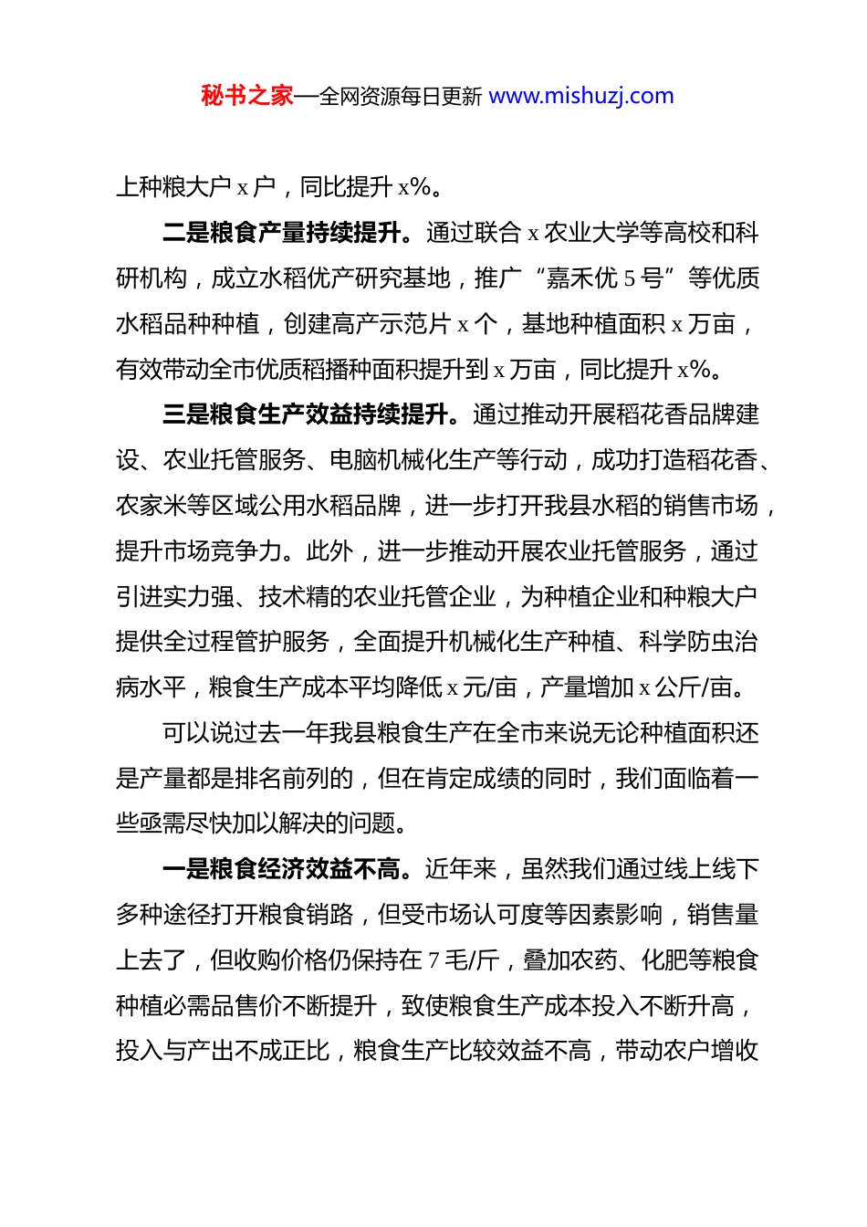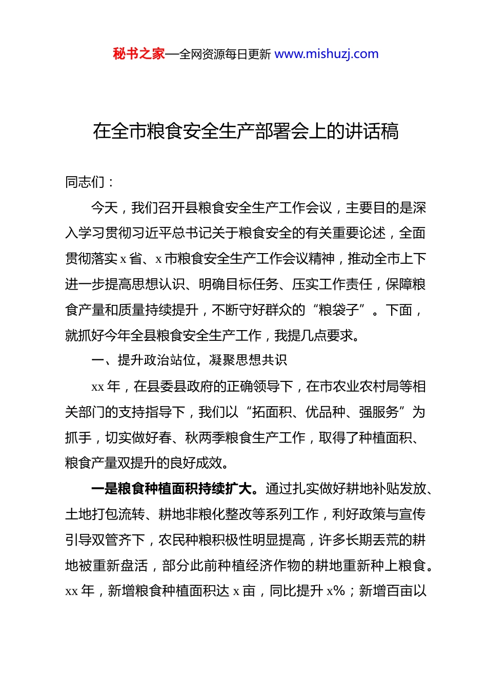 秘书之家—全网资源每日更新 www.mishuzj.com在全市粮食安全生产部署会上的讲话稿同志们:今天,我们召开县粮食安全生产工作会议,主要目的是深入学习贯彻习近平总书记关于粮食安全的有关重要论述,全面贯彻落实 x 省、x 市粮食安全生产工作会议精神,推动全市上下进一步提高思想认识、明确目标任务、压实工作责任,保障粮食产量和质量持续提升,不断守好群众的“粮袋子”。下面,就抓好今年全县粮食安全生产工作,我提几点要求。一、提升政治站位,凝聚思想共识xx 年,在县委县政府的正确领导下,在市农业农村局等相关部门的支持指导下,我们以“拓面积、优品种、强服务”为抓手,切实做好春、秋两季粮食生产工作,取得了种植面积、粮食产量双提升的良好成效。一是粮食种植面积持续扩大。通过扎实做好耕地补贴发放、土地打包流转、耕地非粮化整改等系列工作,利好政策与宣传引导双管齐下,农民种粮积极性明显提高,许多长期丢荒的耕地被重新盘活,部分此前种植经济作物的耕地重新种上粮食。xx 年,新增粮食种植面积达 x 亩,同比提升 x%;新增百亩以秘书之家—全网资源每日更新 www.mishuzj.com上种粮大户 x 户,同比提升 x%。二是粮食产量持续提升。通过联合 x 农业大学等高校和科研机构,成立水稻优产研究基地,推广“嘉禾优 5 号”等优质水稻品种种植,创建高产示范片 x 个,基地种植面积 x 万亩,有效带动全市优质稻播种面积提升到 x 万亩,同比提升 x%。三是粮食生产效益持续提升。通过推动开展稻花香品牌建设、农业托管服务、电脑机械化生产等行动,成功打造稻花香、农家米等区域公用水稻品牌,进一步打开我县水稻的销售市场,提升市场竞争力。此外,进一步推动开展农业托管服务,通过引进实力强、技术精的农业托管企业,为种植企业和种粮大户提供全过程管护服务,全面提升机械化生产种植、科学防虫治病水平,粮食生产成本平均降低 x 元/亩,产量增加 x 公斤/亩。可以说过去一年我县粮食生产在全市来说无论种植面积还是产量都是排名前列的,但在肯定成绩的同时,我们面临着一些亟需尽快加以解决的问题。一是粮食经济效益不高。近年来,虽然我们通过线上线下多种途径打开粮食销路,但受市场认可度等因素影响,销售量上去了,但收购价格仍保持在 7 毛/斤,叠加农药、化肥等粮食种植必需品售价不断提升,致使粮食生产成本投入不断升高,投入与产出不成正比,粮食生产比较效益不高,带动农户增收秘书之家—全网资源每日更新 www.mishuzj.com的效果较差。二是农田水利设施不够完善。近年来,我们大力推动开展高标准农田建设,生产条件大为改善,但对于部分远离道路,低洼或坡地的耕地设施建设投入仍存在不足,水渠引水、排水难,成为粮食生产的“拦路虎”,基础设施亟需加强。三是科学化种植覆盖不高。近年来,虽然我们通过大力引进粮食生产社会化服务企业,有效提升了部分农业企业和种植大户的机械化、科学化种植水平,但对于小微散农户来说覆盖率不足,很多农户认为自己种植面积不大,没必要给钱别人进行管护,有的由于地形限制难以开展规模化、集约化生产,科学种植水平偏低。习近平总书记强调,“要始终把保障国家粮食安全摆在首位,加快实现农业农村现代化,提高粮食综合生产能力,确保平时产得出、供得足,极端情况下顶得上、靠得住。”推动发展粮食生产,不仅是经济问题,更是民生问题,也是政治问题,各单位(部门)和各镇(街道)千万不能有松懈思想。在 x 省、x 市粮食安全生产工作会议,x 省长多次强调一定要严格做到“三个不减”,x 市长要求务必把粮食生产放在重要位置,作为年度考核的重要内容,可以说中央到地方,对粮食生产都是高度关注、高度重视的,我们绝对不能因为 xx 年取得了一定的秘书之家—全网资源每日更新 www.mishuzj.com进步就故步自封、停滞不前,一定要从讲政治的高度把思想认识提上来,对政策形势进行再分析再把握,对存在问题进行再动员再攻坚,真正做到思想不松懈,政策不变形,力度不减弱,确保今年粮食安全生产在新的起点上再创新高。二、聚焦重点攻坚,推动提质增效今年我县的粮食安全生产的任务依...