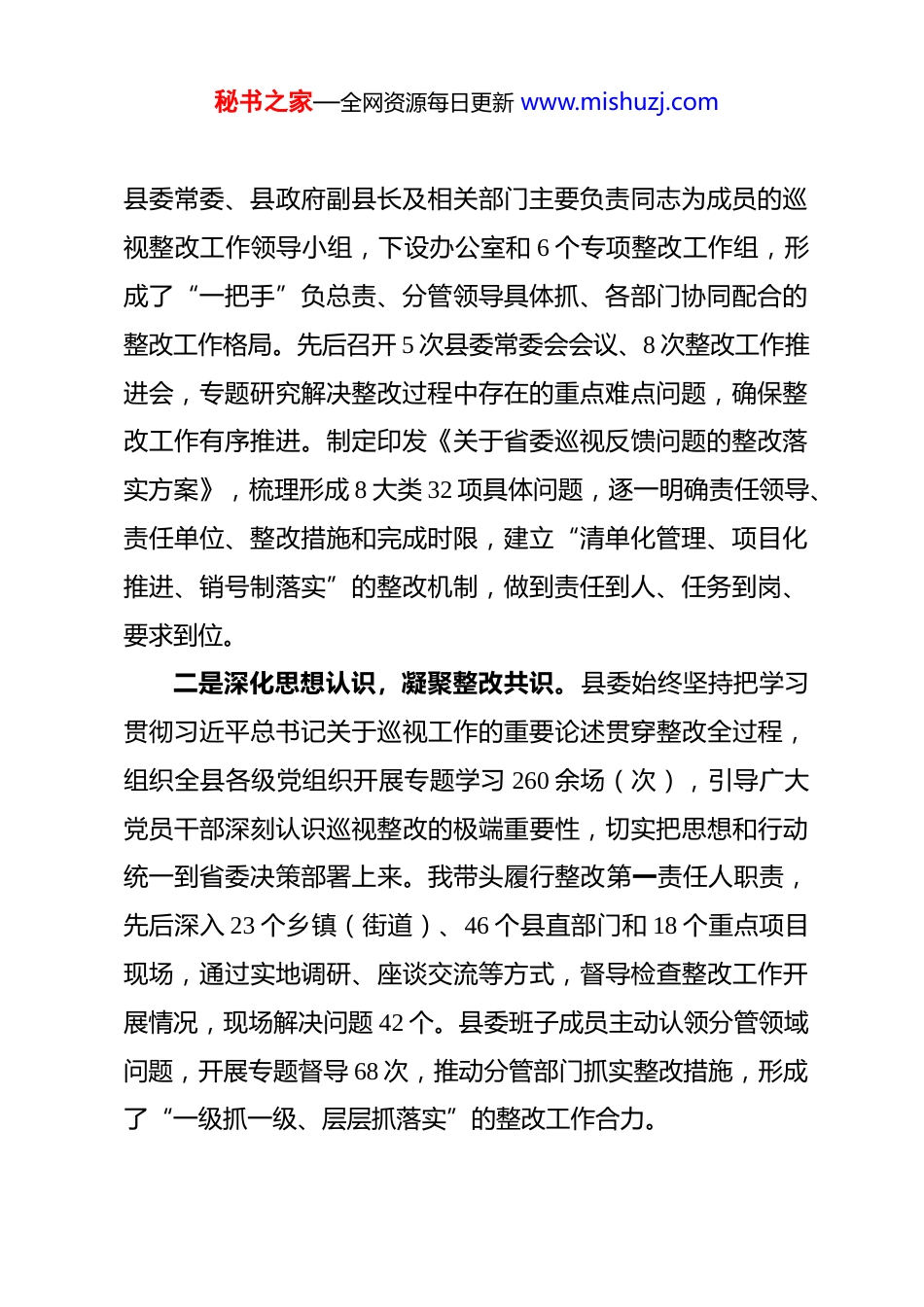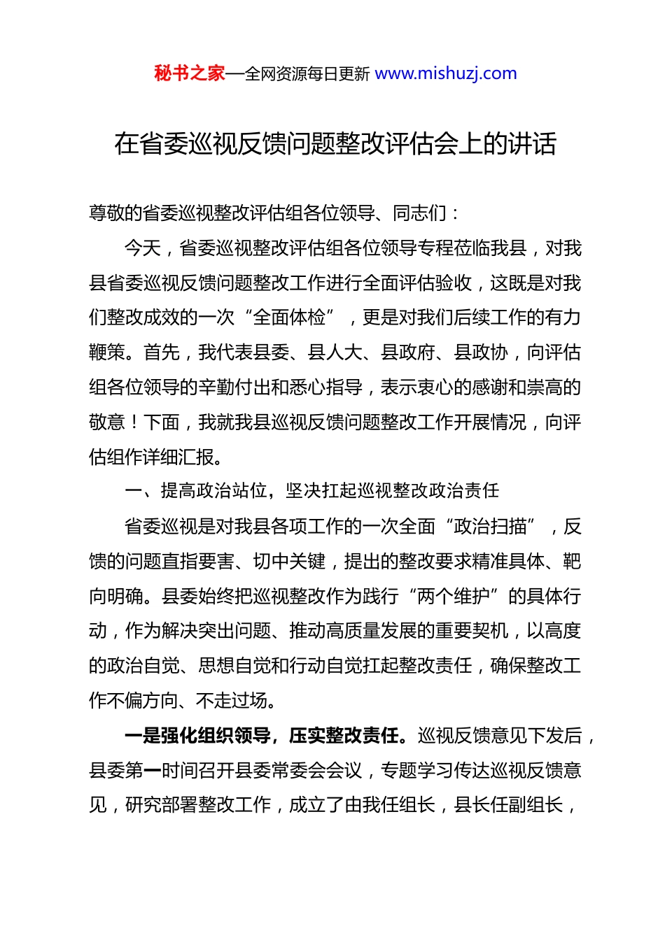 秘书之家—全网资源每日更新 www.mishuzj.com在省委巡视反馈问题整改评估会上的讲话尊敬的省委巡视整改评估组各位领导、同志们:今天,省委巡视整改评估组各位领导专程莅临我县,对我县省委巡视反馈问题整改工作进行全面评估验收,这既是对我们整改成效的一次“全面体检”,更是对我们后续工作的有力鞭策。首先,我代表县委、县人大、县政府、县政协,向评估组各位领导的辛勤付出和悉心指导,表示衷心的感谢和崇高的敬意!下面,我就我县巡视反馈问题整改工作开展情况,向评估组作详细汇报。一、提高政治站位,坚决扛起巡视整改政治责任省委巡视是对我县各项工作的一次全面“政治扫描”,反馈的问题直指要害、切中关键,提出的整改要求精准具体、靶向明确。县委始终把巡视整改作为践行“两个维护”的具体行动,作为解决突出问题、推动高质量发展的重要契机,以高度的政治自觉、思想自觉和行动自觉扛起整改责任,确保整改工作不偏方向、不走过场。一是强化组织领导,压实整改责任。巡视反馈意见下发后,县委第一时间召开县委常委会会议,专题学习传达巡视反馈意见,研究部署整改工作,成立了由我任组长,县长任副组长,秘书之家—全网资源每日更新 www.mishuzj.com县委常委、县政府副县长及相关部门主要负责同志为成员的巡视整改工作领导小组,下设办公室和 6 个专项整改工作组,形成了“一把手”负总责、分管领导具体抓、各部门协同配合的整改工作格局。先后召开 5 次县委常委会会议、8 次整改工作推进会,专题研究解决整改过程中存在的重点难点问题,确保整改工作有序推进。制定印发《关于省委巡视反馈问题的整改落实方案》,梳理形成 8 大类 32 项具体问题,逐一明确责任领导、责任单位、整改措施和完成时限,建立“清单化管理、项目化推进、销号制落实”的整改机制,做到责任到人、任务到岗、要求到位。二是深化思想认识,凝聚整改共识。县委始终坚持把学习贯彻习近平总书记关于巡视工作的重要论述贯穿整改全过程,组织全县各级党组织开展专题学习 260 余场(次),引导广大党员干部深刻认识巡视整改的极端重要性,切实把思想和行动统一到省委决策部署上来。我带头履行整改第一责任人职责,先后深入 23 个乡镇(街道)、46 个县直部门和 18 个重点项目现场,通过实地调研、座谈交流等方式,督导检查整改工作开展情况,现场解决问题 42 个。县委班子成员主动认领分管领域问题,开展专题督导 68 次,推动分管部门抓实整改措施,形成了“一级抓一级、层层抓落实”的整改工作合力。秘书之家—全网资源每日更新 www.mishuzj.com三是健全工作机制,强化整改保障。建立整改工作“周调度、月通报、季评估”工作机制,领导小组办公室每周汇总整改进展,每月通报整改进度,每季度组织开展整改成效评估,对整改滞后的 12 个单位进行约谈提醒,倒逼整改责任落实。组建由县纪委监委、县委组织部牵头的专项督查组,采取“四不两直”方式开展常态化督查检查 32 次,发现并纠正整改工作中存在的形式主义、官僚主义问题 18 个,确保整改工作真抓实改、取得实效。同时,注重整改过程中的资料收集和档案规范,形成完整的整改台账,为后续评估验收奠定坚实基础。二、聚焦问题导向,扎实推进巡视整改落地见效县委始终坚持问题导向、目标导向和结果导向相统一,针对巡视反馈的各类问题,不回避、不遮掩、不推诿,逐一制定针对性整改措施,全力以赴抓整改、补短板、强弱项,整改工作取得阶段性成效。(一)关于贯彻落实党的路线方针政策和党中央重大决策部署方面问题的整改针对巡视反馈的“理论学习不深不透、高质量发展推进不力、乡村振兴衔接有短板”等问题,我们从三个方面发力整改:一是深化理论武装,筑牢思想根基。修订完善县委理论学习中心组学习制度,每月开展 1 次专题学习、每季度开展 1 次集中秘书之家—全网资源每日更新 www.mishuzj.com研讨,全年累计开展专题学习 12 次、研讨 4 次,推动习近平新时代中国特色社会主义思想入脑入心。开展“政策解读进基层”活动 86 场(次),覆盖党员干部 1.2 万余人,切实提升干部政策理解和执行能力。二是...