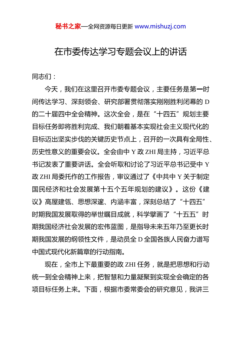 秘书之家—全网资源每日更新 www.mishuzj.com在市委传达学习专题会议上的讲话同志们:今天,我们在这里召开市委专题会议,主要任务是第一时间传达学习、深刻领会、研究部署贯彻落实刚刚胜利闭幕的 D的二十届四中全会精神。这次全会,是在“十四五”规划主要目标任务即将胜利完成、我们朝着基本实现社会主义现代化的目标迈出坚实步伐的关键历史节点上,召开的一次具有全局性、历史性意义的重要会议。全会由中 Y 政 ZHI 局主持,习近平总书记发表了重要讲话。全会听取和讨论了习近平总书记受中 Y政 ZHI 局委托作的工作报告,审议通过了《中共中 Y 关于制定国民经济和社会发展第十五个五年规划的建议》。这份《建议》高屋建瓴、思想深邃、内涵丰富,深刻总结了“十四五”时期我国发展取得的举世瞩目成就,科学擘画了“十五五”时期我国经济社会发展的宏伟蓝图,是指导未来五年乃至更长时期我国发展的纲领性文件,是动员全 D 全国各族人民奋力谱写中国式现代化新篇章的行动指南。现在,全市上下最重要的政 ZHI 任务,就是把思想和行动统一到全会精神上来,把智慧和力量凝聚到实现全会确定的各项目标任务上来。下面,根据市委常委会的研究意见,我讲三秘书之家—全网资源每日更新 www.mishuzj.com点意见。一、深学细照、深思细悟,完整准确全面把握 D 的二十届四中全会精神学习贯彻 D 的二十届四中全会精神,首要在于学深悟透、准确把握其精神实质和核心要义。全市各级 D 组织和广大 D 员干部,必须原原本本学、联系实际学、带着问题学,切实做到入脑入心、见行见效。第一,深刻把握 D 的二十届四中全会承前启后的重大历史地位。全会公报明确指出,“十五五”时期是基本实现社会主义现代化夯实基础、全面发力的关键五年。这个定位科学精准,揭示了“十五五”时期的特殊重要性。向前看,“十四五”时期,面对波谲云诡的国际环境和艰巨繁重的国内改革发展稳定任务,以习近平同志为核心的 D 中 Y 团结带领全 D 全国各族人民迎难而上、砥砺前行,推动 D 和国家事业取得新的重大成就,为“十五五”发展奠定了坚实基础。向后看,到 2035 年基本实现社会主义现代化,是我们 D 确立的宏伟目标。“十五五”正是这一征程中承上启下、继往开来的关键一程,其发展成效直接关系到 2035 年目标能否顺利实现。全会在这个关键节点审议通过《建议》,为未来五年的发展指明了方向、明确了路径,必将对全面建成社会主义现代化强国、实现第二个百年奋斗目秘书之家—全网资源每日更新 www.mishuzj.com标产生重大而深远的影响。第二,深刻把握“十四五”时期我国发展取得重大成就的根本原因。公报全面回顾了“十四五”以来的工作,指出我们有效应对了严峻复杂的国际形势和接踵而至的巨大风险挑战,推动经济社会发展取得了来之不易的成就。这些成就的取得,最根本的原因在于有习近平总书记作为 D 中 Y 的核心、全 D 的核心领航掌舵,在于有习近平新时代中国特色社会主义思想的科学指引。实践再次雄辩地证明,“两个确立”是战胜一切艰难险阻、应对一切不确定性的最大确定性、最大底气、最大保证。学习贯彻全会精神,必须把深刻领悟“两个确立”的决定性意义摆在首位,不断增强“四个意识”、坚定“四个自信”、做到“两个维护”,始终在思想上政 ZHI 上行动上同以习近平同志为核心的 D 中 Y 保持高度一致。第三,深刻把握“十五五”时期经济社会发展的指导思想《建议》提出的指导思想,是管总的、管根本的。这就是要高举中国特色社会主义伟大旗帜,全面贯彻习近平新时代中国特色社会主义思想,紧紧围绕全面建成社会主义现代化强国、实现第二个百年奋斗目标,以中国式现代化全面推进中华民族伟大复兴这个中心任务,统筹推进“五位一体”总体布局,协调推进“四个全面”战略布局,坚持稳中求进工作总基调,完整、秘书之家—全网资源每日更新 www.mishuzj.com准确、全面贯彻新发展理念,加快构建新发展格局,着力推动高质量发展。这一指导思想,既一以贯之,又与时俱进,体现了我们 D 对发展规律认识的深化,是我们谋划和推进 XX 市“十五五”时期一切...