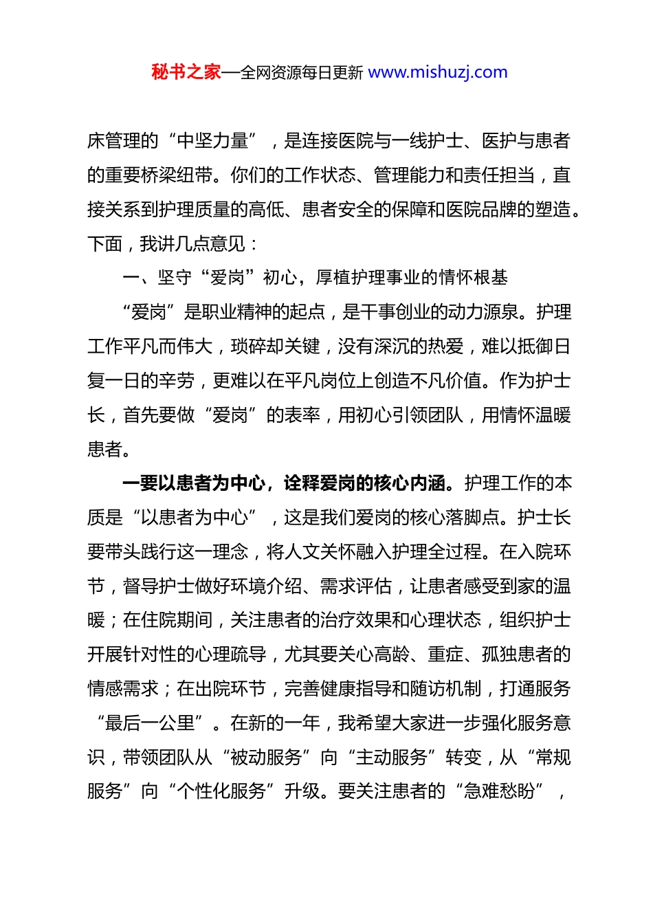秘书之家—全网资源每日更新 www.mishuzj.com在武冈市人民医院护士长座谈会上的讲话各位护士长、同志们:院党总支决定在年前,陆续召开一系列的座谈会,主要目的是全面回顾 2025 年工作,更早的谋划 2026 年工作,进一步凝聚共识,奋进有为,推动医院高质量发展。今天,是我们召开的第二场座谈会,主要是请我们的护士长一起来为医院发展出谋划策。刚才,一些护士长代表提出了很多很好的建议,有些讲得很好,突出了主人翁地位,体现出了家院情怀,提出的一些问题,请护理部梳理后以党总支的名义,交办给相关科室,能解决的立即解决,暂时不能解决的再想办法努力解决,不能解决的那也得请大家理解,等条件更好的时候再进行研究解决。2025 年,大家以病房为战场、以患者为中心,用专业的技术、温暖的服务和无私的奉献,撑起了医院护理工作的“半边天”。护理质量持续提升,患者满意度稳步提高,院感防控成效显著,这些成绩的取得,离不开每一位护士长的以身作则和悉心管理。借此机会,我代表院党总支向你们并通过你们向全院的护士表示衷心的感谢。 2026 年,是医院高质量发展的关键之年,也是护理事业提质增效的攻坚之年。护士长作为护理团队的“领头雁”、临秘书之家—全网资源每日更新 www.mishuzj.com床管理的“中坚力量”,是连接医院与一线护士、医护与患者的重要桥梁纽带。你们的工作状态、管理能力和责任担当,直接关系到护理质量的高低、患者安全的保障和医院品牌的塑造。下面,我讲几点意见:一、坚守“爱岗”初心,厚植护理事业的情怀根基“爱岗”是职业精神的起点,是干事创业的动力源泉。护理工作平凡而伟大,琐碎却关键,没有深沉的热爱,难以抵御日复一日的辛劳,更难以在平凡岗位上创造不凡价值。作为护士长,首先要做“爱岗”的表率,用初心引领团队,用情怀温暖患者。一要以患者为中心,诠释爱岗的核心内涵。护理工作的本质是“以患者为中心”,这是我们爱岗的核心落脚点。护士长要带头践行这一理念,将人文关怀融入护理全过程。在入院环节,督导护士做好环境介绍、需求评估,让患者感受到家的温暖;在住院期间,关注患者的治疗效果和心理状态,组织护士开展针对性的心理疏导,尤其要关心高龄、重症、孤独患者的情感需求;在出院环节,完善健康指导和随访机制,打通服务“最后一公里”。在新的一年,我希望大家进一步强化服务意识,带领团队从“被动服务”向“主动服务”转变,从“常规服务”向“个性化服务”升级。要关注患者的“急难愁盼”,秘书之家—全网资源每日更新 www.mishuzj.com比如优化住院流程、改善病房环境、提升沟通效率,让患者在就医过程中感受到尊重、理解和关爱。要善于挖掘科室服务亮点,打造特色护理品牌,像“无陪护病房”“疼痛管理小组”等模式,都可以结合科室实际积极探索,让爱岗情怀转化为患者看得见、摸得着的服务成效。二要以医院为家园,凝聚爱岗的集体力量。市人民医院是我们共同的家园,医院的发展与每个人的成长息息相关。护士长作为科室护理工作的“当家人”,要带头树立“院兴我荣、院衰我耻”的集体荣誉感,把个人价值的实现融入医院发展大局。在日常工作中,要主动宣传医院的发展理念、规章制度和工作要求,引导护士团队增强归属感和认同感;在面对困难和挑战时,要挺身而出、迎难而上,带领团队攻坚克难;在对外沟通交流中,要维护医院形象,展现我院护理队伍的专业素养和精神风貌。同时,我们一定要关心关爱团队成员,当好护士的“贴心人”。护理工作压力大、强度高,大家要多倾听护士的心声,了解她们的工作困惑和生活困难,通过合理排班、心理疏导、正向激励等方式,缓解她们的身心压力。要搭建护士成长平台,关注不同层级护士的职业发展需求,制定个性化的培训计划,帮助她们提升专业能力、实现职业价值。只有让护士感受到团队的温暖和医院的关怀,才能凝聚起“心往一处想、秘书之家—全网资源每日更新 www.mishuzj.com劲往一处使”的强大合力,让爱岗成为整个护理团队的共同追求。三要以职业为信仰,筑牢爱岗的精神支柱。护理是一份需要信仰的职业,这份信仰源于对生命的敬畏、对健康的守护。护士长要带头坚...