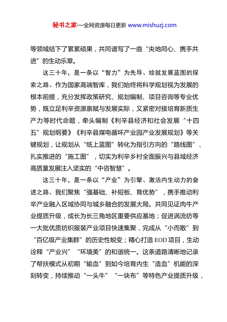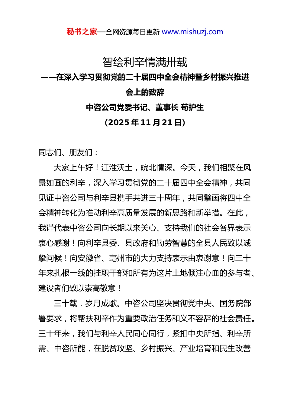 秘书之家—全网资源每日更新 www.mishuzj.com智绘利辛情满卅载——在深入学习贯彻党的二十届四中全会精神暨乡村振兴推进会上的致辞中咨公司党委书记、董事长 苟护生(2025 年 11 月 21 日)同志们、朋友们:大家上午好!江淮沃土,皖北情深。今天,我们相聚在风景如画的利辛,深入学习贯彻党的二十届四中全会精神,共同见证中咨公司与利辛县携手共进三十周年,共同擘画将四中全会精神转化为推动利辛高质量发展的新思路和新举措。在此,我谨代表中咨公司向长期以来关心、支持我们的社会各界表示衷心感谢!向利辛县委、县政府和勤劳智慧的全县人民致以诚挚问候!向安徽省、亳州市的大力支持表示由衷谢意!向三十年来扎根一线的挂职干部和所有为这片土地倾注心血的参与者、建设者们致以崇高敬意!三十载,岁月成歌。中咨公司坚决贯彻党中央、国务院部署要求,将帮扶利辛作为重要政治任务和义不容辞的社会责任。三十年来,我们与利辛人民同心同行,紧扣中央所指、利辛所需、中咨所能,在脱贫攻坚、乡村振兴、产业培育和民生改善秘书之家—全网资源每日更新 www.mishuzj.com等领域结下了累累硕果,共同谱写了一曲“央地同心、携手共进”的生动乐章。这三十年,是一条以“智力”为先导、绘就发展蓝图的探索之路。作为国家高端智库,我们始终将科学规划视为发展的根本前提,充分发挥政策研究、规划编制、项目咨询等专业优势,既立足利辛资源禀赋与发展实际,又紧密对接培育新质生产力等时代命题,牵头编制《利辛县经济和社会发展“十四五”规划纲要》《利辛县煤电循环产业园产业发展规划》等关键规划,让规划从“纸上蓝图”转化为指引方向的“路线图”、扎实推进的“施工图”,切实为利辛乡村全面振兴与县域经济高质量发展注入坚实的“中咨智慧”。这三十年,是一条以“产业”为引擎、激活内生动力的奋进之路。我们聚焦“强基础、补短板、育优势”,携手推动利辛产业融入区域协同与城乡融合的发展大局。共同见证肉牛产业提质升级,成长为长三角地区重要供应基地;促进涡流纺等一大批优质纺织服装产业项目快速集聚,完成从“小而散”到“百亿级产业集群”的历史性蜕变;精心打造 EOD 项目,生动诠释“产业兴”“环境美”的和谐统一。这条道路清晰地记录了帮扶模式从初期“输血”到如今培育内生“造血”机能的深刻转变,持续推动“一头牛”“一块布”等特色产业提质升级,秘书之家—全网资源每日更新 www.mishuzj.com构建起一个特色鲜明、根基牢固、韧性强劲的现代产业体系,让利辛高质量发展的“底气”越来越足。这三十年,是一条以“人才”为基石、推动基层发展的赋能之路。开展定点帮扶以来,我们累计选派了 32 名政治素质好、业务能力强的挂职干部。他们始终保持“事事有回应、件件有着落”的工作作风,扎根基层、倾情投入,既是“政策宣传员”,也是“实践指导员”,更是“桥梁联络员”,与利辛干部群众同频共振、融为一体。同时,他们也在利辛这片广阔的舞台得到了宝贵的锻炼,综合能力在实践中得到全面提升,成为了中咨公司的骨干力量,在工作岗位上发挥了重要作用。这三十年,是一条以“民生”为根本、传递温暖关怀的暖心之路。我们始终坚持以人民为中心的发展理念,将“改善民生、增进福祉”作为帮扶工作的出发点和落脚点,聚焦教育、医疗、基础设施、人居环境等领域,持续实施推动危房改造、援建卫生院、捐赠医疗设备、开展助学活动等一系列暖心举措,每一项工作都瞄准群众“急难愁盼”,每一份付出都围绕群众“安危冷暖”,老乡们的笑声更加响亮、心里更加温暖,广大群众的获得感更实、幸福感更浓、安全感更强。在携手并进、砥砺前行的三十年,利辛实现了一个又一个振奋人心的历史性跨越。地区生产总值增长超过 20 倍,发展能秘书之家—全网资源每日更新 www.mishuzj.com级持续跃升;人均 GDP 增长超过 40 倍,人民生活实现质的飞跃。这些成就的取得得益于党中央、国务院的坚强领导,得益于国务院国资委、农业农村部的持续关怀,得益于安徽省、亳州市在政策、项目、资金等方面给予的鼎力支持,得益于利辛各级干部队伍求真务实、勇于担当的扎实作风,得益于利...