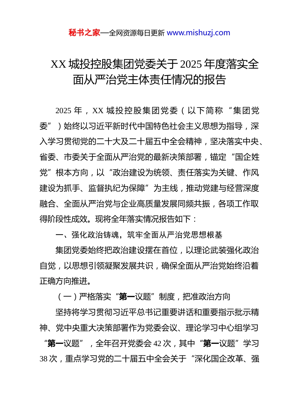 秘书之家—全网资源每日更新 www.mishuzj.comXX 城投控股集团党委关于 2025 年度落实全面从严治党主体责任情况的报告2025 年,XX 城投控股集团党委(以下简称 “集团党委”)始终以习近平新时代中国特色社会主义思想为指导,深入学习贯彻党的二十大及二十届五中全会精神,坚决落实中央、省委、市委关于全面从严治党的最新决策部署,锚定“国企姓党”根本方向,以“政治建设为统领、责任落实为关键、作风建设为抓手、监督执纪为保障”为主线,推动党建与经营深度融合、全面从严治党与企业高质量发展同频共振,各项工作取得阶段性成效。现将全年落实情况报告如下:一、强化政治铸魂,筑牢全面从严治党思想根基集团党委始终把政治建设摆在首位,以理论武装强化政治自觉,以思想引领凝聚发展共识,确保全面从严治党始终沿着正确方向推进。(一)严格落实“第一议题”制度,把准政治方向坚持将学习贯彻习近平总书记重要讲话和重要指示批示精神、党中央重大决策部署作为党委会议、理论学习中心组学习“第一议题”,全年召开党委会 42 次,其中“第一议题”学习38 次,重点学习党的二十届五中全会关于“深化国企改革、强秘书之家—全网资源每日更新 www.mishuzj.com化党建引领”的部署要求,以及习近平总书记关于城市建设、国资监管、全面从严治党的重要论述,做到“学思用贯通、知信行统一”。建立“第一议题”学习台账,明确责任部门、落实时限,实行“清单化管理、项目化推进”,全年完成中央、省委、市委部署任务落地 26 项,如推动“城市更新三年行动”“保障性住房建设”等重点任务纳入集团年度核心目标,以实际行动坚定拥护“两个确立”、坚决做到“两个维护”。(二)深化理论武装体系,夯实思想基础构建“党委领学、支部研学、党员自学”三级学习体系,推动理论学习走深走实。一是党委层面,组织理论学习中心组集中学习 22 次,邀请省委党校教授、市委宣讲团成员开展“党的二十届五中全会精神解读”“全面从严治党新形势新要求”等专题辅导 6 场,班子成员带头撰写学习心得 18 篇,其中 3 篇在《XX 日报》《国资党建》等刊物发表。二是支部层面,依托“周五培训日”制度,开展“党建+业务”融合培训 45 次,内容涵盖党建知识、工程管理、廉洁风险防控等,覆盖干部职工 2300 余人次;创新“线上+线下”学习模式,利用“学习强国”“灯塔-党建在线”平台开展常态化学习,集团党员平均学分位列市属国企前三。三是党员层面,开展“党员领学岗”活动,每位党员结合岗位职责分享学习感悟,全年组织“微党秘书之家—全网资源每日更新 www.mishuzj.com课”“业务讲堂”120 余场,推动理论学习从“被动听”变为“主动讲”,从“学理论”延伸到“干实事”。(三)压实意识形态责任,守好舆论阵地严格落实《党委意识形态工作责任制实施细则》,全年召开意识形态工作专题会议 4 次,排查意识形态风险点 12 个,制定防控措施 36 项。强化宣传阵地建设,升级集团网站“党建专栏”,优化微信公众号“清风城投”栏目,全年发布党建动态、廉洁资讯 280 余条;修订《<清风城投>季刊办刊规范》,新增“中央八项规定精神解读”“典型案例剖析”专栏,发行 4 期,覆盖各级子公司及合作单位;在省级以上媒体发表稿件 520 余篇,其中《人民日报》报道集团“城市更新党建联合体”模式,新华社专题聚焦“保障性住房建设中的党建力量”,进一步巩固壮大主流思想舆论。二、拧紧责任链条,构建全域覆盖的责任落实体系集团党委坚决扛起全面从严治党主体责任,以“制度完善责任分解、考核问效”为抓手,推动“党委抓、书记抓、班子抓、层层抓”的责任体系落地生根。(一)健全制度体系,明确责任边界结合 2025 年国企改革新要求,修订完善《党委会议事规则(2025 版)》《党委履行全面从严治党主体责任清单》,新增秘书之家—全网资源每日更新 www.mishuzj.com“落实中央八项规定精神监督责任”“子公司党建考核细则”等内容,进一步明确党委“把方向、管大局、保落实”的职责;制定《重大事项党委前置研究负面清单》,细化 18 类必须经党委研究讨论后提交董事会...