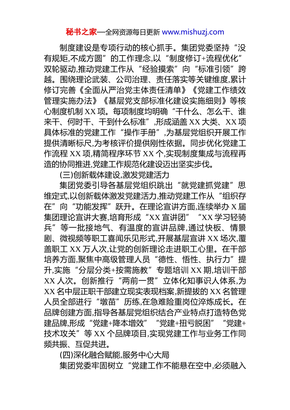秘书之家—全网资源每日更新 www.mishuzj.comXX 集团有限公司国企党建工作规范提升专项行动工作总结2025 年 6 月至 12 月,根据山西省国资委统一部署,XX 集团有限公司党委高标准开展国企党建工作规范提升专项行动。专项行动坚持党的领导、加强党的建设这一国有企业的“根”和“魂”,紧扣“抓党建从业务出发,抓业务从党建入手”的深层逻辑,以制度为基筑规范、以创新为翼谋突破、以融合为要促发展,推动全集团党建工作实现系统性提升。现将有关情况总结如下。一、基本情况专项行动开展以来,集团党委锚定目标任务,强化统筹谋划,推动党建工作在规范化、标准化、科学化水平上取得显著成效,为集团高质量发展注入强劲红色动能。(一)强化政治引领,筑牢思想根基集团党委始终把政治建设摆在首位,坚定不移用党的创新理论武装头脑、指导实践、推动工作。专项行动期间,集团及各级基层党组织全面修订“第一议题”制度,完善“学习研讨—推动落实—跟踪督办—回顾总结”全链条工作机制,确保习近平总书记重要讲话和重要指示批示精神第一时间学习传达、第一时间贯彻落实。党委理论学习中心组开展集中学习 XX 次,专题研讨 XX 次,形成高质量调研报告 XX篇。严格执行党委前置研究把关制度,对战略规划、干部任免、重大投资等“三重一大”事项进行全过程把关,确保党委“把方向、管大局、促落实”的领导作用充分发挥。创新推出党委会研究决策“五清单”运行机制,将党的领导精准嵌入公司治理各环节,实现决策程序规范化和决策效率提升的有机统一。(二)完善制度体系,夯实规范基础秘书之家—全网资源每日更新 www.mishuzj.com制度建设是专项行动的核心抓手。集团党委坚持“没有规矩,不成方圆”的工作理念,以“制度修订+流程优化”双轮驱动,推动党建工作从“经验摸索”向“标准引领”跨越。围绕理论武装、公司治理、责任落实等关键维度,累计修订完善《全面从严治党主体责任清单》《党建工作绩效管理实施办法》《基层党支部标准化建设实施细则》等核心制度机制 XX 项。每项制度均明确“干什么、怎么干、谁来干、何时干、干到什么标准”,形成涵盖 XX 大类、XX 项具体标准的党建工作“操作手册”,为基层党组织开展工作提供清晰标尺,为考核评价提供刚性依据。同步优化党建工作流程 XX 项,精简程序环节 XX 个,实现制度集成与流程再造的协同推进,党建工作规范化建设迈出坚实步伐。(三)创新载体建设,激发党建活力集团党委引导各基层党组织跳出“就党建抓党建”思维定式,以创新载体激发党建活力,推动党建工作从“组织存在”向“功能发挥”跃升。在理论宣讲方面,连续举办 X 届集团理论宣讲大赛,培育形成“XX 宣讲团”“XX 学习轻骑兵”等一批接地气、有温度的宣讲品牌,通过快板、情景剧、微视频等职工喜闻乐见形式,开展基层宣讲 XX 场次,覆盖职工 XX 万人次,让党的创新理论走进职工心里。在干部培养方面,聚焦中高级管理人员“德性、悟性、执行力”提升,实施“分层分类+按需施教”专题培训 XX 期,培训干部XX 人次。创新推行“两前一贯”立体化知事识人体系,为XX 名中层正职干部建立现实表现档案,新提拔的 XX 名管理人员全部进行“墩苗”历练,在急难险重岗位淬炼成长。在品牌创建方面,指导各基层党组织结合产业特点打造特色党建品牌,形成“党建+降本增效”“党建+扭亏脱困”“党建+技术攻关”等 XX 个品牌项目,实现党建工作与业务工作同频共振、互促共进。(四)深化融合赋能,服务中心大局集团党委牢固树立“党建工作不能悬在空中,必须融入秘书之家—全网资源每日更新 www.mishuzj.com生产经营毛细血管”的理念,以“党建赋能业务,业务检验党建”为导向,构建“责任共担、目标共融、成果共享”的党建与业务融合机制。按照区域相邻、产业相近、职能相关、优势互补原则,积极开展党建联建共建,集团所属 XX 单位党委与科研院所、上下游企业党组织建立联建关系 XX个,组建联合攻关团队 XX 个,在清洁能源、智能制造等领域取得突破性进展。充分发挥党支部战斗堡垒作用,聚焦改革发展、生产经营、扭亏减亏等重难点任务,各级党组织累计创建党建课题 XX 个、党建项目 XX 个,其中 XX 个项目...