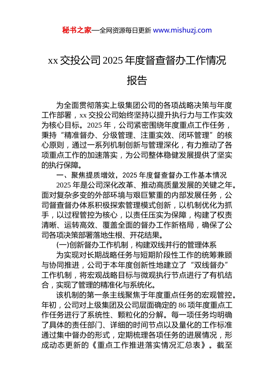 秘书之家—全网资源每日更新 www.mishuzj.comxx 交投公司 2025 年度督查督办工作情况报告为全面贯彻落实上级集团公司的各项战略决策与年度工作部署,xx 交投公司始终坚持以提升执行力与工作实效为核心目标。2025 年,公司紧密围绕年度重点工作任务,秉持“精准督办、分级管理、注重实效、闭环管理”的核心原则,通过一系列机制创新与管理深化,有力推动了各项重点工作的加速落实,为公司整体稳健发展提供了坚实的执行保障。一、聚焦提质增效,2025 年度督查督办工作基本情况2025 年是公司深化改革、推动高质量发展的关键之年。面对复杂多变的外部环境与艰巨繁重的内部发展任务,公司督查督办体系积极探索管理模式创新,以机制优化为抓手,以过程管控为核心,以责任压实为保障,构建了权责清晰、运转高效、覆盖全面的督办工作新格局,确保了公司各项决策部署落地生根、开花结果。(一)创新督办工作机制,构建双线并行的管理体系为实现对长期战略任务与短期阶段性工作的统筹兼顾与协同推进,公司于本年度创新性地建立了“双线督办”工作机制,将宏观战略目标与微观执行节点进行了有机结合,实现了管理的精准化与系统化。该机制的第一条主线聚焦于年度重点任务的宏观管控。年初,公司对上级集团及公司层面确定的 86 项年度重点工作任务进行了系统性、颗粒化的分解。每一项任务均明确了具体的责任部门、详细的时间节点以及量化的工作标准通过集中督办的形式,定期梳理各项任务的进展情况,形成动态更新的《重点工作推进落实情况汇总表》。截至秘书之家—全网资源每日更新 www.mishuzj.com2025 年 11 月底,86 项年度重点任务的序时进度完成率达到95.8%,其中 65 项任务已按计划完成或超额完成,18 项任务正按计划节点稳步推进,整体完成情况符合预期。该条线的管理确保了公司年度战略方向不偏离、核心目标不动摇。第二条主线则侧重于月度工作的专项督办与闭环管理。公司将每月工作例会审议确定及安排部署的事项,全部纳入专项督办范畴,并即时生成《月度专项工作督办清单》该清单严格实行“一月一汇总、一月一通报”制度,对各项工作的完成情况、存在问题及下一步计划进行公示,形成了任务明确、责任明确、时限明确的“三明确”闭环管理体系。此举有效解决了以往部分工作在传达部署后可能出现的跟踪不及时、落实不到位的问题,显著提升了日常工作的执行效率。年内,公司累计开展月度专项督办 7 次,共督办事项 153 项,已办结 148 项,办结率达到 96.7%,有力保障了公司日常运营的高效与顺畅。(二)强化过程精细管控,实施精准高效的周调度模式在“双线督办”的宏观框架基础上,为进一步提升管理的精度与响应速度,公司创新性地引入了重点专项工作周督办机制,将督办管理的颗粒度从“月”提升至“周”的层面,实现了对关键任务的实时跟踪与动态管理。该机制严格执行“一周一汇报、一周一督办”的工作模式。公司要求所有承担重点任务的责任部门和下属子(分)公司,必须建立内部的周工作闭环管理流程,并明确指定专人负责信息的收集与上报。通过标准化的周报模板,各单位需详细汇报工作进展、量化成果、遇到的困难以及需要协调支持的事项。督办部门对回收的信息进行汇总分析实现对工作进展的实时跟踪和对潜在问题的即时反馈。这种高频次的调度机制,确保了信息传递的通畅与决策响应的迅速。同时,周督办机制的覆盖范围实现了全面化与重点化秘书之家—全网资源每日更新 www.mishuzj.com的统一。不仅公司的年度生产经营任务、各项专项攻坚行动,还包括所有重大投资项目、重点工程建设的推进情况均被悉数纳入周督办的管理范围。例如,在 xx 高速公路改扩建项目中,通过周督办机制,项目管理部得以每周向公司汇报工程进度、资金使用情况及安全生产状况,公司层面则能够及时协调解决征地拆迁、材料供应等跨部门难题有效保障了项目按计划推进。截至目前,公司已常态化开展周督办 40 余次,确保了重点工作的全覆盖、无遗漏,为各项关键任务的顺利完成提供了强有力的过程保障。(三)层层压实主体责任,全面提升协同与执行效能督查督办工作的最终成效,取决于责任体系的...