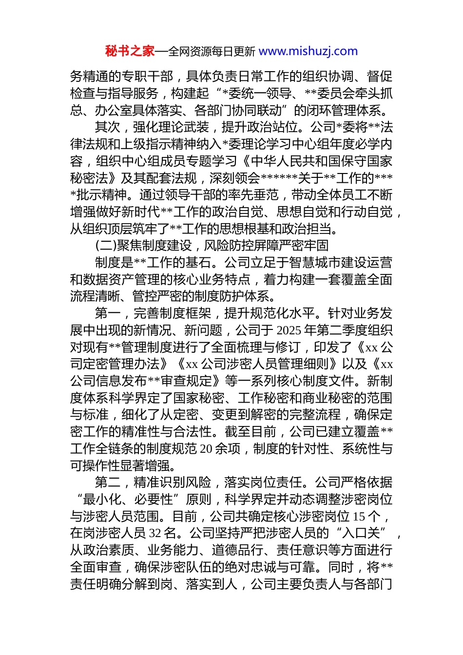 秘书之家—全网资源每日更新 www.mishuzj.comxx 市 xx 公司 2025 年度**工作情况报告为深入贯彻落实上级关于**工作的系列****精神,xx市 xx 公司始终将**工作作为维护企业安全与稳定发展的生命线,坚决扛起**工作的政治责任与主体责任。本年度,公司围绕高质量发展大局,坚持*管**原则,以系统化思维谋篇布局,以精细化管理狠抓落实,通过强化组织领导、健全制度体系、深化宣传教育及创新管理方式,扎实推进**工作走深走实,为公司的稳健运营和创新发展提供了坚实的安全保障。现将 2025 年度公司**工作开展情况、存在的问题及下一步工作打算报告如下。一、年度工作基本情况与主要成效2025 年是公司业务拓展与数据资产管理的关键之年,面对日益复杂严峻的内外部安全环境,公司始终保持高度警惕,将**工作贯穿于决策、执行和监督的全过程,实现了全年未发生失泄密事件的既定目标,**管理能力和全员**素养得到显著提升。(一)坚持高位统筹,组织领导体系坚强有力公司深刻认识到**工作的极端重要性,坚持*对**工作的绝对领导,确保其始终沿着正确的政治方向前进。首先,优化顶层设计,压实领导责任。公司*委严格履行*管**的主体责任,将**工作纳入年度重点工作计划,与业务工作同谋划、同部署、同检查、同考核。年初,公司即调整并充实了**工作委员会,由公司主要领导担任主任,分管领导担任副主任,各关键业务部门负责人为成员,形成了权责清晰、运转高效的领导核心。**委员会年内累计召开专题会议 4 次,定期听取**工作汇报,分析研判内外部安全形势,审议重大**事项,确保了各项决策部署的科学性与前瞻性。委员会下设办公室,配备了 2 名政治过硬、业秘书之家—全网资源每日更新 www.mishuzj.com务精通的专职干部,具体负责日常工作的组织协调、督促检查与指导服务,构建起“*委统一领导、**委员会牵头抓总、办公室具体落实、各部门协同联动”的闭环管理体系。其次,强化理论武装,提升政治站位。公司*委将**法律法规和上级指示精神纳入*委理论学习中心组年度必学内容,组织中心组成员专题学习《中华人民共和国保守国家秘密法》及其配套法规,深刻领会******关于**工作的****批示精神。通过领导干部的率先垂范,带动全体员工不断增强做好新时代**工作的政治自觉、思想自觉和行动自觉,从组织顶层筑牢了**工作的思想根基和政治担当。(二)聚焦制度建设,风险防控屏障严密牢固制度是**工作的基石。公司立足于智慧城市建设运营和数据资产管理的核心业务特点,着力构建一套覆盖全面流程清晰、管控严密的制度防护体系。第一,完善制度框架,提升规范化水平。针对业务发展中出现的新情况、新问题,公司于 2025 年第二季度组织对现有**管理制度进行了全面梳理与修订,印发了《xx 公司定密管理办法》《xx 公司涉密人员管理细则》以及《xx公司信息发布**审查规定》等一系列核心制度文件。新制度体系科学界定了国家秘密、工作秘密和商业秘密的范围与标准,细化了从定密、变更到解密的完整流程,确保定密工作的精准性与合法性。截至目前,公司已建立覆盖**工作全链条的制度规范 20 余项,制度的针对性、系统性与可操作性显著增强。第二,精准识别风险,落实岗位责任。公司严格依据“最小化、必要性”原则,科学界定并动态调整涉密岗位与涉密人员范围。目前,公司共确定核心涉密岗位 15 个,在岗涉密人员 32 名。公司坚持严把涉密人员的“入口关”,从政治素质、业务能力、道德品行、责任意识等方面进行全面审查,确保涉密队伍的绝对忠诚与可靠。同时,将**责任明确分解到岗、落实到人,公司主要负责人与各部门秘书之家—全网资源每日更新 www.mishuzj.com负责人、部门负责人与关键岗位员工逐级签订了《**责任书》与《**承诺书》,累计签订 98 份。通过这种方式,形成了一级抓一级、层层抓落实的责任闭环,有效推动了**责任由“纸面”要求转化为“岗位”行动。(三)深化宣教培训,全员**防线持续巩固公司坚持人是**工作的第一道防线,持续创新宣传教育形式,着力培育“人人知**、时时讲**、处处防泄密”的企业安全文化。一方面,拓展宣传载体,营造浓厚氛围。公司充分...