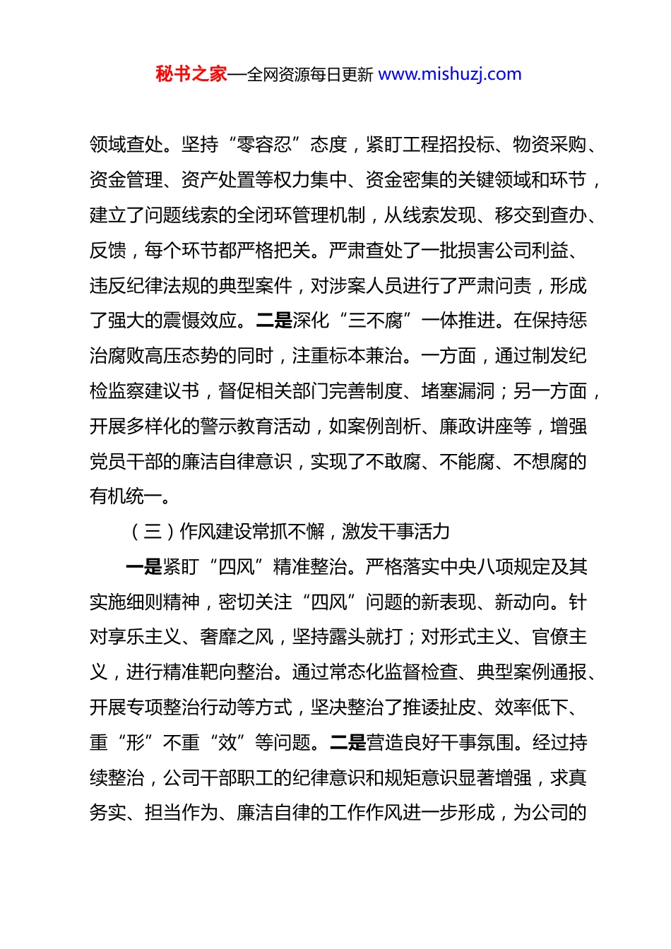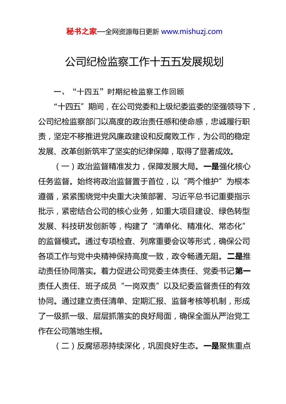 秘书之家—全网资源每日更新 www.mishuzj.com公司纪检监察工作十五五发展规划 一、“十四五”时期纪检监察工作回顾“十四五”期间,在公司党委和上级纪委监委的坚强领导下,公司纪检监察部门以高度的政治责任感和使命感,忠诚履行职责,坚定不移推进党风廉政建设和反腐败工作,为公司的稳定发展、改革创新筑牢了坚实的纪律保障,取得了显著成效。(一)政治监督精准发力,保障发展大局。一是强化核心任务监督。始终将政治监督置于首位,以“两个维护”为根本遵循,紧紧围绕党中央重大决策部署、习近平总书记重要指示批示,紧密结合公司的核心业务,如重大项目建设、绿色转型发展、科技研发创新等,构建了“清单化、精准化、常态化”的监督模式。通过专项检查、列席重要会议等形式,确保公司各项工作与党中央精神保持高度一致,政令畅通无阻。二是推动责任协同落实。着力促进公司党委主体责任、党委书记第一责任人责任、班子成员“一岗双责”以及纪委监督责任的有效协同。通过建立责任清单、定期汇报、监督考核等机制,形成了一级抓一级、层层抓落实的良好局面,确保全面从严治党工作在公司落地生根。(二)反腐惩恶持续深化,巩固良好生态。一是聚焦重点秘书之家—全网资源每日更新 www.mishuzj.com领域查处。坚持“零容忍”态度,紧盯工程招投标、物资采购、资金管理、资产处置等权力集中、资金密集的关键领域和环节,建立了问题线索的全闭环管理机制,从线索发现、移交到查办、反馈,每个环节都严格把关。严肃查处了一批损害公司利益、违反纪律法规的典型案件,对涉案人员进行了严肃问责,形成了强大的震慑效应。二是深化“三不腐”一体推进。在保持惩治腐败高压态势的同时,注重标本兼治。一方面,通过制发纪检监察建议书,督促相关部门完善制度、堵塞漏洞;另一方面,开展多样化的警示教育活动,如案例剖析、廉政讲座等,增强党员干部的廉洁自律意识,实现了不敢腐、不能腐、不想腐的有机统一。(三)作风建设常抓不懈,激发干事活力一是紧盯“四风”精准整治。严格落实中央八项规定及其实施细则精神,密切关注“四风”问题的新表现、新动向。针对享乐主义、奢靡之风,坚持露头就打;对形式主义、官僚主义,进行精准靶向整治。通过常态化监督检查、典型案例通报、开展专项整治行动等方式,坚决整治了推诿扯皮、效率低下、重“形”不重“效”等问题。二是营造良好干事氛围。经过持续整治,公司干部职工的纪律意识和规矩意识显著增强,求真务实、担当作为、廉洁自律的工作作风进一步形成,为公司的秘书之家—全网资源每日更新 www.mishuzj.com高质量发展营造了风清气正的良好环境。(四)监督体系不断完善,提升监督效能。一是构建“大监督”格局。积极探索构建协同高效的“大监督”体系,加强纪检监察监督与审计、财务、法务等监督力量的协作配合。通过建立联席会议制度、信息共享机制、联合监督检查等方式,实现了各类监督资源的有效整合和优势互补,形成了监督合力。二是延伸基层监督触角。加强对下属子公司的监督指导,通过派驻纪检专员、开展专项巡察等方式,将监督探头延伸到基层一线,实现了对公司各级党组织和关键岗位人员权力运行的全过程监督,监督的针对性和实效性得到显著提升。(五)队伍建设全面加强,锻造纪检铁军。一是优化队伍结构。按照“三转”要求,聚焦主责主业,通过公开招聘、内部选拔、交流轮岗等方式,选拔了一批政治素质高、业务能力强的干部充实到纪检监察队伍中,优化了队伍的年龄、知识和专业结构。二是提升专业素养。常态化开展政治理论学习、业务培训和案例研讨活动,组织干部参加上级纪委监委的跟班学习和业务竞赛,不断提高纪检监察干部的政治站位和业务水平。同时,加强内部管理,完善制度机制,强化纪律约束,打造了一支忠诚干净担当的纪检监察铁军。二、“十五五”时期面临的形势与挑战秘书之家—全网资源每日更新 www.mishuzj.com“十五五”时期是公司实现战略转型、高质量发展的关键阶段,也是纪检监察工作面临新机遇和新挑战的重要时期。(一)外部环境带来的挑战。一是政策要求更严。党中央对全面从严治党的要求不断提高,对国有企...