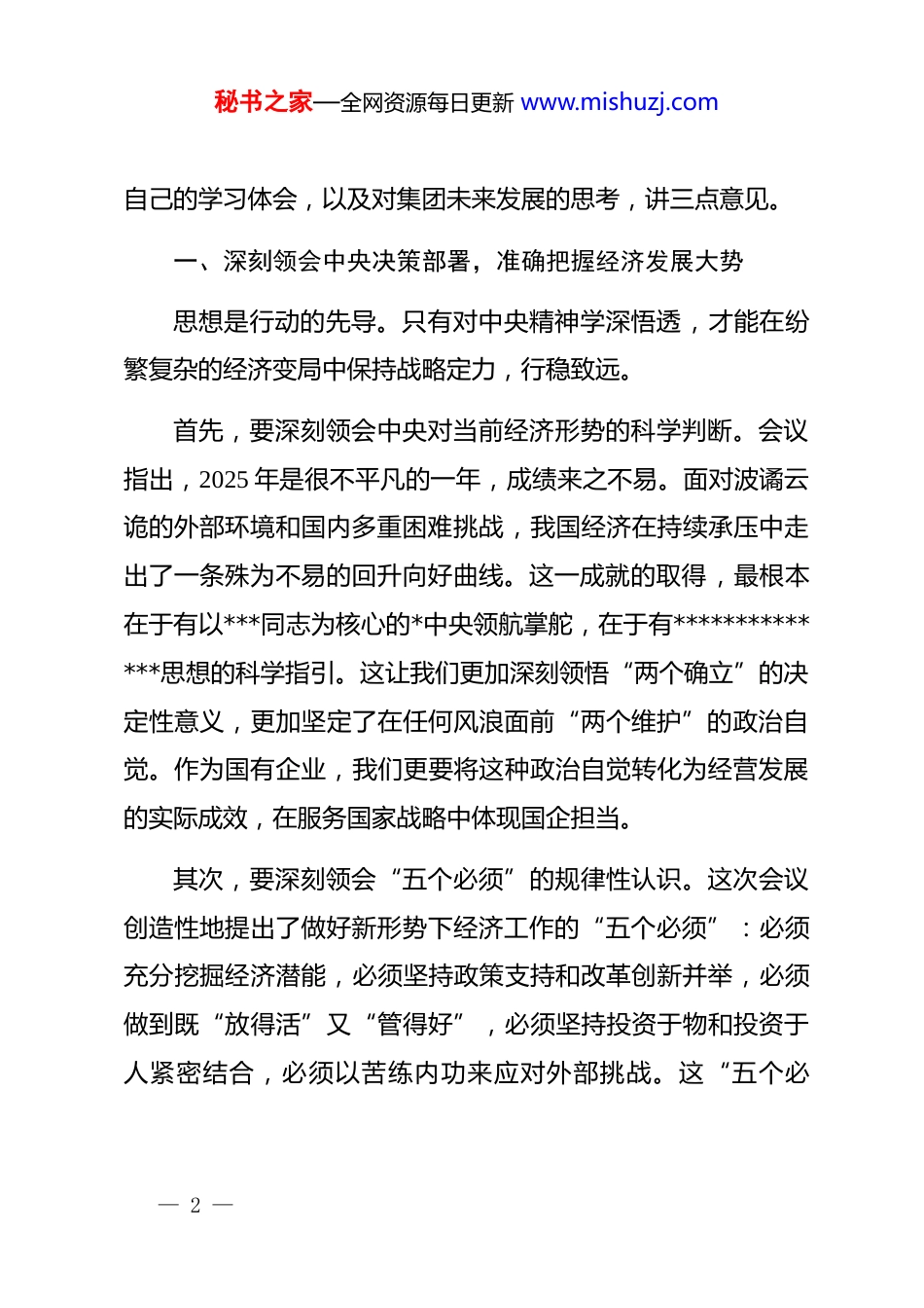 秘书之家—全网资源每日更新 www.mishuzj.com在 xx 集团传达 2025 年中央经济工作会议精神会议上的总结讲话同志们:今天,我们召开这次重要会议,主要任务是深入传达学习、全面贯彻落实刚刚闭幕的 2025 年中央经济工作会议精神。这次中央经济工作会议,是在*的二十届四中全会之后召开的一次关键会议,意义重大,影响深远。******在会上的重要讲话,全面总结了 2025 年经济工作的非凡历程与来之不易的成绩,深入剖析了当前国内外经济形势的深刻变化,系统部署了 2026 年经济工作的总体要求、政策取向和重点任务。这为我们做好明年乃至“十五五”时期的经济工作,提供了思想指引、行动指南和根本遵循。集团上下必须清醒认识到,2026 年是实施“十五五”规划的开局之年,也是我们集团在新的发展阶段迎接挑战、抢抓机遇、实现跨越的关键之年。将中央的顶层设计与集团的经营实际紧密结合,把宏观的政策红利转化为微观的发展动能,是我们当前最重要、最紧迫的政治任务和经济任务。下面,我结合— 1 —秘书之家—全网资源每日更新 www.mishuzj.com自己的学习体会,以及对集团未来发展的思考,讲三点意见。一、深刻领会中央决策部署,准确把握经济发展大势思想是行动的先导。只有对中央精神学深悟透,才能在纷繁复杂的经济变局中保持战略定力,行稳致远。首先,要深刻领会中央对当前经济形势的科学判断。会议指出,2025 年是很不平凡的一年,成绩来之不易。面对波谲云诡的外部环境和国内多重困难挑战,我国经济在持续承压中走出了一条殊为不易的回升向好曲线。这一成就的取得,最根本在于有以***同志为核心的*中央领航掌舵,在于有**************思想的科学指引。这让我们更加深刻领悟“两个确立”的决定性意义,更加坚定了在任何风浪面前“两个维护”的政治自觉。作为国有企业,我们更要将这种政治自觉转化为经营发展的实际成效,在服务国家战略中体现国企担当。其次,要深刻领会“五个必须”的规律性认识。这次会议创造性地提出了做好新形势下经济工作的“五个必须”:必须充分挖掘经济潜能,必须坚持政策支持和改革创新并举,必须做到既“放得活”又“管得好”,必须坚持投资于物和投资于人紧密结合,必须以苦练内功来应对外部挑战。这“五个必— 2 —秘书之家—全网资源每日更新 www.mishuzj.com须”是*中央在深刻总结实践经验基础上得出的宝贵认识,进一步丰富和发展了***经济思想,是我们应对未来一切不确定性的方法论和认识论。对我们集团而言,“挖掘潜能”就是要深耕存量市场、开拓增量空间;“政策与改革并举”就是要用好国家政策,深化内部改革;“放活管好”就是要激发一线活力,守住安全底线;“投资于物和人”就是要升级硬件设施,更要赋能员工成长;“苦练内功”就是要在服务、管理、创新等各环节追求卓越,打造核心竞争力。最后,要深刻领会明年经济工作的总体要求和政策取向。会议明确,明年要坚持稳中求进、以进促稳、先立后破。宏观政策取向上,将实施更加积极有为的财政政策和适度宽松的货币政策。“更加积极有为”的财政政策,预示着财政赤字率可能适度提高,超长期特别国债和地方政府专项债的发行使用力度将会加大这些资金将重点投向国家重大战略实施和重点领域安全能力建设。而“适度宽松”的货币政策,则意味着降准降息等工具将灵活高效运用,以促进社会综合融资成本稳中有降,为实体经济提供更为充裕的流动性支持。这些强烈的政策信号,特别是将“大力提振消费、提高投资效益,全方位扩大国内需求”置于明年经济工作的首要任务对于我们身处的商业零售和— 3 —秘书之家—全网资源每日更新 www.mishuzj.com服务行业,无疑是巨大的政策东风和发展机遇。二、全面对标 xx 市战略部署,在服务大局中找准定位中央的决策是总纲,地方的部署是蓝图。我们集团身处 xx市,必须将自身发展深度融入 xx 市的战略规划之中,同频共振,同向发力。12 月 12 日,xx 市委常委会召开扩大会议,第一时间传达学习中央经济工作会议精神,并对我市的贯彻落实工作作出了全面部署。会议强调,要科学谋划好明年经济社会发展目标任务,使其与“十五五”目标相...