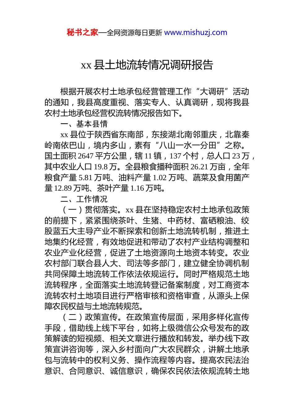 秘书之家—全网资源每日更新 www.mishuzj.comxx 县土地流转情况调研报告根据开展农村土地承包经营管理工作“大调研”活动的通知,我县高度重视、落实专人、认真调研,现将我县农村土地承包经营权流转情况报告如下。一、基本县情xx 县位于陕西省东南部,东接湖北南邻重庆,北靠秦岭南依巴山,境内多山,素有“八山一水一分田”之称。国土面积 2647 平方公里,辖 11 镇,137 个村,总人口 23 万,其中农业人口 19.8 万。全县粮食播种面积 26.21 万亩,全年粮食产量 5.81 万吨、油料产量 1.02 万吨、蔬菜及食用菌产量 12.89 万吨、茶叶产量 1.16 万吨。二、工作情况(一)贯彻落实。xx 县在坚持稳定农村土地承包政策的前提下,紧紧围绕茶叶、生猪、中药材、富硒粮油、绞股蓝五大主导产业不断探索和创新土地流转机制,推进土地集约化经营,有效地促进和带动了农村产业结构调整和农业产业化经营,促进了土地资源向土地资本转变。农业农村部门联合县人大、司法等多部门,建立健全协调机制共同保障土地流转工作依法依规运行。同时严格规范土地流转程序,全面落实土地流转登记备案制度,对工商资本流转农村土地项目进行严格审核和资格审查,从源头上保障农民权益与土地流转规范。(二)政策宣传。在政策宣传层面,采用多样化宣传手段,借助线上线下平台,如将上级微信公众号发布的政策解读的短视频、相关文章进行播放和转发。举办线下政策宣讲咨询等,深入乡村面向广大农民群众,讲解土地承包与流转中的权利义务、操作流程等内容。提高农民法治意识、合同意识、诚信意识,确保农民依法依规流转土地秘书之家—全网资源每日更新 www.mishuzj.com切实推动各项政策落地落细见效,助力农业农村高质量发展。(三)建立机制。我县依托全国农村土地流转台账信息平台,建立土地流转合同信息备案工作机制。在全县范围内对所有农村土地流转合同进行集中梳理并将合同信息在土地流转台账信息平台录入备案。运用平台数据指导承包地流转管理工作,发挥土地流转合同预警提示和农村土地流转舆情监测功能,定期化解土地流转存在问题,及早指导镇村化解存在风险。三、流转现状(一)土地流转概况。截至 2024 年底,我县通过土地流转台账信息平台录入流转面积 70780.32 亩,完成合同备案 3370 份,备案流转面积 59932.35 亩,其中流转用于粮食种植面积 7644.96 亩。流转总金额 xx 亿元,涉及工商企业62 家,平均流转单价 190.5 元/亩/年。平均流转年限 18 年,具体期限由流转双方根据产业生产周期和土地承包期限确定。(二)按照流转方式来看。流转形式主要有出租和入股,其中已备案出租合同 2875 份,占合同总份数 85%,出租面积共计 55233 亩,入股形式合同 495 份占合同总份数17%,入股面积共计 4699.3 亩。从产业看,一般像茶叶、绞股蓝、水果、蔬菜、食用菌、中药材种植和畜牧养殖等产值较高、见效较快的产业多通过出租来流转土地获得土地经营的全部决定权,像生长期较长的中药材种植、比较效益较低的粮油种植等产业多通过入股形式流转土地采取合作共赢;从流入方来看,年产值较大、规模较大的比如茶、畜类农业经营主体都是通过出租的方式流转土地,像粮油种植合作社、农机社会化服务合作社、自然人等主体通过入股方式流转土地。(三)按照流入方类型来看。流入到农业企业面积28948.14 亩占备案总面积 48%,其中出租 28633.14 亩,入秘书之家—全网资源每日更新 www.mishuzj.com股 31.5 亩;流入到农民专业合作社面积 26533.03 亩占备案总面积 44%,其中出租 22147.23 亩,入股 4385.8 亩;流入到家庭农场的土地面积 921.26 亩占备案总面积 2%,均为出租;流入到村集体经济面积 1617.7 亩占备案总面积 3%,均为出租;流入到自然人面积 1913.21 亩占备案总面积 3%,均为出租。(四)按照流转后用途来看。茶业作为我县主导产业流转土地面积 22927.1 亩占备案总面积 38%;富硒粮油流转土地面积 7435 亩占备案总面积 12%;畜牧产业流转土地面积 563.58 亩占备案总面积 1%;中药材产业流转土地面积20193.78 亩占备案总面积...