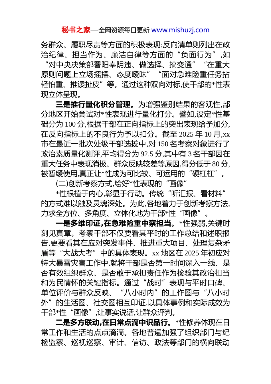 秘书之家—全网资源每日更新 www.mishuzj.com关于在选人用人中加强*性鉴别的探索与建议*性是*员干部立身、立业、立言、立德的基石。在干部选拔任用工作中,如何精准鉴别、科学评价干部的*性,确保“德才兼备、以德为先”的原则落到实处,是新时代*的组织路线赋予组织部门的重大课题。近年来,xx 省 xx 市 xx 县等地在实践中积极探索,围绕政治忠诚、政治定力、政治担当、政治能力、政治自律等核心要素,初步构建起一套旨在考准考实干部*性的方法论体系。本文旨在总结提炼当前的有益做法,分析存在的问题与挑战,并就如何进一步健全和完善选人用人中的*性鉴别机制提出对策建议。一、主要做法与成效为破解*性“看不见、摸不着、难衡量”的困境,各地积极探索,通过明确标准、创新方法、压实责任,推动*性鉴别从“软指标”向“硬约束”转变,取得了一系列积极成效。(一)锚定核心内涵,构建*性鉴别的“标尺”*性鉴别,首在“鉴什么”。各地普遍认识到,必须将抽象的*性要求转化为可观察、可衡量、可检验的具体标准。一是细化“五看”标准。依据《领导干部政治素质考察办法(试行)》提出的“看政治忠诚、看政治定力、看政治担当、看政治能力、看政治自律”的“五看”要求,各地普遍将其作为*性鉴别的核心框架。xx 县等地在此基础上,进一步将每个“看”细化为若干具体考察点,形成了涵盖 20 个方面的政治素质考察要点,使*性标准更加清晰具体。二是建立正反向测评体系。为防止评价的“一面倒”和“脸谱化”,探索建立了“正向激励”与“反向约束”相结合的测评机制。正向清单主要衡量干部在理想信念、服秘书之家—全网资源每日更新 www.mishuzj.com务群众、履职尽责等方面的积极表现;反向清单则列出在政治纪律、担当作为、廉洁自律等方面的“负面行为”,如“对中央决策部署阳奉阴违、做选择、搞变通”“在重大原则问题上立场摇摆、态度暧昧”“面对急难险重任务拈轻怕重、推诿扯皮”等。通过这种双向对标,使干部的*性表现立体呈现。三是推行量化积分管理。为增强鉴别结果的客观性,部分地区开始尝试对*性表现进行量化打分。譬如,设定*性基础分为 100 分,根据干部在正向指标上的突出表现给予加分,在反向指标上的不良行为予以扣分。截至 2025 年 10 月,xx市在最近一批次处级干部选拔中,对 150 名考察对象进行了政治素质量化测评,平均得分为 92.5 分,其中有 3 名干部因在重大任务中表现消极、群众反映较差等原因,得分低于 80 分,被暂缓使用,真正让*性成为可比较、可运用的“硬杠杠”。(二)创新考察方式,绘好*性表现的“画像”*性根植于内心,彰显于行动。传统“听汇报、看材料”的方式难以触及灵魂深处。为此,各地着力于创新考察方法,力求全方位、多角度、立体化地为干部*性“画像”。一是多维印证,在急难险重中察担当。*性强弱,关键时刻见真章。考察干部不仅要看其平时的工作总结和述职报告,更要看其在应对突发事件、推进重大项目、处理复杂矛盾等“大战大考”中的具体表现。xx 地区在 2025 年初应对特大暴雪灾害工作中,就将干部是否第一时间深入一线、是否有效组织群众、是否敢于承担责任作为检验其政治担当和为民情怀的关键指标。通过“战时”表现与平时口碑、单位评价与群众反映、“八小时内”的工作圈与“八小时外”的生活圈、社交圈相互印证,以具体事例和实际成效为干部*性“画像”,让事实说话,让群众评判。二是多方联动,在日常点滴中识品行。*性修养体现在日常工作和生活的点点滴滴。各地普遍加强了组织部门与纪检监察、巡视巡察、审计、信访、政法等部门的横向联动秘书之家—全网资源每日更新 www.mishuzj.com在干部动议和考察环节,全面征求上述部门的意见,将被考察对象置于“探照灯”和“显微镜”下。建立干部政治表现信息库,将巡视巡察反馈、信访举报核查、审计发现问题、年度考核评价、民主生活会对照检查等信息动态归集,形成干部的“*性档案”。坚持“首关不过,余关莫论”,凡在政治上存在硬伤的,一律挡在门外,确保选拔出来的干部政治上靠得住。三是多点了解,在深入谈话中辨真伪。谈话是考察干部的基本功,但必须谈深谈透。考察谈话不再局限于简单的“优缺点”询问,而是结合...