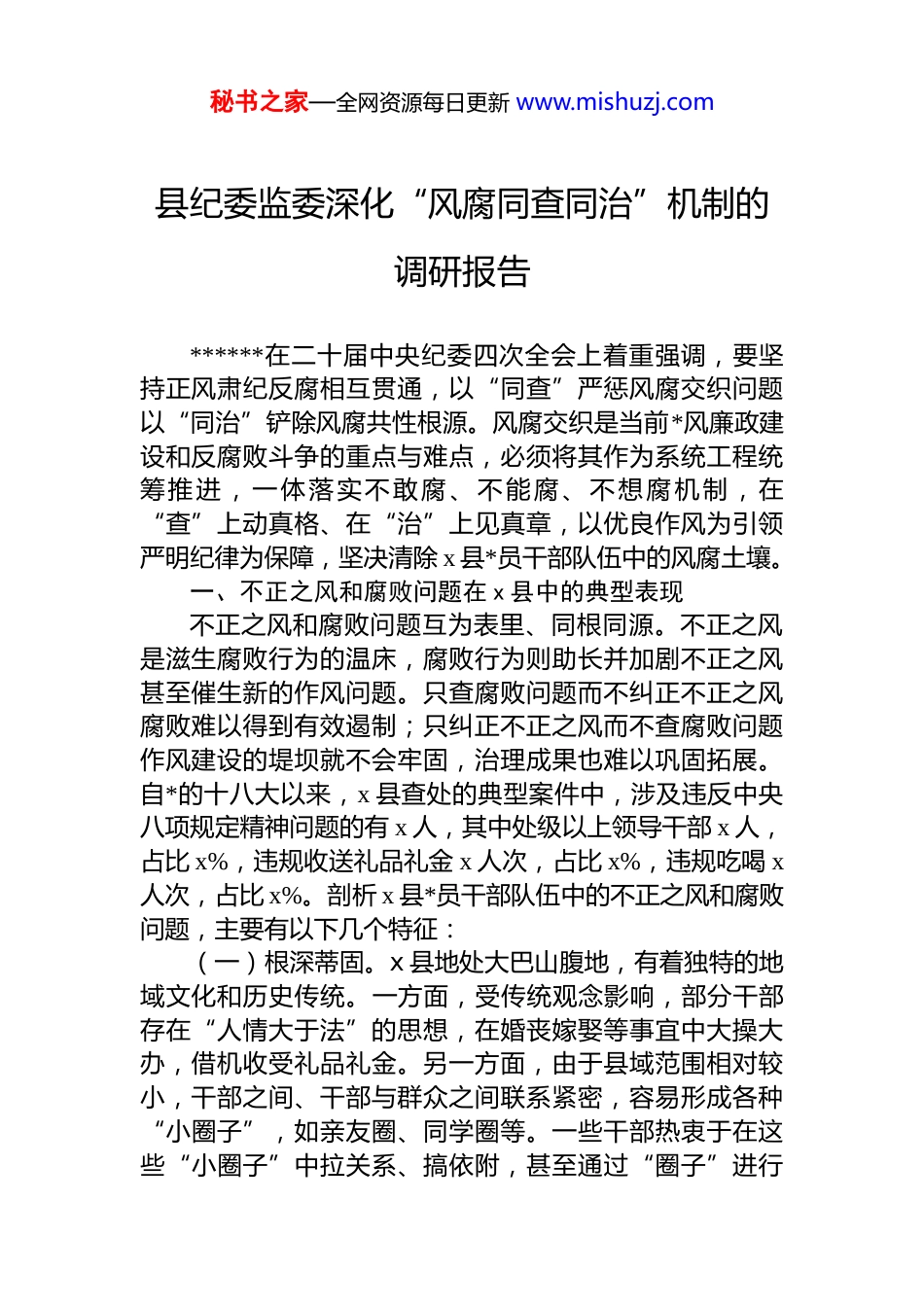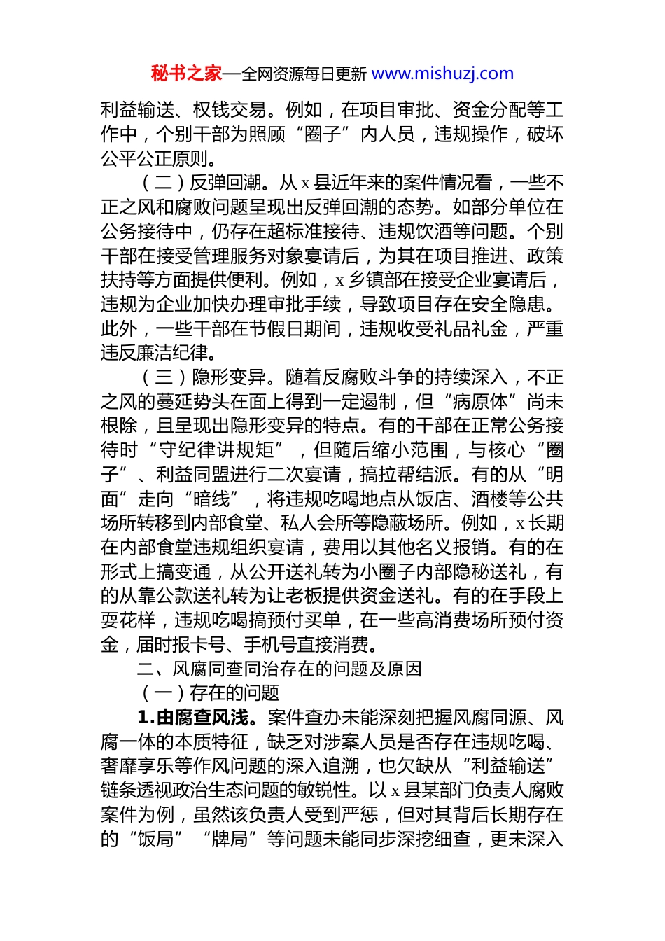 秘书之家—全网资源每日更新 www.mishuzj.com县纪委监委深化“风腐同查同治”机制的调研报告******在二十届中央纪委四次全会上着重强调,要坚持正风肃纪反腐相互贯通,以“同查”严惩风腐交织问题以“同治”铲除风腐共性根源。风腐交织是当前*风廉政建设和反腐败斗争的重点与难点,必须将其作为系统工程统筹推进,一体落实不敢腐、不能腐、不想腐机制,在“查”上动真格、在“治”上见真章,以优良作风为引领严明纪律为保障,坚决清除 x 县*员干部队伍中的风腐土壤。一、不正之风和腐败问题在 x 县中的典型表现不正之风和腐败问题互为表里、同根同源。不正之风是滋生腐败行为的温床,腐败行为则助长并加剧不正之风甚至催生新的作风问题。只查腐败问题而不纠正不正之风腐败难以得到有效遏制;只纠正不正之风而不查腐败问题作风建设的堤坝就不会牢固,治理成果也难以巩固拓展。自*的十八大以来,x 县查处的典型案件中,涉及违反中央八项规定精神问题的有 x 人,其中处级以上领导干部 x 人,占比 x%,违规收送礼品礼金 x 人次,占比 x%,违规吃喝 x人次,占比 x%。剖析 x 县*员干部队伍中的不正之风和腐败问题,主要有以下几个特征:(一)根深蒂固。x 县地处大巴山腹地,有着独特的地域文化和历史传统。一方面,受传统观念影响,部分干部存在“人情大于法”的思想,在婚丧嫁娶等事宜中大操大办,借机收受礼品礼金。另一方面,由于县域范围相对较小,干部之间、干部与群众之间联系紧密,容易形成各种“小圈子”,如亲友圈、同学圈等。一些干部热衷于在这些“小圈子”中拉关系、搞依附,甚至通过“圈子”进行秘书之家—全网资源每日更新 www.mishuzj.com利益输送、权钱交易。例如,在项目审批、资金分配等工作中,个别干部为照顾“圈子”内人员,违规操作,破坏公平公正原则。(二)反弹回潮。从 x 县近年来的案件情况看,一些不正之风和腐败问题呈现出反弹回潮的态势。如部分单位在公务接待中,仍存在超标准接待、违规饮酒等问题。个别干部在接受管理服务对象宴请后,为其在项目推进、政策扶持等方面提供便利。例如,x 乡镇部在接受企业宴请后,违规为企业加快办理审批手续,导致项目存在安全隐患。此外,一些干部在节假日期间,违规收受礼品礼金,严重违反廉洁纪律。(三)隐形变异。随着反腐败斗争的持续深入,不正之风的蔓延势头在面上得到一定遏制,但“病原体”尚未根除,且呈现出隐形变异的特点。有的干部在正常公务接待时“守纪律讲规矩”,但随后缩小范围,与核心“圈子”、利益同盟进行二次宴请,搞拉帮结派。有的从“明面”走向“暗线”,将违规吃喝地点从饭店、酒楼等公共场所转移到内部食堂、私人会所等隐蔽场所。例如,x 长期在内部食堂违规组织宴请,费用以其他名义报销。有的在形式上搞变通,从公开送礼转为小圈子内部隐秘送礼,有的从靠公款送礼转为让老板提供资金送礼。有的在手段上耍花样,违规吃喝搞预付买单,在一些高消费场所预付资金,届时报卡号、手机号直接消费。二、风腐同查同治存在的问题及原因(一)存在的问题1.由腐查风浅。案件查办未能深刻把握风腐同源、风腐一体的本质特征,缺乏对涉案人员是否存在违规吃喝、奢靡享乐等作风问题的深入追溯,也欠缺从“利益输送”链条透视政治生态问题的敏锐性。以 x 县某部门负责人腐败案件为例,虽然该负责人受到严惩,但对其背后长期存在的“饭局”“牌局”等问题未能同步深挖细查,更未深入秘书之家—全网资源每日更新 www.mishuzj.com分析作风乱象对政治生态造成的破坏影响。这客观上助长了一些干部的侥幸心理,使其误将“一餐饭、一条烟、一瓶酒”等作风问题视为“小事小节”,对“围猎腐蚀”失去警觉警惕,也为后续类似违纪违法行为提供了滋生土壤。2.由风查腐难。不正之风看似“小事小节”,实则背后可能牵涉利益输送、权钱交易,但因手段隐蔽、证据零散,查证定性困难。例如,在项目招标过程中,存在“量身定制”参数的情况,表面是违纪,实则可能暗藏腐败。这类问题需抽丝剥茧、深挖细查,但因手段有限、力量不足、技术支持薄弱等因素,难以突破表象、查清实质。在 x县某项目...